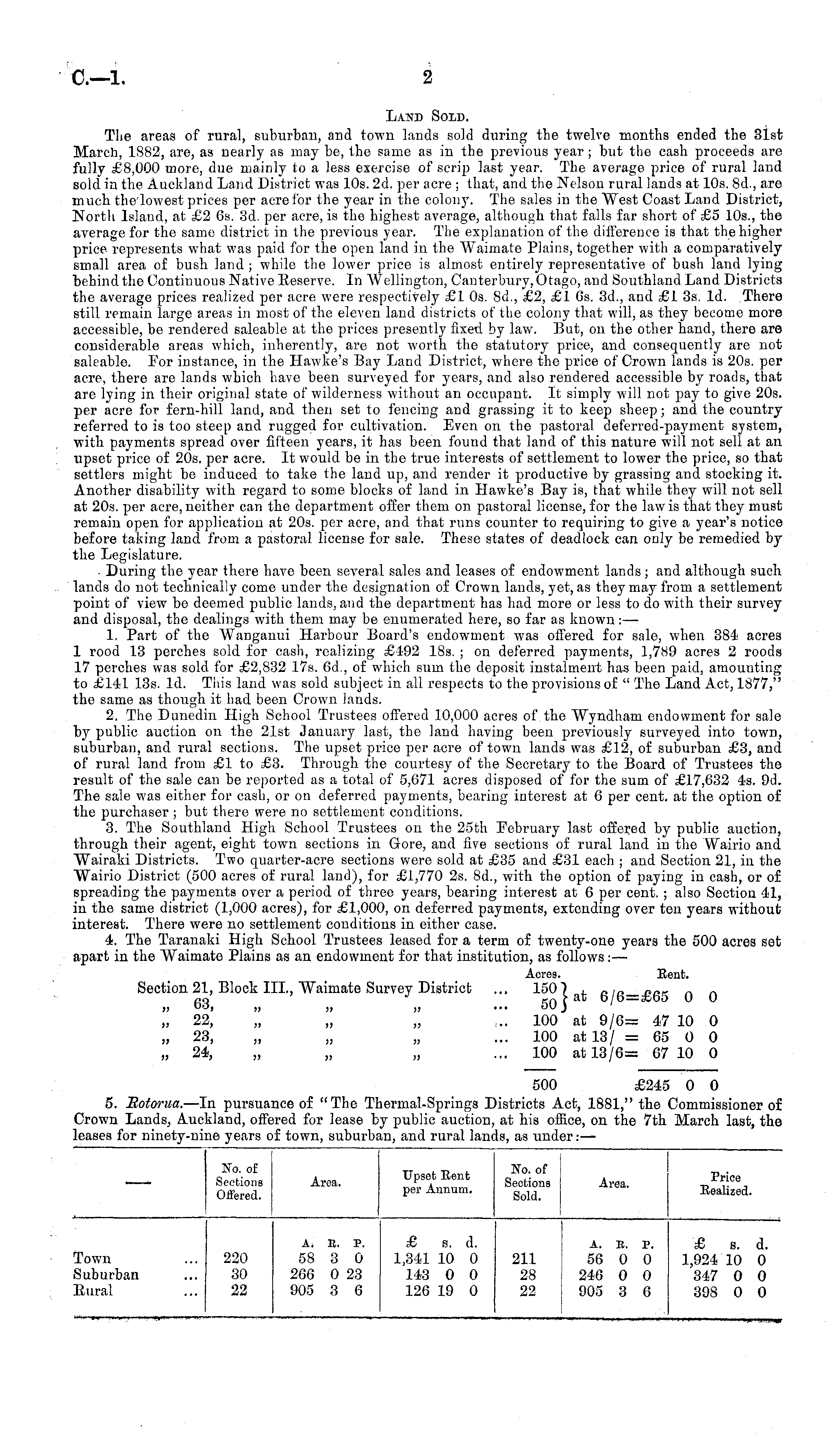 The areas of rural, suburban, and town lands gold during the twelve months ended the 31sfc March, ISB2, are, as nearly as may be, the same as in the previous year ; but the casli proceeds are fully £8,000 more, due mainly to a less exercise of scrip last year. The average price of rural land sold in the Auckland Land District was 10s. 2d. per acre ; that, and the Nelson rural lands at 10s. Bd., are much, the'lowest prices per acre for the year in the colony. The sales in the "West Coast Land District, North Island, at £2 Gs. 3d. per acre, is the highest average, although that falls far short of £5 10s., the average for the same district in the previous year. The explanation of the difference is that the higher price represents what was paid for the open land in the Waimate Plains, together with a comparatively small area of bush land ; while the lower price is almost entirely representative of bush land lying behind the Continuous Native Reserve. In Wellington, Canterbury, Otago, and Southland Land Districts the average prices realized per acre were respectively £1 os. Bd., £2, £1 6s. 3d., and £1 3s. Id. .There still remain large areas in most of the eleven land districts of the colony that will, as they become more accessible, be rendered saleable at the prices presently fixed by law. But, on the other hand, there are considerable areas which, inherently, are not worth the statutory price, and consequently are not saleable. For instance, in the Hawke's Bay Land District, where the price of Crown lands is 20s. per acre, there are lands which have been surveyed for years, and also rendered accessible by roads, that are lying in their original state of wilderness without an occupant. It simply will not pay to give 20s. per acre for fern-hill land, and then set to fencing and grassing it to keep sheep; and the country referred to is too steep and rugged for cultivation. Even on the pastoral deferred-payment system, with payments spread over fifteen years, it has been found that land of this nature will not sell at an upset price of 20s. per acre. It would be in the true interests of settlement to lower the price, so that settlers might be induced to take the land up, and render it productive by grassing and stocking it. Another disability with regard to some blocks of land in Hawke's Bay is, that while they will not sell at 20s. per acre, neither can the department offer them on pastoral license, for the law is that they must remain open for application at 20s. per acre, and that runs counter to requiring to give a year's notice before taking land from a pastoral license for sale. These states of deadlock can only be remedied by the Legislature. • During the year there have been several sales and leases of endowment lands ; and although such lands do not technically come under the designation of Crown lands, yet, as they may from a settlement point of view be deemed public lands, and the department has had more or less to do with their survey and disposal, the dealings with them may be enumerated here, so far as known: — 1. Part of the Wanganui Harbour Board's endowment was offered for sale, when 384 acres 1 rood 13 perches sold for cash, realizing £492 18s. ; on deferred payments, 1,789 acres 2 roods 17 perches was sold for £2,832 17s. 6d., of which sum the deposit instalment has been paid, amounting to £141 13s. Id. This land was sold subject in all respects to the provisions of " The Land Act, 1877," the same as though it had been Crown lands. 2. The Dunedin High School Trustees offered 10,000 acres of the Wyndham endowment for sale by public auction on the 21st January last, the land having been previously surveyed into town, suburban, and rural sections. The upset price per acre of town lands was £12, of suburban £3, and of rural land from £1 to £3. Through the courtesy of the Secretary to the Board of Trustees the result of the sale can be reported as a total of 5,671 acres disposed of for the sum of £17,632 4s. 9d. The sale was either for cash, or on deferred payments, bearing interest at 6 per cent, at the option of the purchaser ; but there were no settlement conditions. 3. The Southland High School Trustees on the 25th February last offered by public auction, through their agent, eight town sections in Gore, and five sections of rural land in the Wairio and "Wairaki Districts. Two quarter-acre sections were sold at £35 and £31 each ; and Section 21, in the "Wairio District (500 acres of rural land), for £1,770 2s. Bd., with the option of paying in cash, or of spreading the payments over a period of three years, bearing interest at 6 per cent. ; also Section 41, in the same district (1,000 acres), for £1,000, on deferred payments, extending over ten years ■without interest. There were no settlement conditions in either case. 4. The Taranaki High School Trustees leased for a term of twenty-one years the 500 acres set apart in the Waimate Plains as an endowment for that institution, as follows :— Acres. Kent. Section 21, Block 111., Waimate Survey District ~, 150 7 ± r>ir- r>^r n nn J m [at 6/6=£65 0 0 „ 63, „ „ „ ... 50 j ' „ 22, „ „ „ ... 100 at 9/6= 47 10 0 „ 23, „ „ „ ... 100 at 13/ = 65 0 0 „ 24, „ „ „ ... 100 at 13/6= 67 10 0 500 £245 0 0 5. Rotorua. —ln pursuance of "The Thermal-Springs Districts Act, 1881," the Commissioner of Crown Lands, Auckland, offered for lease by public auction, at his office, on the 7th March last, the leases for ninety-nine years of town, suburban, and rural lands, as under:—