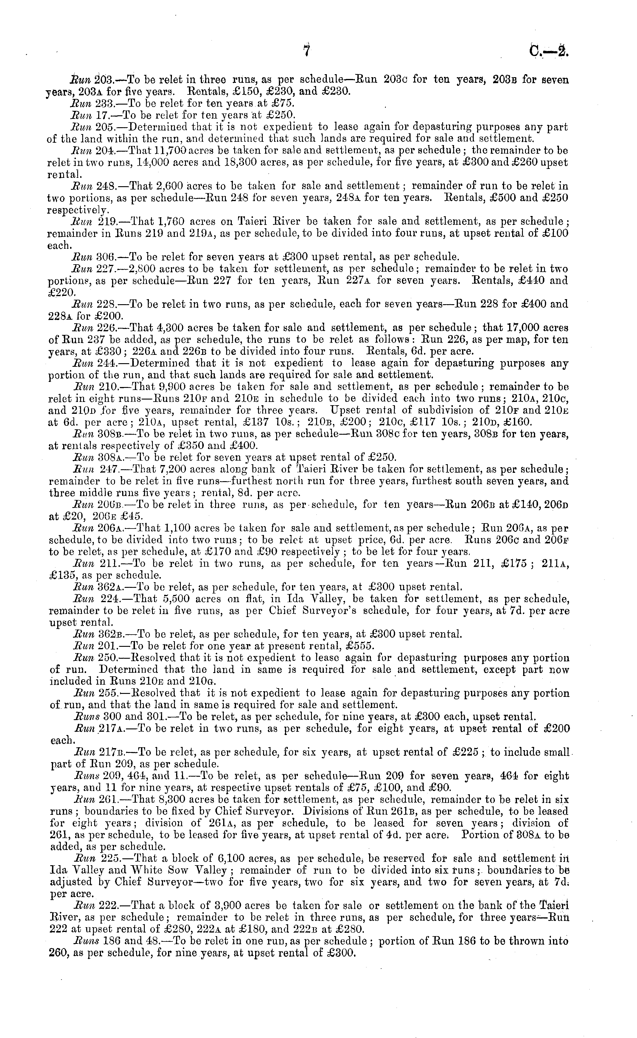 Bun 203.—T0 be relet in three runs, as per schedule—Run 203 c for ten years, 203b for seven years, 203 a for five years. Rentals, £150, £230, and £230. Bun 233.—T0 be relet for ten years at £75. Bun 17. —To be relet for ten years at £250. Bun 205.—Determined that it is not expedient to lease again for depasturing purposes any part of the land within the run, and determined that such lands are required for sale and settlement. Bun 204. —That 11,700 acres be taken for sale and settlement, as per schedule ; the remainder to be relet in two runs, 14,000 acres and 18,300 acres, as per schedule, for five years, at £300 and £260 upset rental. Bun 248.—That 2,600 acres to be taken for sale and settlement; remainder of run to be relefc in two portions, as per schedule—Run 248 for seven years, 248 a for ten years. Rentals, £500 and £250 respectively. Bun 219.—That 1,760 acres on Taieri River be taken for sale and settlement, as per schedule; remainder in Runs 219 and 219 a, as per schedule, to be divided into four runs, at upset rental of £100 each. Bun 306.—T0 be relet for seven years at £300 upset rental, as per schedule. Bun 227. —2,800 acres to be taken for settlement, as per schedule; remainder to be relet in two portion?, as per schedule —Run 227 for ten years, Run 227 a for seven years. Rentals, £440 and £220. Bun 228.—T0 be relet in two runs, as per schedule, each for seven years—Run 228 for £400 and 228 a for £200. Bun 226.—That 4,300 acres be taken for sale and settlement, as per schedule ; that 17,000 acres of Run 237 be added, as per schedule, the runs to be relet as follows : Run 226, as per map, for ten years, at £330; 226 a and 226b to be divided into four runs. Rentals, 6d. per acre. Bun 244.—Determined that it is not expedient to lease again for depasturing purposes any portion of the run, and that such lands are required for sale and settlement. Bun 210.—That 9,900 acres be taken for sale and settlement, as per schedule ; remainder to be relet in eight runs —Runs 210f and 210e in schedule to be divided each into two runs; 210 a, 210 c, and 210 d .for five years, remainder for three years. Upset rental of subdivision of 210f and 210e at 6d. per acre; 210 a, upset rental, £137 10s.; 210b, £200; 210 c, £117 10s.; 210 d, £160. Bun 308b.- —To be relet in two runs, as per schedule —Run 308 c for ten years, 308b for ten years, at rentals respectively of £350 and £400. Bun 308 a be relet for seven years at upset rental of £250. Bun 247.' —That 7,200 acres along bank of Taieri River be taken for settlement, as per schedule; remainder to be relet in five runs —furthest north run for three years, furthest south seven years, and three middle runs five years ; rental, Bd. per acre. Bun 206b.' —To be relet in three runs, as per schedule, for ten years—Run 206b at £140, 206 d at £20, 200e £45. Bun 206a.—That 1,100 acres be taken for sale and settlement, as per schedule ; Run 20Sa, as per schedule, to be divided into two runs; to be relet at upset price, 6d. per acre. Runs 206 c and 206f to be relet, as per schedule, at £170 and £90 respectively ; to be let for four years. Bun 211.—T0 be relet in two runs, as per schedule, for ten years —Run 211, £175 ; 211 a, £135, as per schedule. Bun 362 a. be relet, as per schedule, for ten years, at £300 upset rental. Bun 224.—That 5,500 acres on flat, in Ida Valley, be taken for settlement, as per schedule, remainder to be relet in five runs, as per Chief Surveyor's schedule, for four years, at 7d. per acre upset rental. Bun 362b. —To be relet, as per schedule, for ten years, at £300 upset rental. Bun 201.—T0 be relet for one year at present rental, £555. Bun 250. —Resolved that it is not expedient to lease again for depasturing purposes any portion of run. Determined that the land in same is required for sale and settlement, except part now included in Runs 210b and 210&. Bun 255.'—Resolved that it is not expedient to lease again for depasturing purposes any portion of. run, and that the land in same is required for sale and settlement. Buns 300 and 301.—T0 be relet, as per schedule, for nine years, at £300 each, upset rental. Bun 217a.—T0 be relet in two runs, as per schedule, for eight years, at upset rental of £200 each. Bun 217b. —To be relet, as per schedule, for six years, at upset rental of £225 ; to include small part of Run 209, as per schedule. Buns 209, 464, and 11. —To be relet, as per schedule—Run 209 for seven years, 464 for eight years, and 11 for nine years, at respective upset rentals of £75, £100, and £90. Bun 261. —That 8,300 acres be taken for settlement, as per schedule, remainder to be relet in six runs ; boundaries to be fixed by Chief Surveyor. Divisions of Run 261b, as per schedule, to be leased for eight years; division of 261 a, as per schedule, to be leased for seven years; division of 261, as per schedule, to be leased for five years, at upset rental of 4d. per acre. Portion of 808 a to be added, as per schedule. Bun 225.—That a block of 6,100 acres, as per schedule^ be reserved for sale and settlement in Ida Valley and White Sow Valley; remainder of run to be divided into six runs; boundaries to be adjusted by Chief Surveyor—two for five years, two for six years, and two for seven years, at 7d; per acre. Bun 222.—That a block of 3,900 acres be taken for sale or settlement on the bank of the Taieri River, as per schedule; remainder to be relet in three runs, as per schedule, for three years—Run 222 at upset rental of £280, 222 a at £180, and 222b at £280. Buns 186 and 48. —To be relet in one run, as per schedule ; portion of Run 186 to be thrown into 260, as per schedule, for nine years, at upset rental of £300,