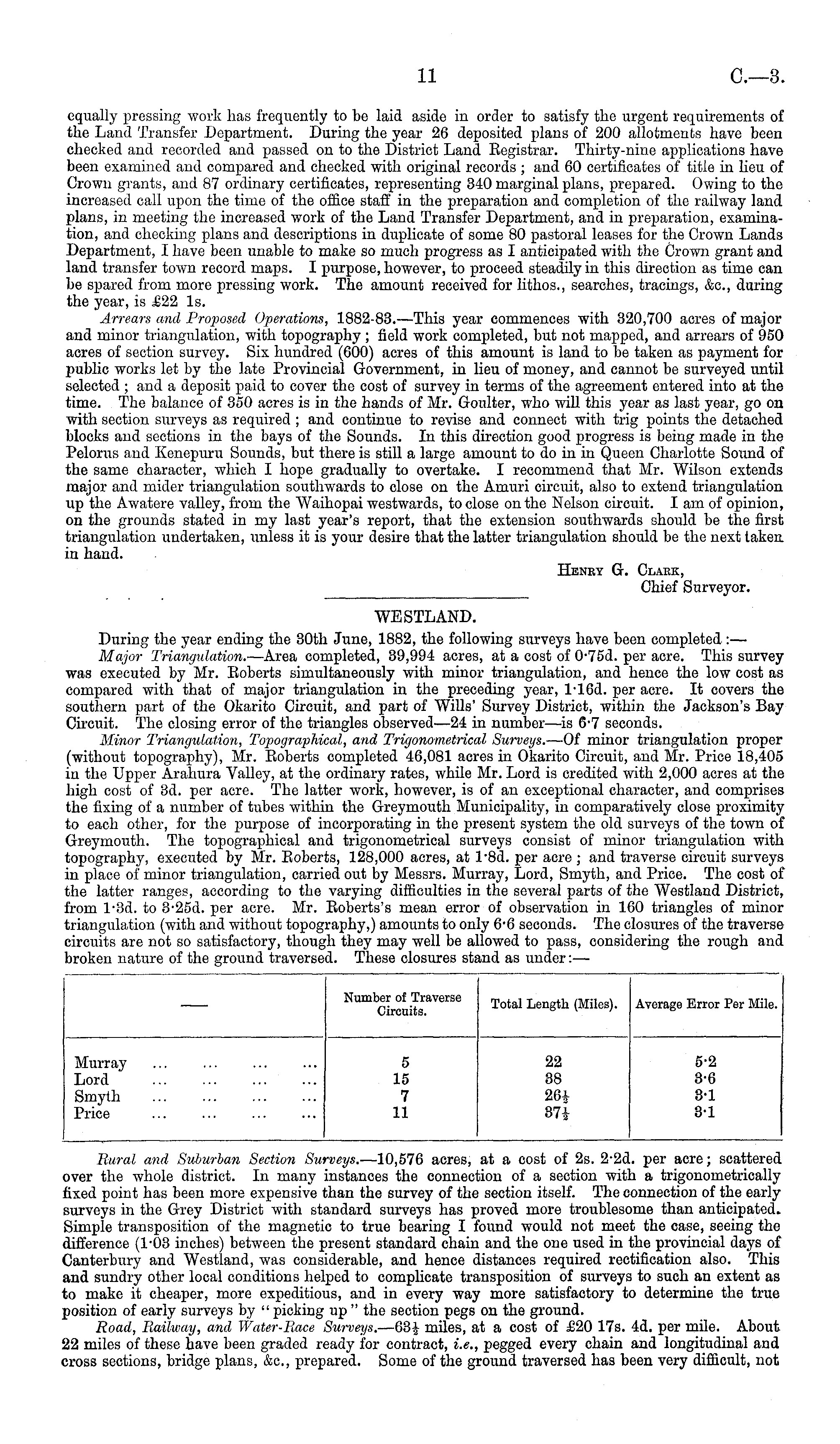 equally pressing work has frequently to be laid aside in order to satisfy the urgent requirements of the Land Transfer Department. During the year 26 deposited plans of 200 allotments have been checked and recorded and passed on to the District Land Registrar. Thirty-nine applications have been examined and compared and checked with original records ; and 60 certificates of title in lieu of Crown grants, and 87 ordinary certificates, representing 340 marginal plans, prepared. Owing to the increased call upon the time of the office staff in the preparation and completion of the railway land plans, in meeting the increased work of the Land Transfer Department, and in preparation, examination, and checking plans and descriptions in duplicate of some 80 pastoral leases for the Crown Lands Department, I have been unable to make so much progress as I anticipated with the Crown grant and land transfer town record maps. I purpose, however, to proceed steadily in this direction as time can be spared from more pressing work. The amount received for lithos., searches, tracings, &c, during the year, is £22 Is. Arrears and Proposed Operations, 1882-83.—This year commences with 320,700 acres of major and minor triangulation, with topography ; field work completed, but not mapped, and arrears of 950 acres of section survey. Six hundred (600) acres of this amount is land to be taken as payment for public works let by the late Provincial Government, in lieu of money, and cannot be surveyed until selected ; and a deposit paid to cover the cost of survey in terms of the agreement entered into at the time. The balance of 350 acres is in the hands of Mr. Goulter, who will this year as last year, go on with section surveys as required ; and continue to revise and connect with trig points the detached blocks and sections in the bays of the Sounds. In this direction good progress is being made in the Pelorus and Kenepuru Sounds, but there is still a large amount to do in in Queen Charlotte Sound of the same character, which I hope gradually to overtake. I recommend that Mr. Wilson extends major and mider triangulation southwards to close on the Amuri circuit, also to extend triangulation up the Awatere valley, from the Waihopai westwards, to close on the Nelson circuit. lam of opinion, on the grounds stated in my last year's report, that the extension southwards should be the first triangulation undertaken, unless it is your desire that the latter triangulation should be the next taken in hand. Henry G. Clark, Chief Surveyor.