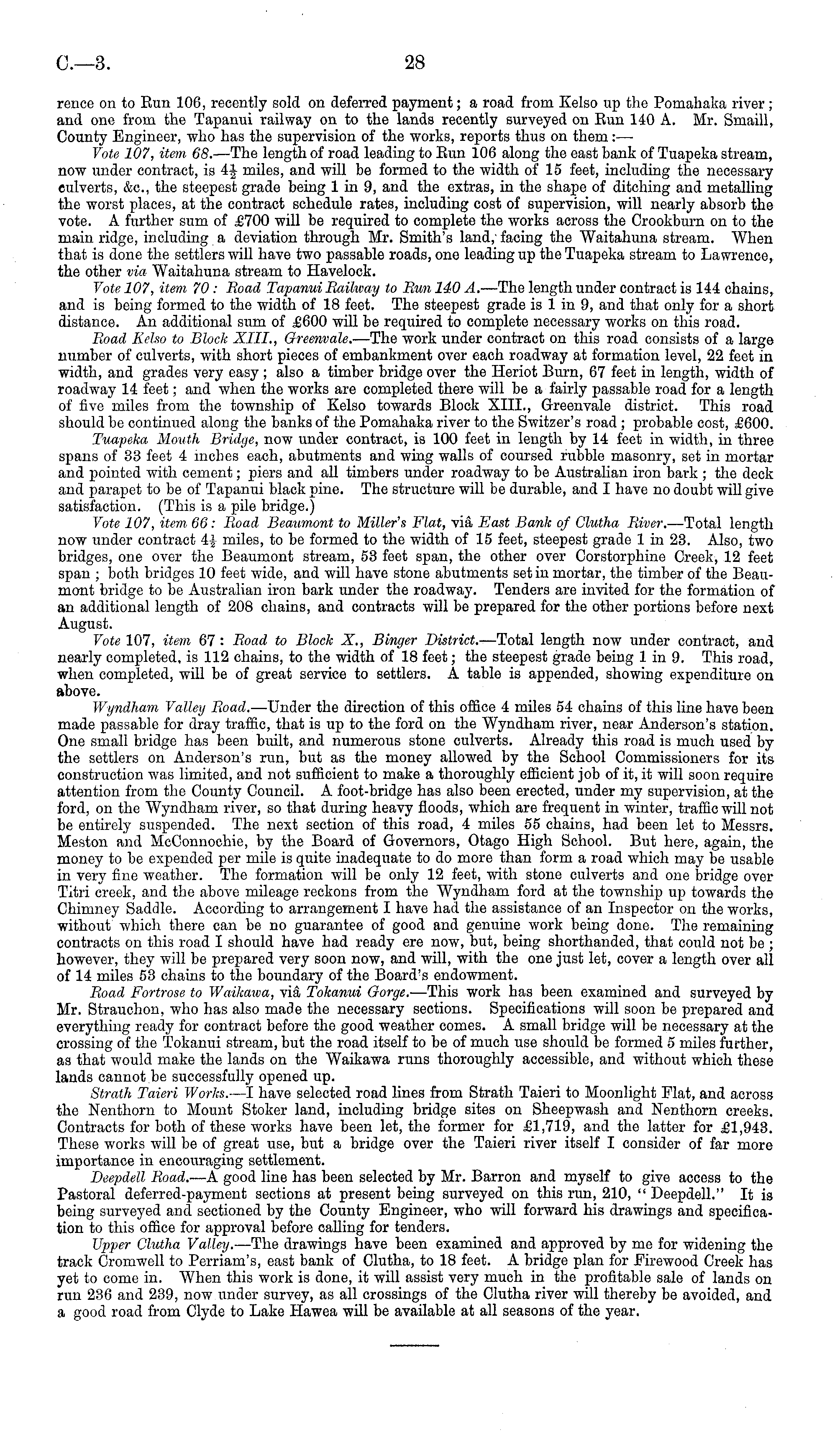 rence on to Run 106, recently sold on deferred payment; a road from Kelso up the Pomahaka river; and one from the Tapanui railway on to the lands recently surveyed on Run 140 A. Mr. Smaill, County Engineer, who has the supervision of the works, reports thus on them:— Vote 107, item 68. —The length of road leading to Run 106 along the east bank of Tuapeka stream, now under contract, is 4J miles, and will be formed to the width of 15 feet, including the necessary culverts, &c, the steepest grade being 1 in 9, and the extras, in the shape of ditching and metalling the worst places, at the contract schedule rates, including cost of supervision, will nearly absorb the vote. A further sum of £700 will be required to complete the works across the Crookburn on to the main ridge, including a deviation through Mr. Smith's land, facing the Waitahuna stream. When that is done the settlers will have two passable roads, one leading up the Tuapeka stream to Lawrence, the other via Waitahuna stream to Havelock. Vote 107, item 70 : Road Tapanui Railway to Run 140 A.— The length under contract is 144 chains, and is being formed to the width of 18 feet. The steepest grade is lin 9, and that only for a short distance. An additional sum of £600 will be required to complete necessary works on this road. Road Kelso to Block XIII., Greenvale. —The work under contract on this road consists of a large number of culverts, with short pieces of embankment over each roadway at formation level, 22 feet in width, and grades very easy ; also a timber bridge over the Heriot Burn, 67 feet in length, width of roadway 14 feet; and when the works are completed there will be a fairly passable road for a length of five miles from the township of Kelso towards Block XIII., Greenvale district. This road should be continued along the banks of the Pomahaka river to the Switzer's road; probable cost, £600. Tuapeka Mouth Bridge, now under contract, is 100 feet in length by 14 feet in width, in three spans of 33 feet 4 inches each, abutments and wing walls of coursed rubble masonry, set in mortar and pointed with cement; piers and all timbers under roadway to be Australian iron bark ; the deck and parapet to be of Tapanui black pine. The structure will be durable, and I have no doubt will give satisfaction. (This is a pile bridge.) Vote 107, item 66: Boad Beaumont to Miller's Flat, via East Bank of Clutha River. —Total length now under contract miles, to be formed to the width of 15 feet, steepest grade lin 23. Also, two bridges, one over the Beaumont stream, 53 feet span, the other over Corstorphine Creek, 12 feet span ; both bridges 10 feet wide, and will have stone abutments set in mortar, the timber of the Beaumont bridge to be Australian iron bark under the roadway. Tenders are invited for the formation of an additional length of 208 chains, and contracts will be prepared for the other portions before next August. Vote 107, item 67: Boad to Block X., Binyer District. —Total length now under contract, and nearly completed, is 112 chains, to the width of 18 feet; the steepest grade being lin 9. This road, when completed, will be of great service to settlers. A table is appended, showing expenditure on above. Wyndham Valley Boad. —Under the direction of this office 4 miles 54 chains of this line have been made passable for dray traffic, that is up to the ford on the Wyndham river, near Anderson's station. One small bridge has been built, and numerous stone culverts. Already this road is much used by the settlers on Anderson's run, but as the money allowed by the School Commissioners for its construction was limited, and not sufficient to make a thoroughly efficient job of it, it will soon require attention from the County Council. A foot-bridge has also been erected, under my supervision, at the ford, on the Wyndham river, so that during heavy floods, which are frequent in winter, traffic will not be entirely suspended. The next section of this road, 4 miles 55 chains, had been let to Messrs. Meston and McConnochie, by the Board of Governors, Otago High School. But here, again, the money to be expended per mile is quite inadequate to do more than form a road which may be usable in very fine weather. The formation will be only 12 feet, with stone culverts and one bridge over Titri creek, and the above mileage reckons from the Wyndham ford at the township up towards the Chimney Saddle. According to arrangement I have had. the assistance of an Inspector on the works, without which there can be no guarantee of good and genuine work being done. The remaining contracts on this road I should have had ready ere now, but, being shorthanded, that could not be ; however, they will be prepared very soon now, and will, with the one just let, cover a length over all of 14 miles 53 chains to the boundary of the Board's endowment. Boad Fortrose to Waikawa, viS, Tokanui Gorge. —This work has been examined and surveyed by Mr. Strauchon, who has also made the necessary sections. Specifications will soon be prepared and everything ready for contract before the good weather comes. A small bridge will be necessary at the crossing of the Tokanui stream, but the road itself to be of much use should be formed 5 miles further, as that would make the lands on the Waikawa runs thoroughly accessible, and without which these lands cannot be successfully opened up. Strath Taieri Works. —I have selected road lines from Strath Taieri to Moonlight Flat, and across the Nenthorn to Mount Stoker land, including bridge sites on Sheepwash and Nenthorn creeks. Contracts for both of these works have been let, the former for £1,719, and the latter for £1,943. These works will be of great use, but a bridge over the Taieri river itself I consider of far more importance in encouraging settlement. Deepdell Boad. —A good line has been selected by Mr. Barron and myself to give access to the Pastoral deferred-payment sections at present being surveyed on 