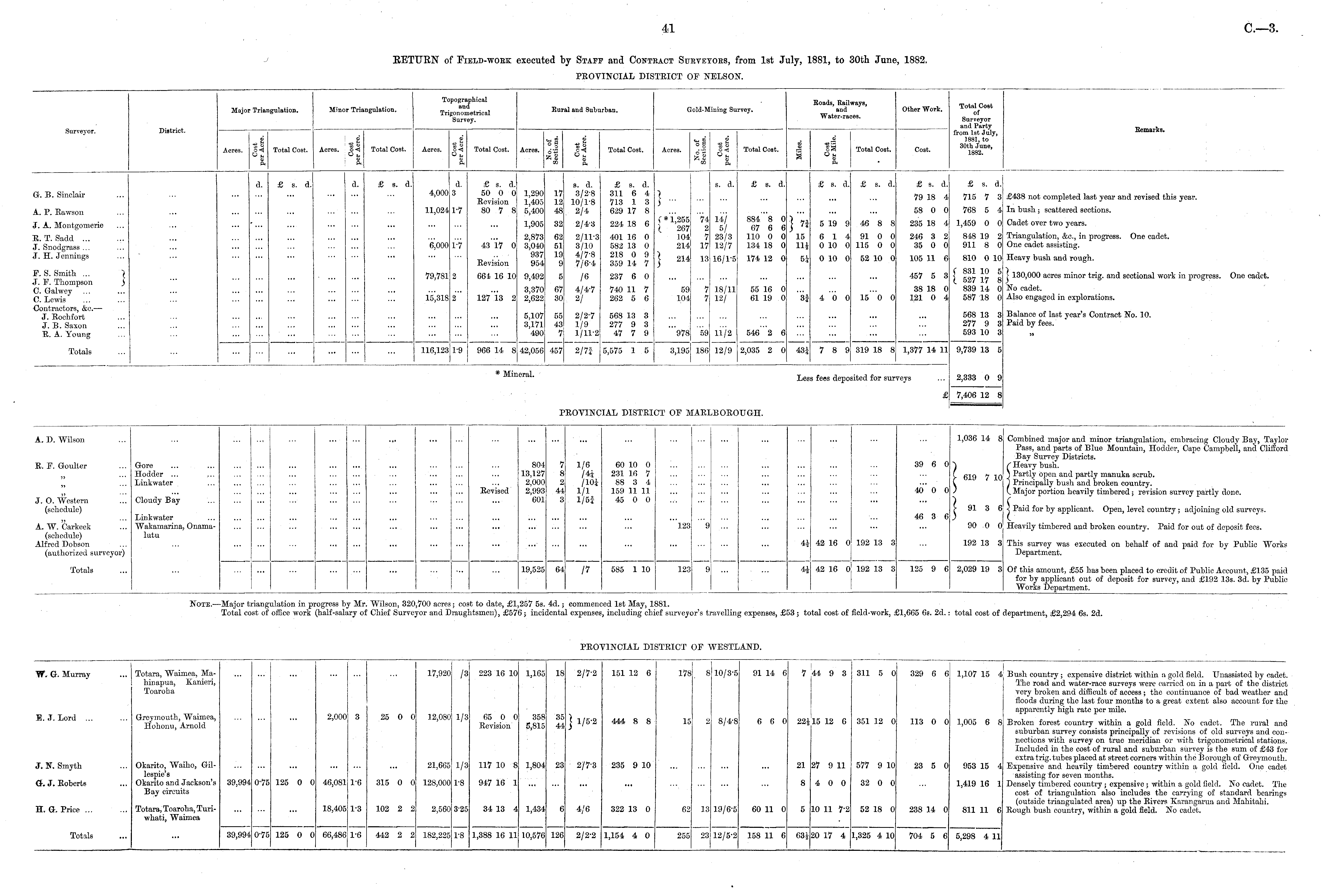 RETURN of Field-work executed by Staff and Contract Surveyors, from 1st July, 1881, to 30th June, 1882. PROVINCIAL DISTRICT OF NELSON.