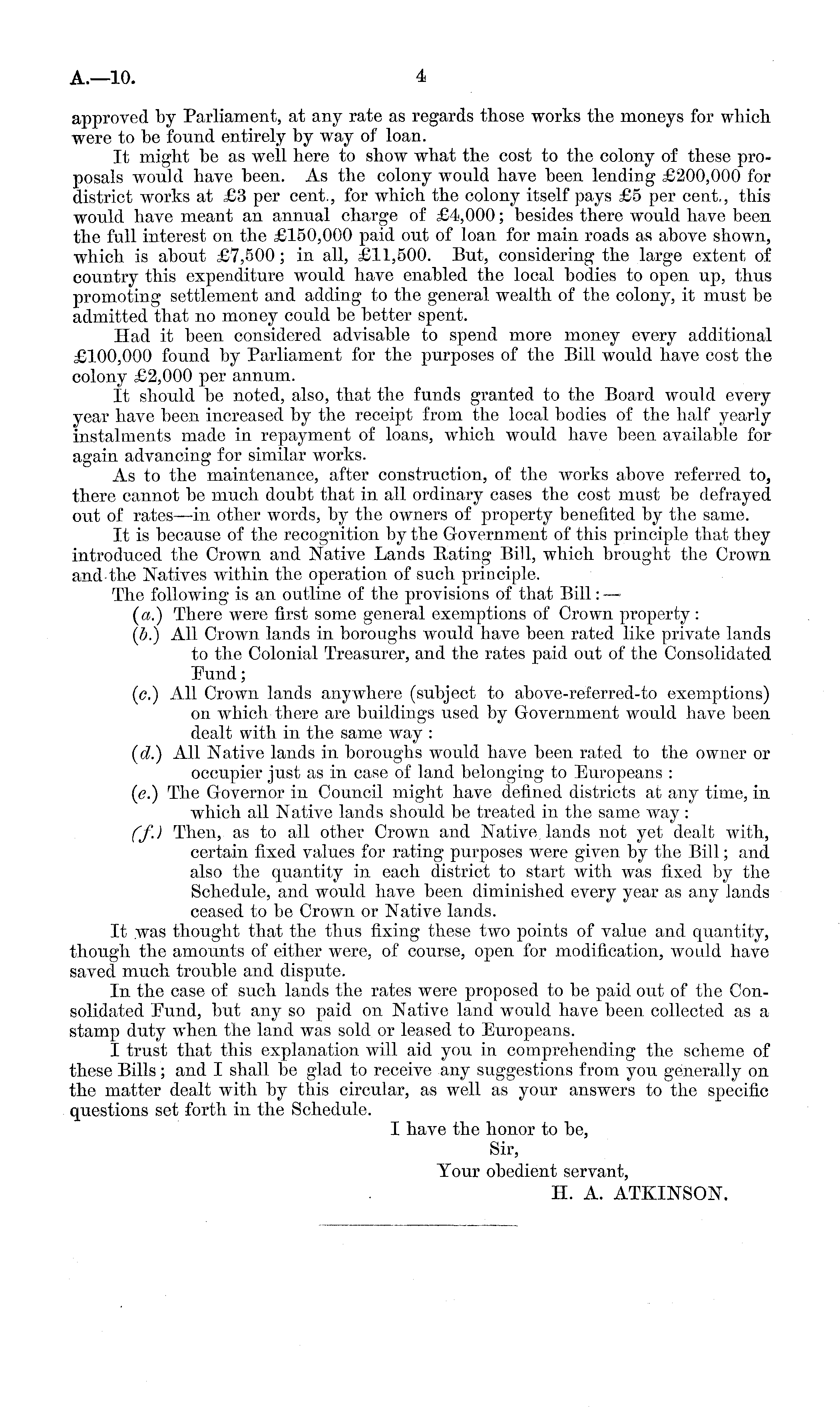 approved by Parliament, at any rate as regards those works the moneys for which were to be found entirely by way of loan. It might be as well here to show what the cost to the colony of these proposals would have been. As the colony would have been lending £200,000 for district works at £3 per cent., for which the colony itself pays £5 per cent., this would have meant an annual charge of £4,000; besides there would have been the full interest on the £150,000 paid out of loan for main roads as above shown, which is about £7,500; in all, £11,500. But, considering the large extent of country this expenditure would have enabled the local bodies to open up, thus promoting settlement and adding to the general wealth of the colony, it must be admitted that no money could be better spent. Had it been considered advisable to spend more money every additional £100,000 found by Parliament for the purposes of the Bill would have cost the colony £2,000 per annum. It should be noted, also, that the funds granted to the Board would every year have been increased by the receipt from the local bodies of the half yearly instalments made in repayment of loans, which would have been available for again advancing for similar works. As to the maintenance, after construction, of the works above referred to, there cannot be much doubt that in all ordinary cases the cost must be defrayed out of rates—in other words, by the owners of property benefited by the same. It is because of the recognition by the Government of this principle that they introduced the Crown and Native Lands Rating Bill, which brought the Crown andthe Natives within the operation of such principle. The following is an outline of the provisions of that Bill: — (a.) There were first some general exemptions of Crown property : (b.) All Crown lands in boroughs would have been rated like private lands to the Colonial Treasurer, and the rates paid out of the Consolidated Fund; (c.) All Crown lands anywhere (subject to above-referred-to exemptions) on which there are buildings used by Government would have been dealt with in the same way : (d.) All Native lands in boroughs would have been rated to the owner or occupier just as in case of land belonging to Europeans : (c.) The Governor in Council might have denned districts at any time, in which all Native lands should be treated in the same way: (f.) Then, as to all other Crown and Native lands not yet dealt with, certain fixed values for rating purposes were given by the Bill; and also the quantity in each district to start with was fixed by the Schedule, and would have been diminished every year as any lands ceased to be Crown or Native lands. It was thought that the thus fixing these two points of value and quantity, though the amounts of either were, of course, open for modification, would have saved much trouble and dispute. In the case of such lands the rates were proposed to be paid out of the Consolidated Fund, but any so paid on Native land would have been collected as a stamp duty when the land was sold or leased to Europeans. I trust that this explanation will aid you in comprehending the scheme of these Bills; and I shall be glad to receive any suggestions from you generally on the matter dealt with by this circular, as well as your answers to the specific questions set forth in the Schedule. I have the honor to be, Sir, Your obedient servant, H. A. ATKINSON.