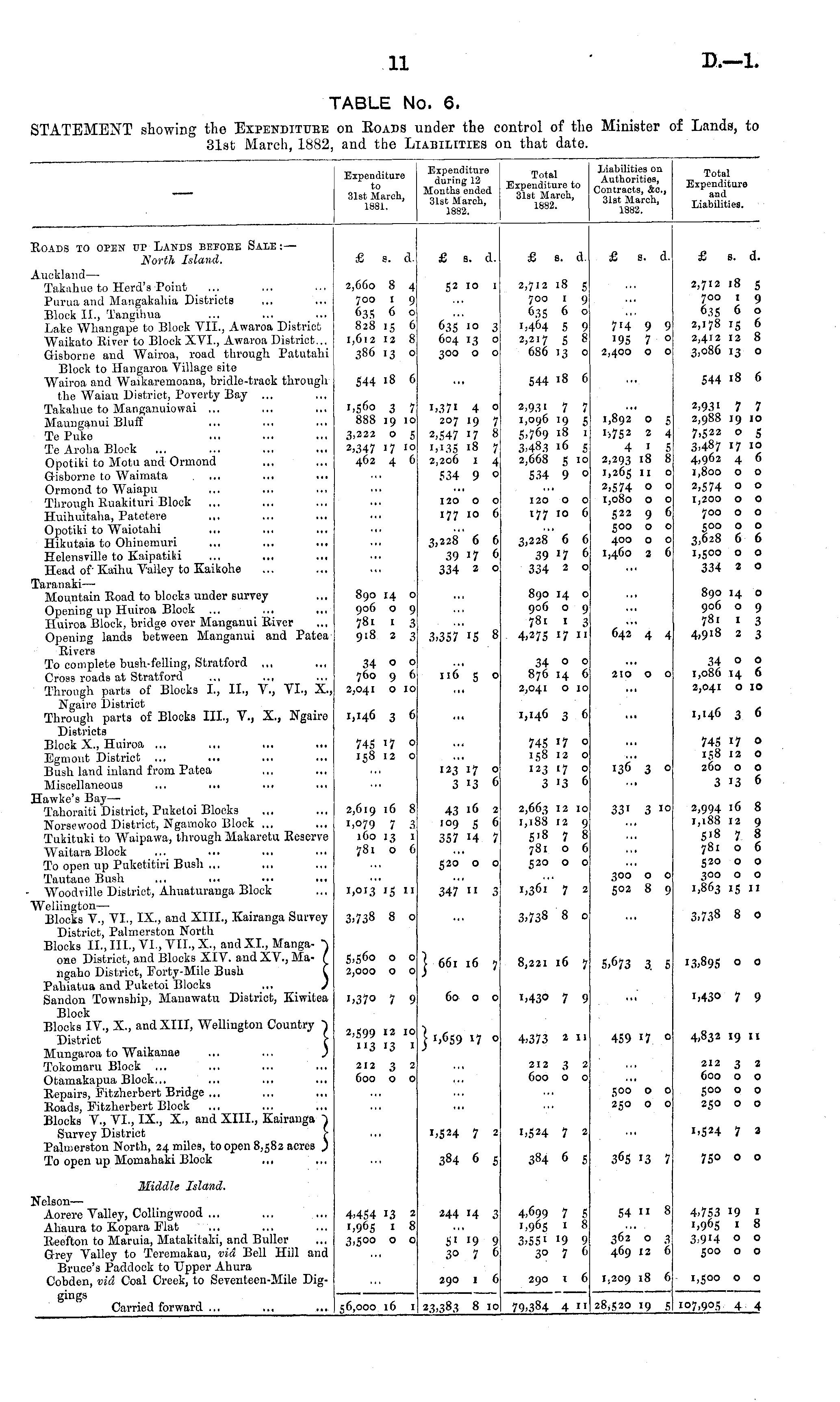 TABLE No. 6. STATEMENT showing the Expenditure on Roads under the control of the Minister of Lands, to 31st March, 1882, and the Liabilities on that date.