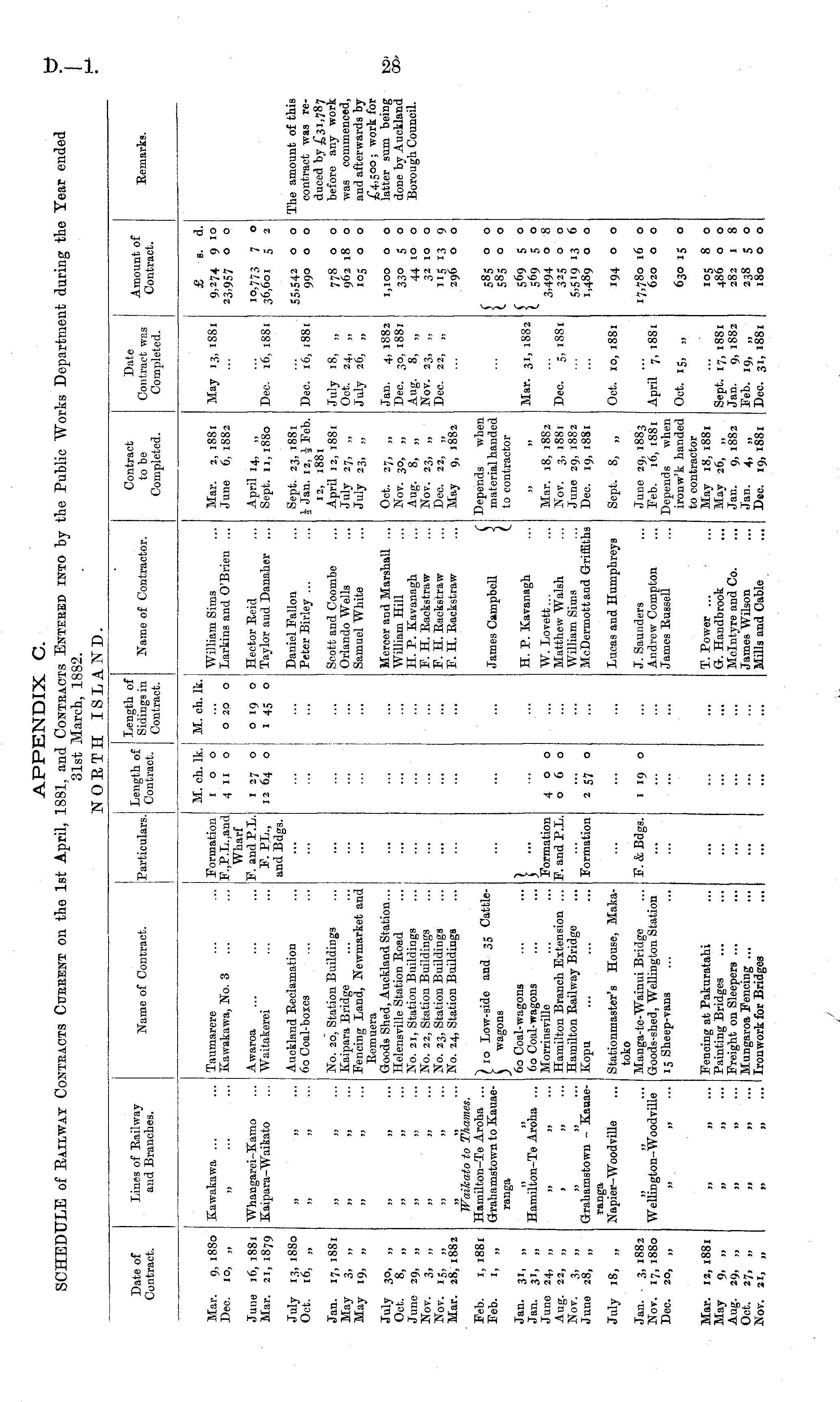 APPENDIX C. SCHEDULE of Railway Contracts Current on the 1st April, 1881, and Contracts Entered into by the Public Works Department during the Year ended 31st March, 1882. NORTH ISLAND.