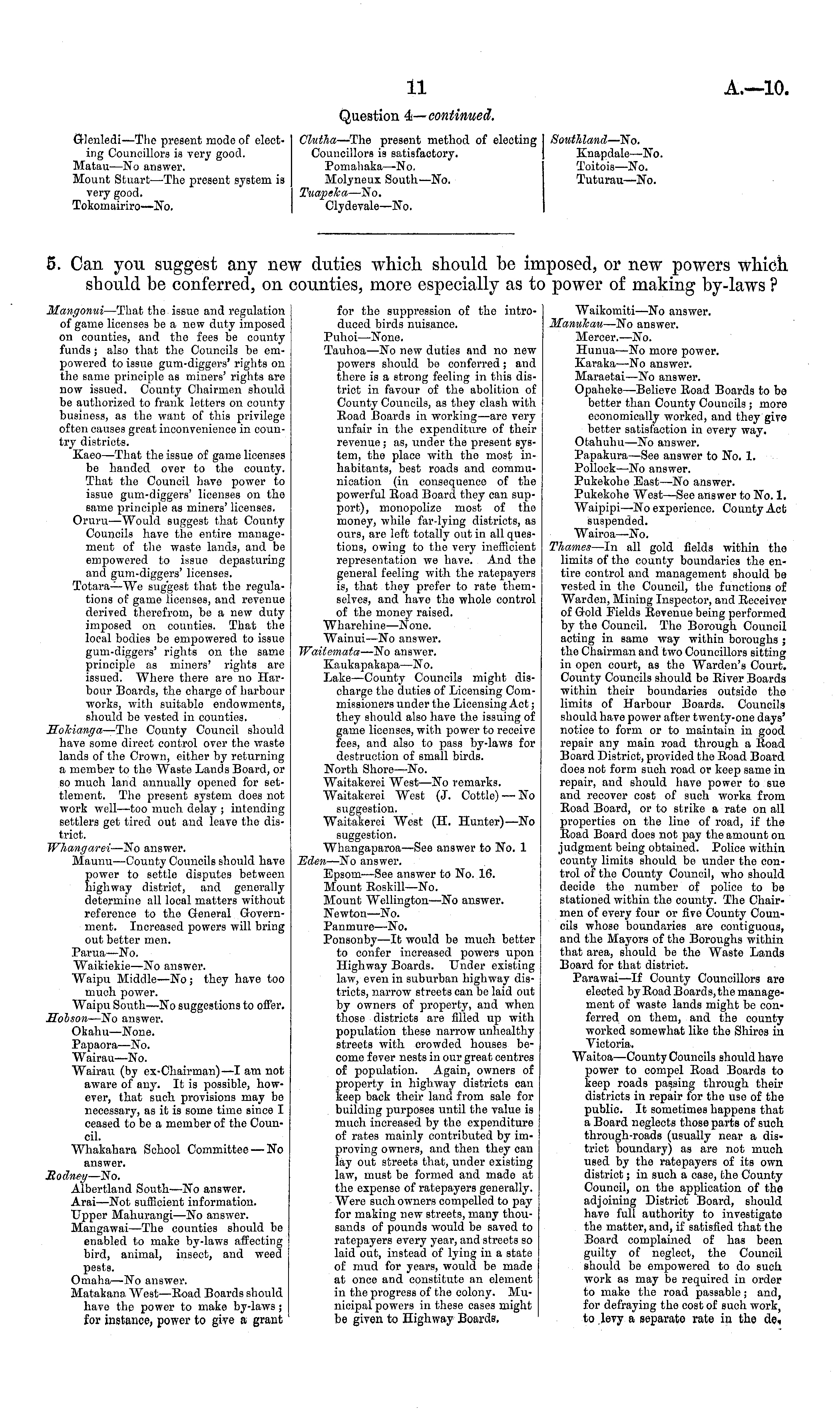 Waikomiti —No answer. ManuJcau —No answer. Mercer.—No. Hunua—No more power. Karaka—No answer. Maraetai—No answer. Opaheke—Believe Road Boards to be better than County Councils; more economically worked, and they give better satisfaction in every way. Otahuhu—No answer. Papakura—See answer to No. 1. Pollock—No answer. Pukekohe Bast—No answer. Pukekohe West—See answer to No. 1. Waipipi—No experience. County Act suspended. Wairoa—No. Thames —ln all gold fields within the limits of the county boundaries the entire control and management should be Tested in the Council, the functions of Warden, Mining Inspector, and Receiver of Gold Fields Revenue being performed by the Council. The Borough Council acting in same way within boroughs ; the Chairman and two Councillors sitting in open court, as the Warden's Court. County Councils should be River Boards within their boundaries outside the limits of Harbour Boards. Councils should have power after twenty-one days' notice to form or to maintain in good repair any main road through a Road Board District, provided the Road Board does not form such road or keep same ia repair, and should have power to sue and recover cost of such works from Road Board, or to strike a rate on all properties on the line of road, if the Road Board does not pay the amount on judgment being obtained. Police within county limits should be under the control of the County Council, who should decide the number of police to be stationed within the county. The Chairmen of every four or five County Councils whose boundaries are contiguous, and the Mayors of the Boroughs within that area, should be the Waste Lands Board for that district. Parawai —If County Councillors are elected by Roadßoards,the management of waste lands might be conferred on them, and the county worked somewhat like the Shires in Victoria. Waitoa—County Councils Bhould have power to compel Road Boards to keep roads passing through their districts in repair for the use of the public. It sometimes happens that a Board neglects those parts of such through-roads (usually near a district boundary) as are not much used by the ratepayers of its own district; in such a case, the County Council, on the application of the adjoining District Board, should have full authority to investigate the matter, and, if satisfied that the Board complained of has been guilty of neglect, the Council should be empowered to do such work as may be required in order to make the road passable; and, for defraying the cost of such work, to levy a separate rate in the de,