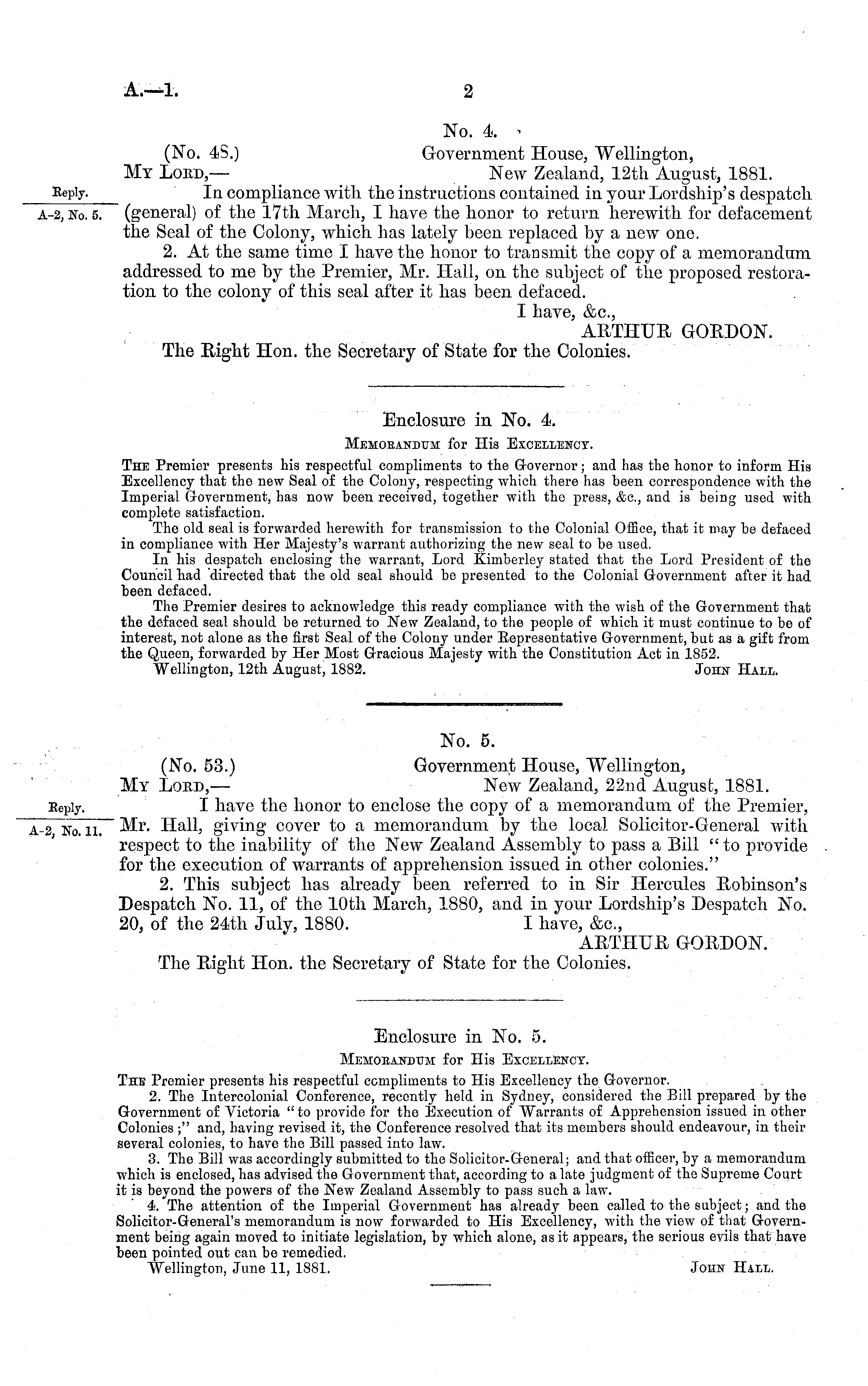 Enclosure in No. 4. Memobandtjm for His Excellency. The Premier presents his respectful compliments to the Governor; and has the honor to inform His Excellency that the new Seal of the Colony, respecting which there has been correspondence with the Imperial Government, has now been received, together with the press, &c, and is being used with complete satisfaction. The old seal is forwarded herewith for transmission to the Colonial Office, that it may be defaced in compliance with Her Majesty's warrant authorizing the new seal to be used. In his despatch enclosing the warrant, Lord Kimberley stated that the Lord President of the Council had directed that the old seal should be presented to the Colonial Government after it had been defaced. The Premier desires to acknowledge this ready compliance with the wish of the Government that the defaced seal should be returned to New Zealand, to the people of which it must continue to be of interest, not alone as the first Seal of the Colony under Representative Government, but as a gift from the Queen, forwarded by Her Most Gracious Majesty with the Constitution Act in 1852. Wellington, 12th August, 1882. John Hall.