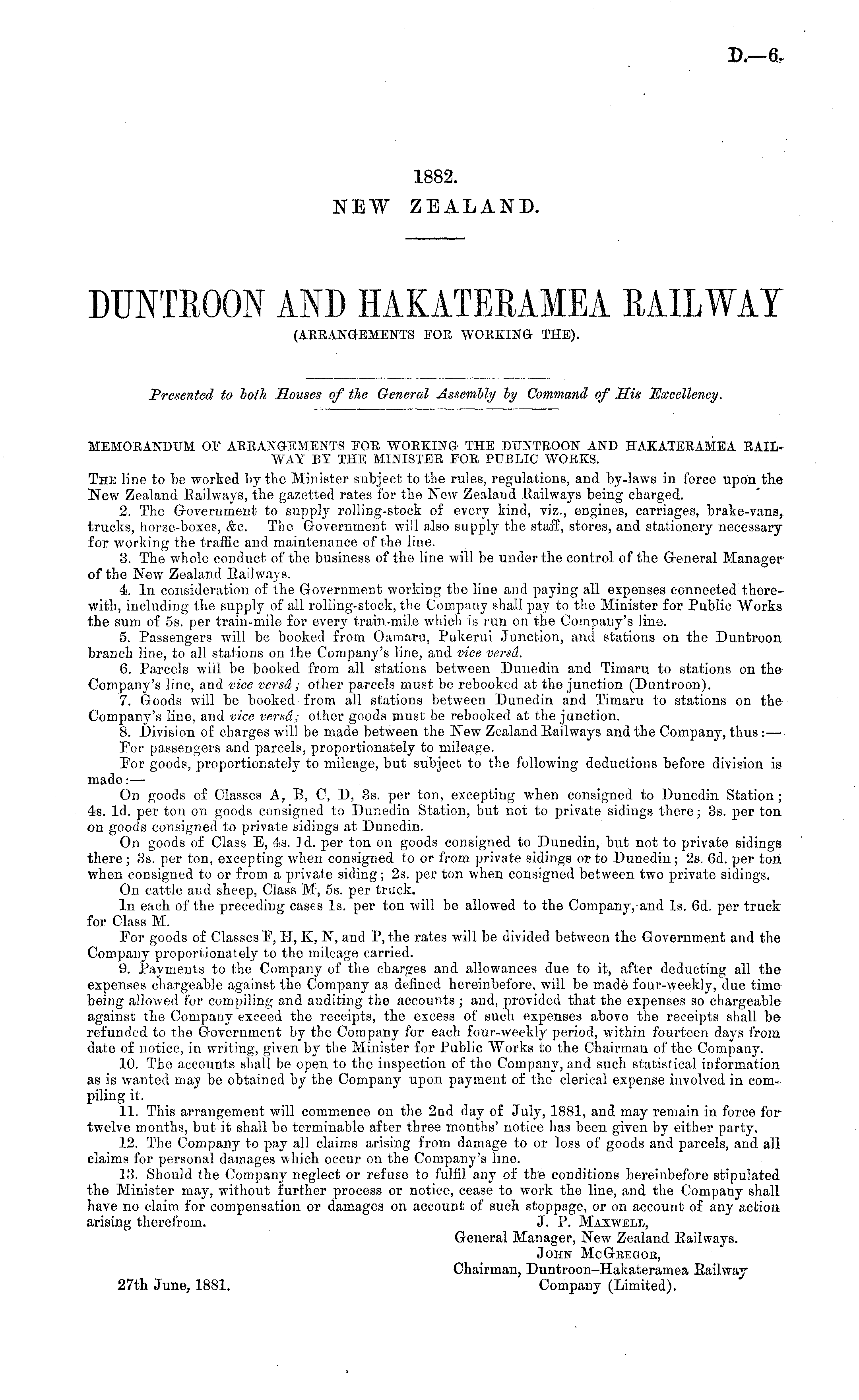 MEMORANDUM OF ARRANGEMENTS FOR WORKING THE PUNTROON AND HAKATERAMEA RAILWAY BY THE MINISTER FOR PUBLIC WORKS. The line to be worked by the Minister subject to the rules, regulations, and by-laws in force upon the New Zealand Railways, the gazetted rates for the New Zealand Railways being charged. 2. The Government to supply rolling-stock of every kind, viz., engines, carriages, brake-vans,, trucks, horse-boxes, &c. The Government will also supply the staff, stores, and stationery necessary for working the traffic and maintenance of the line. 3. The whole conduct of the business of the line will be under the control of the General Manager of the New Zealand Railways. 4. In consideration of the Government working the line and paying all expenses connected therewith, including the supply of all rolling-stock, the Company shall pay to the Minister for Public Works the sum of ss. per train-mile for every train-mile which is run on the Company's line. 5. Passengers will be booked from Oatnaru, Pukerui Junction, and stations on the Duntroon branch line, to all stations on the Company's line, and vice versa. 6. Parcels will be booked from all stations between Dunedin. and Timaru to stations on the Company's line, and vice versa; other parcels must be rebooked at the junction (Duntroon). 7. Goods will be booked from all stations between Dunedin and Timaru to stations on the Company's line, and vice versa; other goods must be rebooked at the junction. 8. Division of charges will be made between the New Zealand Railways and the Company, thus :— For passengers and parcels, proportionately to mileage. For goods, proportionately to mileage, but subject to the following deductions before division is made:— On goods of Classes A, B, C, D, 3s. per ton, excepting when consigned to Dunedin Station; 4s. Id. per ton on goods consigned to Dunedin Station, but not to private sidings there; 3s. per ton on goods consigned to private sidings at Dunedin. On goods of Class E, 4s. Id. per ton on goods consigned to Dunedin, but not to private sidings there; 3s. per ton, excepting when consigned to or from private sidings or to Dunedin ; 2s. 6d. per ton when consigned to or from a private siding; 2s. per ton when consigned between two private sidings. On cattle and sheep, Class M, ss. per truck, In each of the preceding cases Is. per ton will be allowed to the Company, and Is. 6d. per truck for Class M. For goods of ClassesF, H, X, N, and P, the rates will be divided between the Government and the Company proportionately to the mileage carried. 9. Payments to the Company of the charges and allowances due to it, after deducting all the expenses chargeable against the Company as denned hereinbefore, will be made four-weekly, due time being allowed for compiling and auditing the accounts ; and, provided that the expenses so chargeable against the Company exceed the receipts, the excess of such expenses above the receipts shall be refunded to the Government by the Company for each four-weekly period, within fourteen days from date of notice, in writing, given by the Minister for Public Works to the Chairman of the Company. 10. The accounts shall be open to the inspection of the Company, and such statistical information as is wanted may be obtained by the Company upon payment of the clerical expense involved in compiling it. 11. This arrangement will commence on the 2nd day of July, 1881, and may remain in force for twelve months, but it shall be terminable after three months' notice has been given by either party. 12. The Company to pay all claims arising from damage to or loss of goods and parcels, and all claims for personal damages which occur on the Company's line. 13. Should the Company neglect or refuse to fulfil any of the conditions hereinbefore stipulated the Minister may, without further process or notice, cease to work the line, and the Company shall have no claim for compensation or damages on account of such stoppage, or on account of any action arising therefrom. J. P. Maxwell, General Manager, New Zealand Railways. John McGkegob, Chairman, Duntroon-Hakateramea Railway 27th June, 1881. Company (Limited).