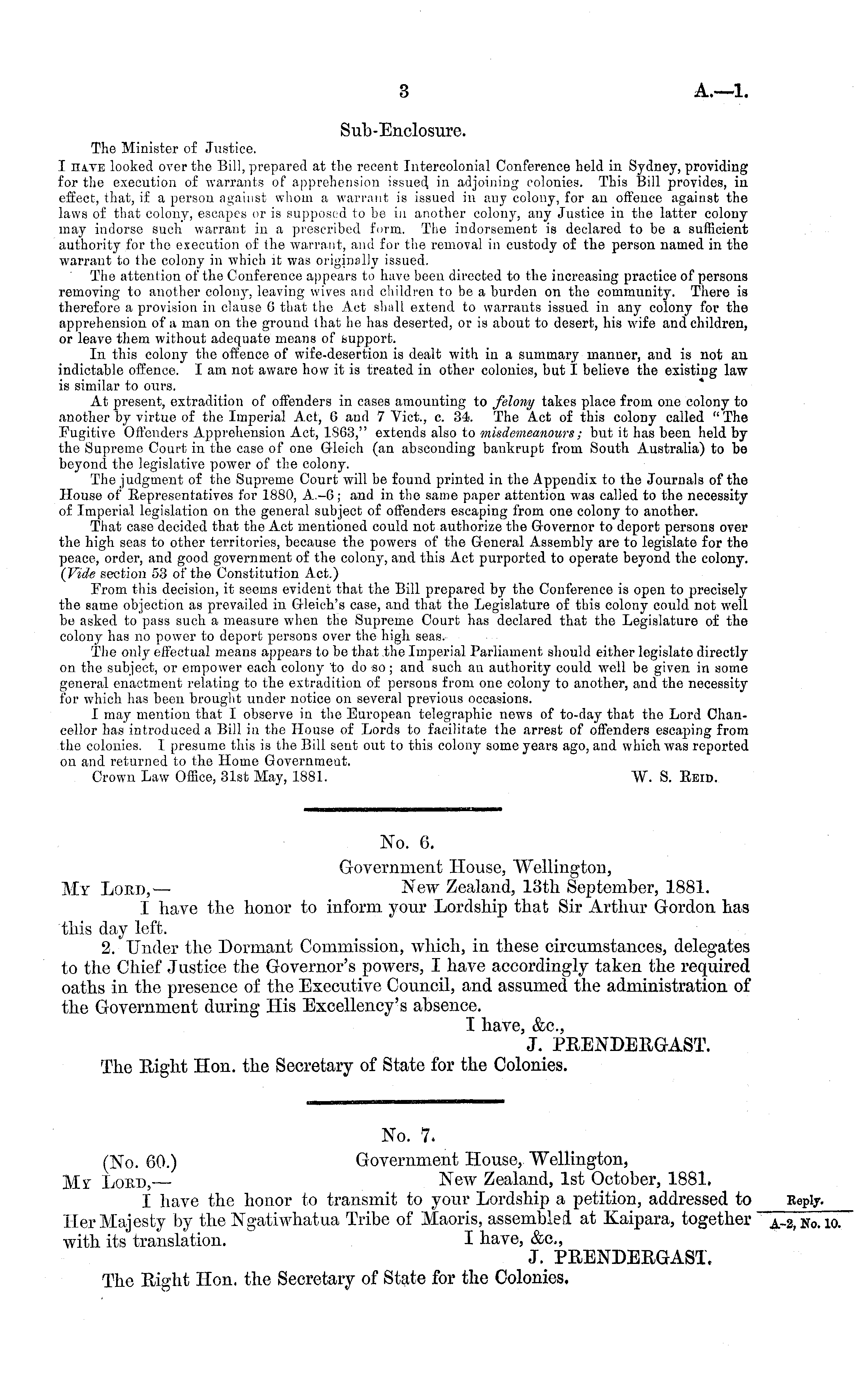 Sub-Enclosure. The Minister of Justice. I have looked over the Bill, prepared at the recent Intercolonial Conference held in Sydney, providing for the execution of warrants of apprehension issued, in adjoining colonies. This Bill provides, in effect, that, if a person against whom a warrant is issued in any colony, for an offence against the laws of that colony, escapes or is supposed to be in another colony, any Justice in the latter colony may indorse such warrant in a prescribed form. The indorsement is declared to be a sufficient authority for the execution of the warrant, and for the removal in custody of the person named in the warrant to the colony in which it was originally issued. The attention of the Conference appears to have been directed to the increasing practice of persons removing to another colony, leaving wives and children to be a burden on the community. There is therefore a provision in clause 6 that the Act shall extend to warrants issued in any colony for the apprehension of a man on the ground that he has deserted, or is about to desert, his wife and children, or leave them without adequate means of support. In this colony the offence of wife-desertion is dealt with in a summary manner, and is not an indictable offence. lam not aware how it is treated in other colonies, but I believe the existing law is similar to ours. At present, extradition of offenders in cases amounting to felony takes place from one colony to another by virtue of the Imperial Act, 6 and 7 Vict., c. 34. The Act of this colony called "The Fugitive Offenders Apprehension Act, 1863," extends also to misdemeanours; but it has been held by the Supreme Court in the case of one Gleich (an absconding bankrupt from South Australia) to be beyond the legislative power of the colony. The judgment of the Supreme Court will be found printed in the Appendix to the Journals of the House of Representatives for 1880, A.-6; and in the same paper attention was called to the necessity of Imperial legislation on the general subject of offenders escaping from one colony to another. That case decided that the Act mentioned could not authorize the Governor to deport persons over the high seas to other territories, because the powers of the General Assembly are to legislate for the peace, order, and good government of the colony, and this Act purported to operate beyond the colony. (Vide section 53 of the Constitution Act.) From this decision, it seems evident that the Bill prepared by the Conference is open to precisely the same objection as prevailed in Gleich's case, and that the Legislature of this colony could not well be asked to pass such a measure when the Supreme Court has declared that the Legislature of the colony has no power to deport persons over the high seas. The only effectual means appears to be that the Imperial Parliament should either legislate directly on the subject, or empower each colony to do so; and such an authority could well be given in some general enactment relating to the extradition of persons from one colony to another, and the necessity for which has been brought under notice on several previous occasions. I may mention that I observe in the European telegraphic news of to-day that the Lord Chancellor has introduced a Bill in the House of Lords to facilitate the ari'est of offenders escaping from the colonies. I presume this is the Bill sent out to this colony some years ago, and which was reported on and returned to the Home Governmeut. Crown Law Office, 31st May, 1881. W. S. Eeid.