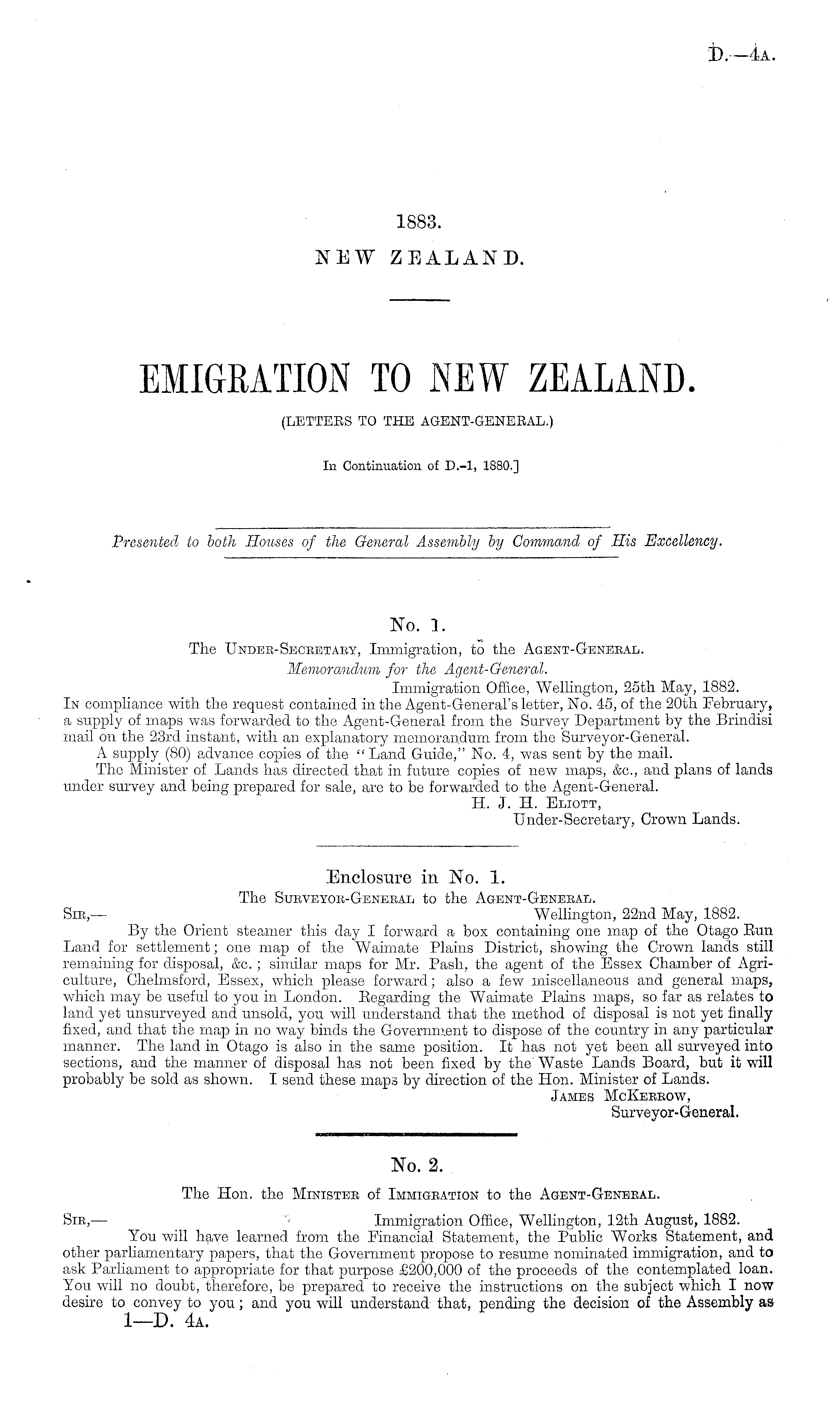 EMIGRATION TO NEW ZEALAND. (LETTERS TO THE AGENT-GENERAL.) [In Continuation of D.-1, 1880.]