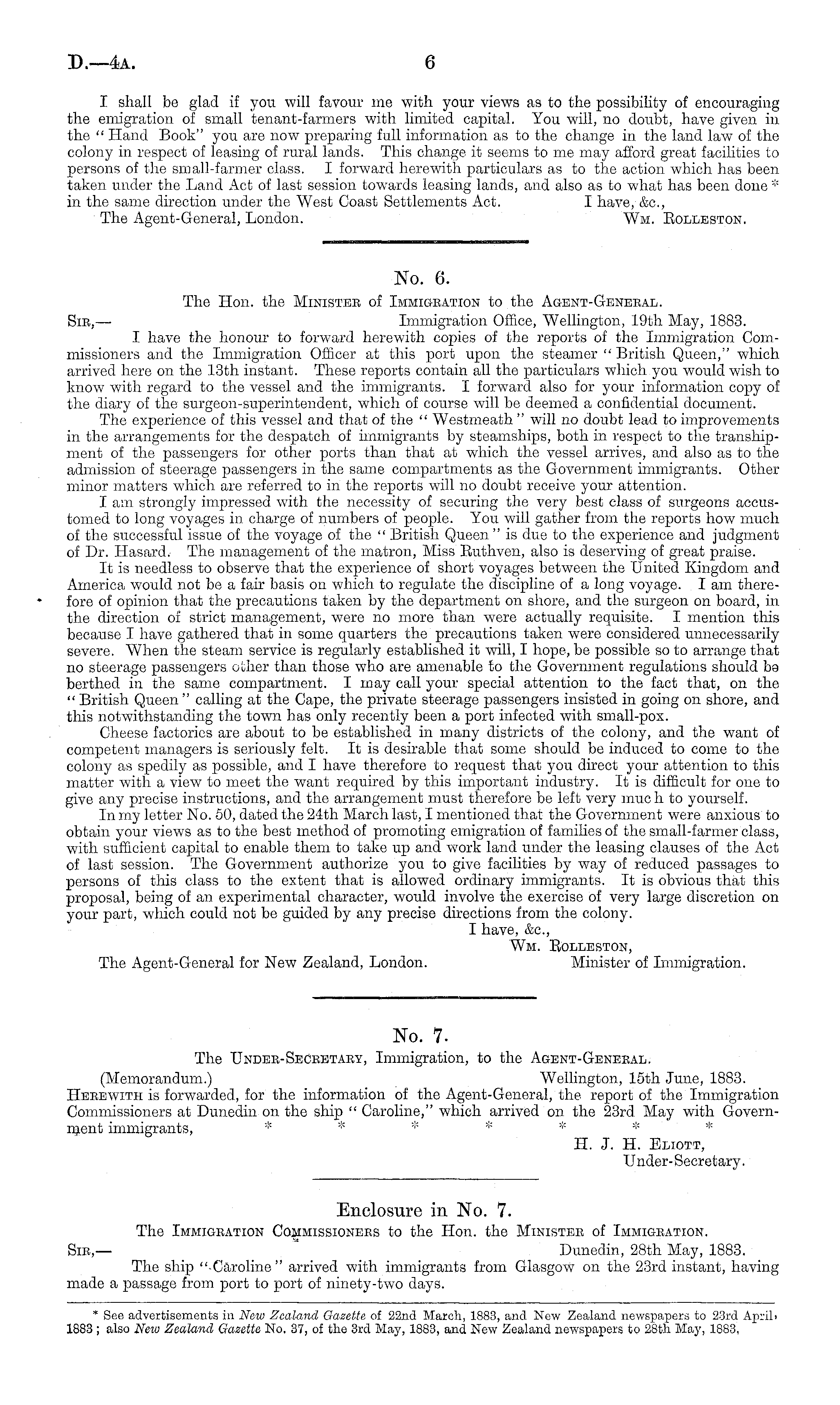 No. 6. The Hon. the Minister of Immigeation to the Agent-General. Sir, — Immigration Office, Wellington, 19th May, 1883. I have the honour to forward herewith copies of the reports of the Immigration Commissioners and the Immigration Officer at this port upon the steamer " British Queen," which arrived here on the 13th instant. These reports contain all the particulars which you would wish to know with regard to the vessel and the immigrants. I forward also for your information copy of the diary of the surgeon-superintendent, which of course will be deemed a confidential document. The experience of this vessel and that of the " Westmeath " will no doubt lead to improvements in the arrangements for the despatch of immigrants by steamships, both in respect to the transhipment of the passengers for other ports than that at which the vessel arrives, and also as to the admission of steerage passengers in the same compartments as the Government immigrants. Other minor matters which are referred to in the reports will no doubt receive your attention. I am strongly impressed with the necessity of securing the very best class of surgeons accustomed to long voyages in charge of numbers of people. You will gather from the reports how much of the successful issue of the voyage of the " British Queen " is due to the experience and judgment of Dr. Hasard. The management of the matron, Miss Buthven, also is deserving of great praise. It is needless to observe that the experience of short voyages between the United Kingdom and America would not be a fair basis on which to regulate the discipline of a long voyage. lam therefore of opinion that the precautions taken by the department on shore, and the surgeon on board, in the direction of strict management, were no more than were actually requisite. I mention this because I have gathered that in some quarters the precautions taken were considered unnecessarily severe. When the steam service is regularly established it will, I hope, be possible so to arrange that no steerage passengers other than those who are amenable to the Government regulations should bo berthed in the same compartment. I may call your special attention to the fact that, on the " British Queen " calling at the Cape, the private steerage passengers insisted in going on shore, and this notwithstanding the town has only recently been a port infected with small-pox. Cheese factories are about to be established in many districts of the colony, and the want of competent managers is seriously felt. It is desirable that some should be induced to come to the colony as spedily as possible, and I have therefore to request that you direct your attention to this matter with a view to meet the want required by this important industry. It is difficult for one to give any precise instructions, and the arrangement must therefore be left very much to yourself. In my letter No. 50, dated the 24th March last, I mentioned that the Government were anxious to obtain your views as to the best method of promoting emigration of families of the small-farmer class, with sufficient capital to enable them to take up and work land under the leasing clauses of the Act of last session. The Government authorize you to give facilities by way of reduced passages to persons of this class to the extent that is allowed ordinary immigrants. It is obvious that this proposal, being of an experimental character, would involve the exercise of very large discretion on your part, which could not be guided by any precise directions from the colony. I have, &c, Wm. Bolleston, The Agent-General for New Zealand, London. Minister of Immigration.