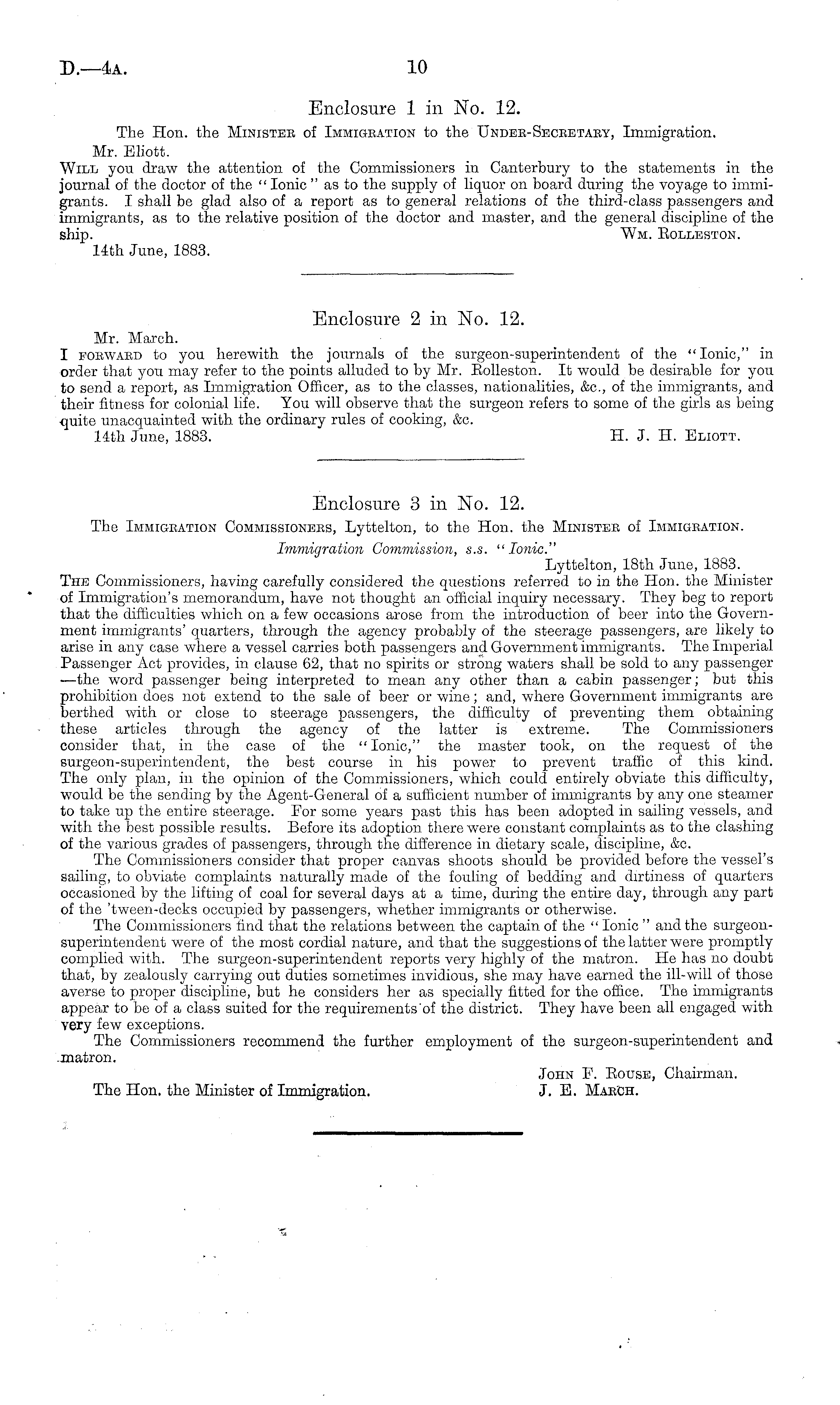 Enclosure 2 in No. 12. Mr. March. I forward to you herewith the journals of the surgeon-superintendent of the "lonic," in order that you may refer to the points alluded to by Mr. Bolleston. It would be desirable for you to send a report, as Immigration Officer, as to the classes, nationalities, &c, of the immigrants, and their fitness for colonial life. You will observe that the surgeon refers to some of the girls as being quite unacquainted with the ordinary rules of cooking, &c. 14th June, 1883. H. J. H. Eliott.