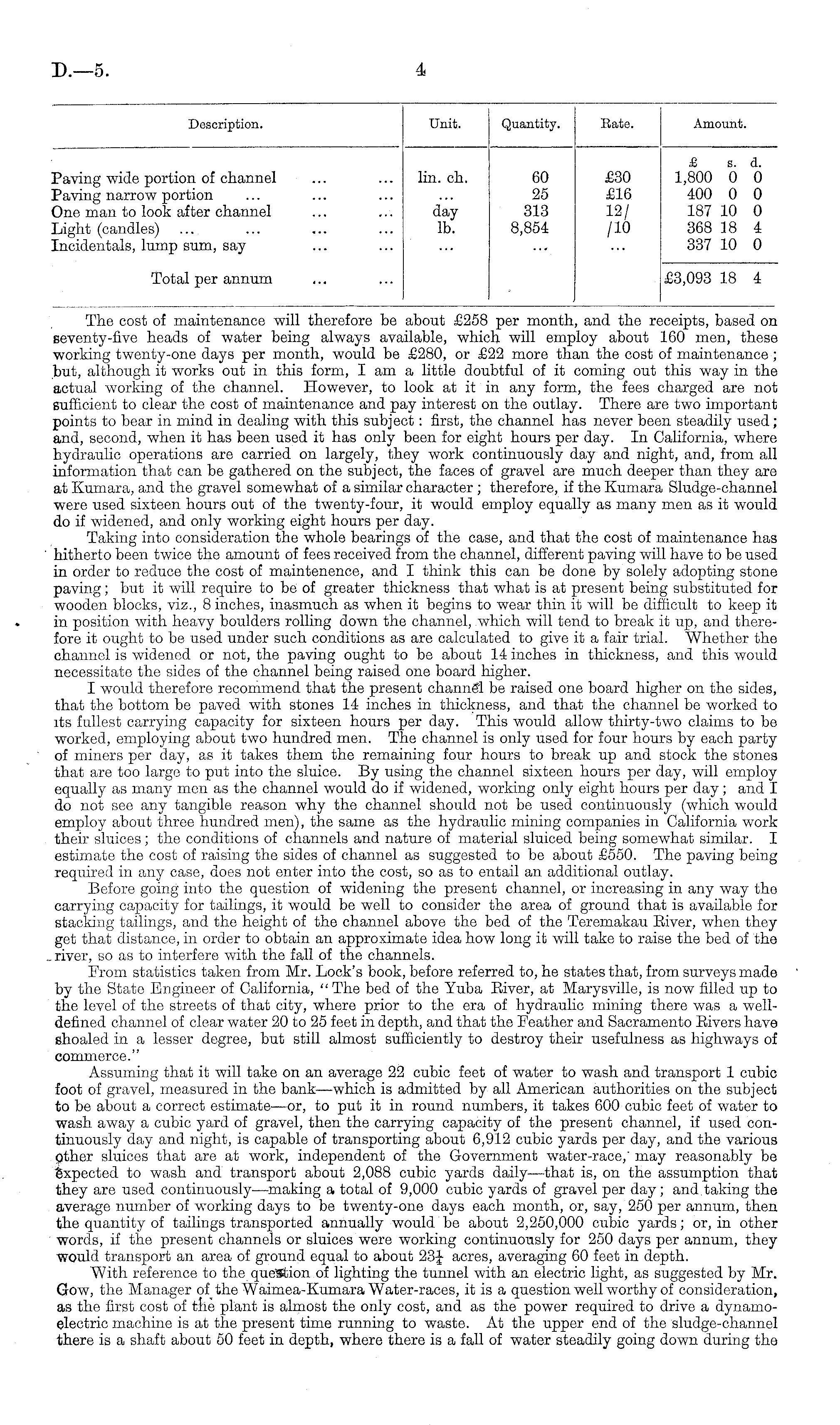 lescrip' iion. fmt juani '•J;e. .mourn 'aving wide portion of channel r'aving narrow portion )ne man to look after channel light (candles) incidentals, lump sum, say lin. ch. day lb. 60 25 313 8,854 £30 £16 12/ /10 £ s. d. 1,800 0 0 400 0 0 187 10 0 368 18 4 337 10 0 Total per annum £3,093 18 4