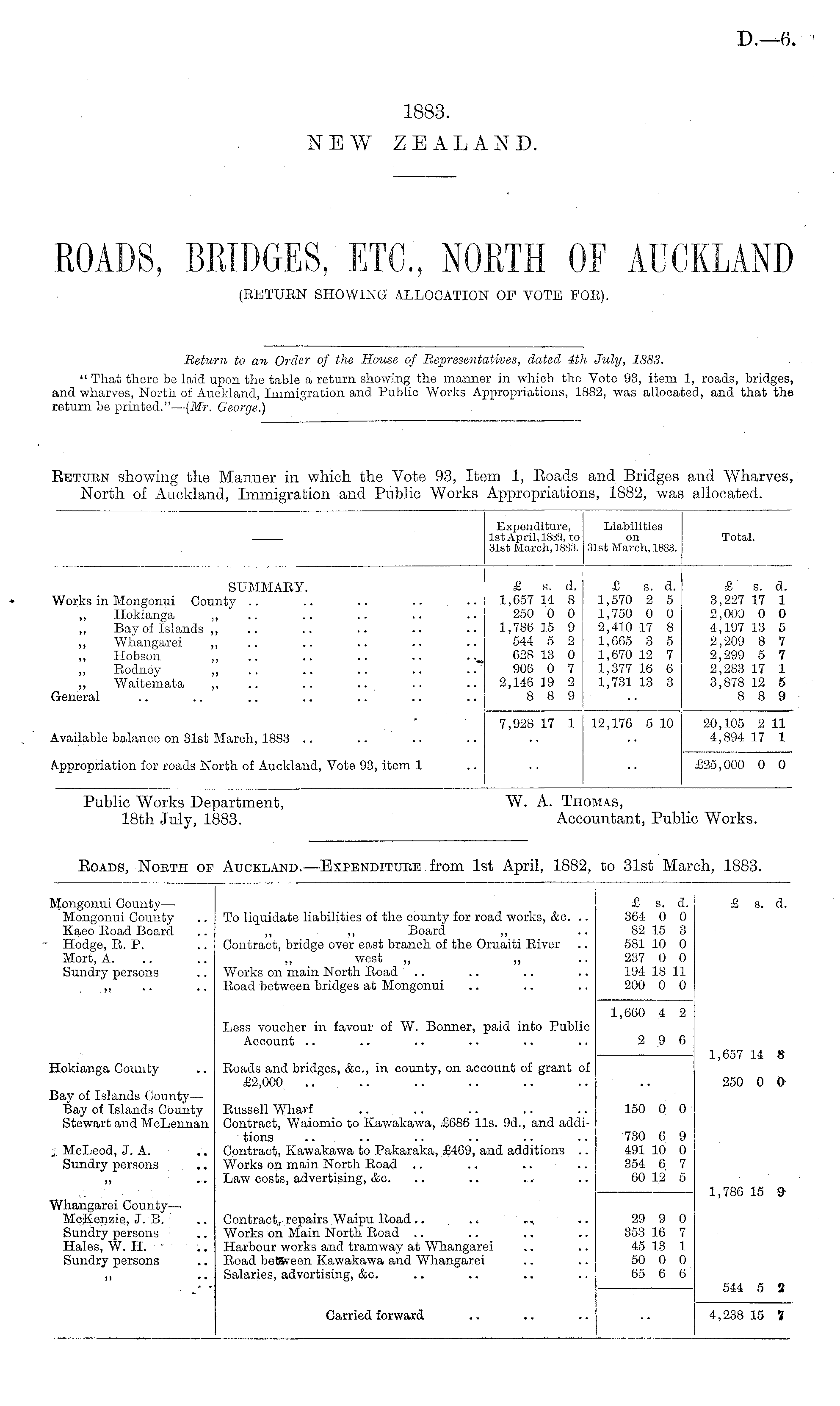 Return to an Order of the House of Representatives, dated 4th July, 1883. " That there be laid upon the table a return showing the manner in which the Vote 93, item 1, roads, bridges, and wharves, North of Auckland, Immigration and Public Works Appropriations, 1882, was allocated, and that the return be printed."— (Mr. George.)