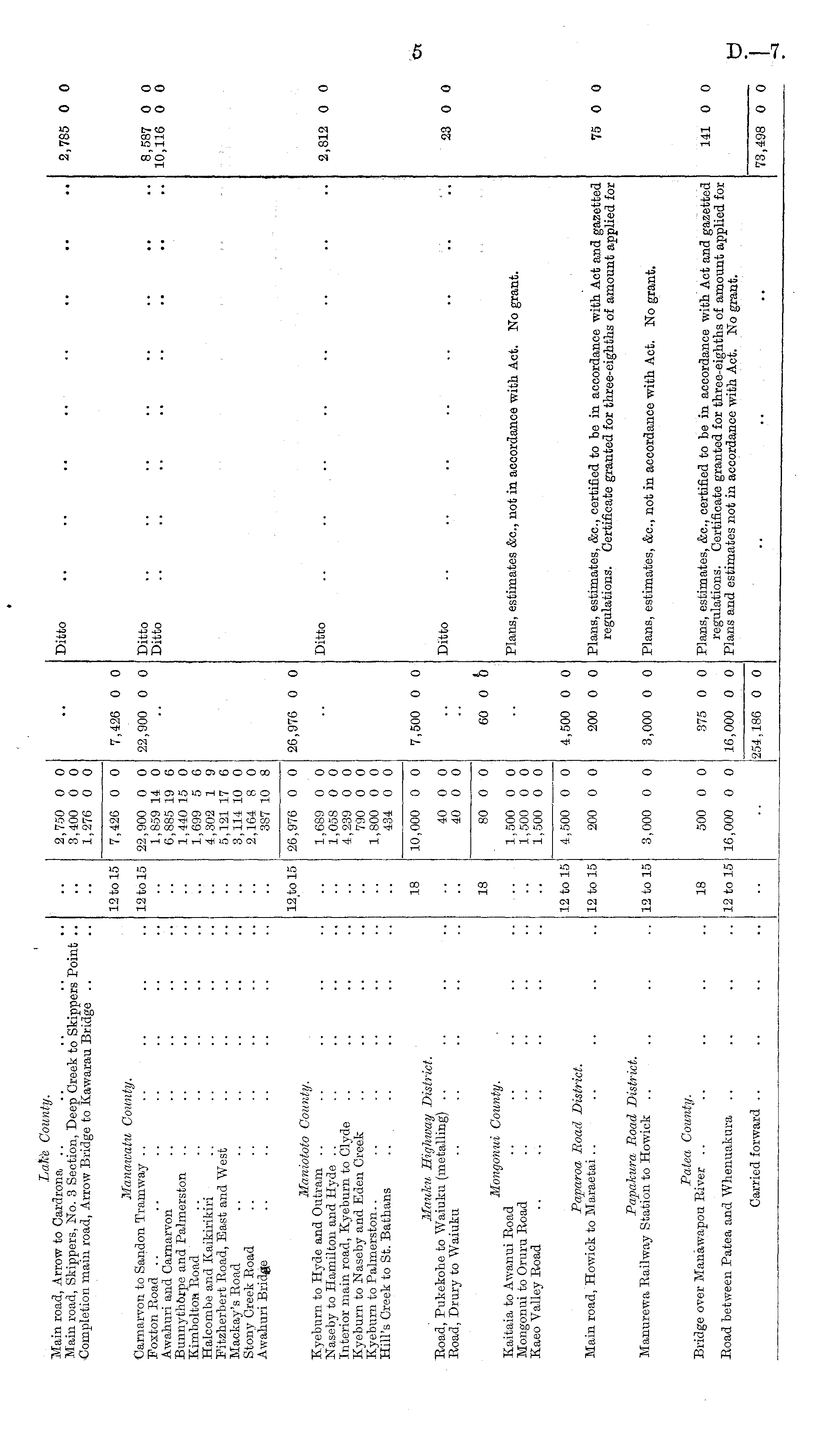 Lake County. Main road, Arrow to Cardrona Main road, Skippers, No. 3 Section, Deep Creek to Skippers Point .. Completion main road, Arrow Bridge to Kawarau Bridge 2,750 0 0 3,400 0 0 1,276 0 0 7,420 0 0 Ditto 2,785 0 Manawatu County. Carnarvon to Sandon Tramway Foxton Road Awahuri and Carnarvon Bunnythorpe and Palmerston Kimbolton Road Halcombe and Kaikirikiri .. .. Fitzherbert Eoad, East and West Mackay's Eoad Stony Creek Road Awahuri Bridge 12 to 15 7,426 0 0 Ditto Ditto 8,587 0 10,116 0 12 to 15 22,900 0 0 1,859 14 0 6,885 19 6 1,440 15 0 1,099 5 6 4,302 1 9 5,121 17 6 3,114 10 0 2,164 8 0 387 10 8 22,900 0 0 Maniototo County. Kyeburn to Hyde and Outram Naseby to Hamilton and Hyde Interior main road, Kyeburn to Clyde Kyeburn to Naseby and Eden Creek Kyeburn to Palmerston Hill's Creek to St. Bathans 12 to 15 26,976 0 0 26,976 0 0 1,689 0 0 1,058 0 0 4,239 0 0 790 0 0 1,800 0 0 434 0 0 Ditto 2,812 0 7,500 0 0 Ditto Mauku Highway District. Eoad, Pukekohe to Waiuku (metalling) Eoad, Drury to Waiuku 18 10,000 0 0 40 0 0 40 0 0 23 0 Mongonui County. 18 80 0 0 60 0 b Kaitaia to Awanui Eoad Mongonui to Oruru Road Kaeo Valley Eoad 1,500 0 0 1,500 0 0 1,500 0 0 4,500 0 0 Plans, estimates &c, not in accordance with Act. No grant. Paparoa Boad District. Main road, Howick to Maraetai 12 to 15 4,500 0 0 12 to 15 200 0 0 200 0 0 Plans, estimates, &c, certified to be in accordance with Act and gazetted regulations. Certificate granted for three-eighths of amount applied for 75 0 Papakura Road District. Manurewa Eailway Station to Howick 12 to 15 3,000 0 0 3,000 0 0 Plans, estimates, &c, not in accordance with Act. No grant. Patea County. Bridge over Manawapou Eiver 18 500 0 0 375 0 0 Plans, estimates, &c, certified to be in accordance with Act and gazetted regulations. Certificate granted for three-eighths of amount applied for Plans and estimates not in accordance with Act. No grant. 141 0 Road between Patea and Whenuakura 12 to 15 16,000 0 0 16,000 0 0 254,186 0 0 Carried forward 73,498 0