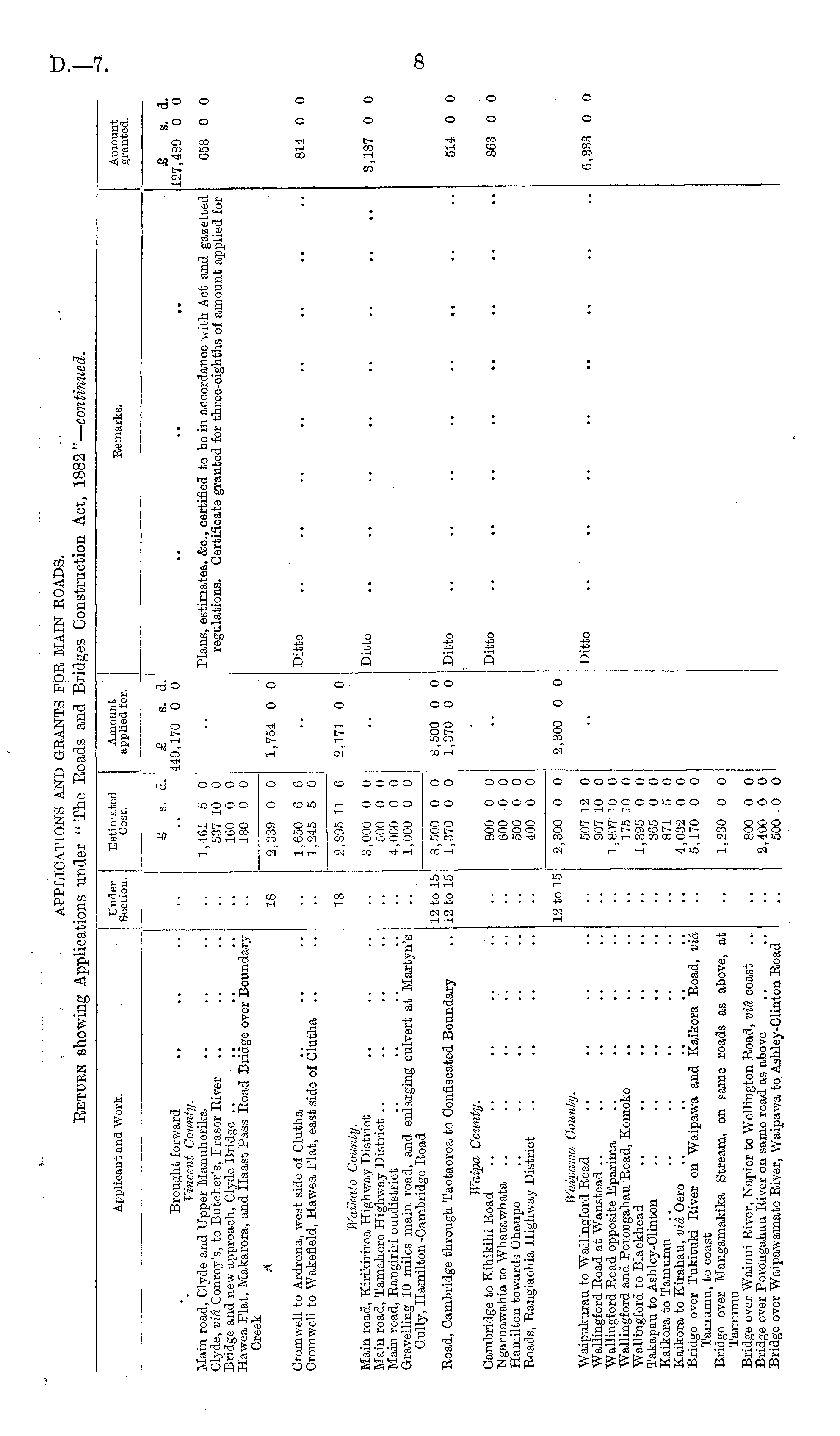 Applicant and Work. Under Section. Estimated Cost. Amount applied for. Bernarks. Amount granted. £ s. d. £ s. d. 440,170 0 0 £ s. d. 127,489 0 0 Brought forward Vincent County. Main road, Clyde and Upper Manuherika Clyde, via Conroy's, to Butcher's, Fraser River Bridge and new approach, Clyde Bridge .. Hawea Flat, Makarora, and Haast Pass Road Bridge over Boundary Creek I t 1,401 5 0 537 10 0 160 0 0 180 0 0 .. .. • • Plans, estimates, &c., certified to be in accordance with Act and gazetted regulations. Certificate granted for three-eighths of amount applied for 658 0 0 •• irt 18 2,339 0 0 1,754 0 0 Ditto 814 0 0 Cromwell to Ardrona, west side of Clutha Cromwell to Wakefield, Hawea Flat, east side of Clutha 1,650 6 6 1,245 5 0 Waikato County. Main road, Kirikiriroa Highway District Main road, Tamahere Highway District Main road, Rangiriri outdistrict Gravelling 10 miles main road, and enlarging culvert at Martyn's Gully, Hamilton-Cambridge Road 18 2,895 11 6 2,171 0 0 Ditto 3,187 0 0 • • 3,000 0 0 500 0 0 4,000 0 0 1,000 0 0 8,500 0 0 1,370 0 0 8,500 0 0 1,370 0 0 Ditto .. .. .. .. .. ., 514 0 0 Road, Cambridge through Taotaoroa to Confiscated Boundary 12 to 15 12 to 15 Waipa County. Cambridge to Kihikihi Road Ngaruawahia to Whatawhata Hamilton towards Ohaupo Roads, Rangiaohia Highway District 800 0 0 600 0 0 500 0 0 400 0 0 Ditto 863 0 0 12 to 15 2,300 0 0 Ditto .. .. .. .. .. 6,333 0 0 Waipawa County. Waipukurau to Wallingford Road Wallingford Road at Wanstead Wallingford Road opposite Eparima Wallingford and Porongahau Road, Komoko Wallingford to Blackhead Takapau to Ashley-Clinton Kaikora to Tamumu Kaikora to Kirahau, via Oero Bridge over Tukituki River on Waipawa and Kaikora Road, via Tamumu, to coast Bridge over Mangamakika Stream, on same roads as above, at Tamumu Bridge over Wainui River, Napier to Wellington Road, via, coast Bridge over Porongahau River on same road as above Bridge over Waipawarnate River, Waipawa to Ashley-Clinton Road 2,300 0 0 507 12 0 907 10 0 1,807 10 0 175 10 0 1,395 0 0 365 0 0 871 5 0 4,032 0 0 5,170 0 0 1,230 0 0 800 0 0 2,400 0 0 500 - 0 Of