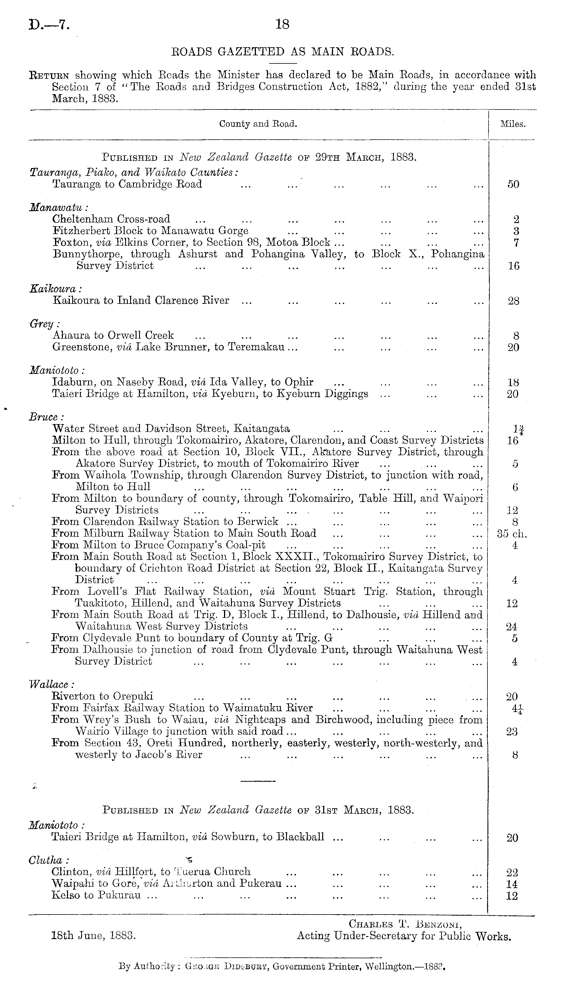 Return showing wdiich Eoads the Minister has declared to be Main Eoads, in accordance with Section 7 of "The Roads and Bridges Construction Act, 1882," during the year ended 31st March, 1883.
