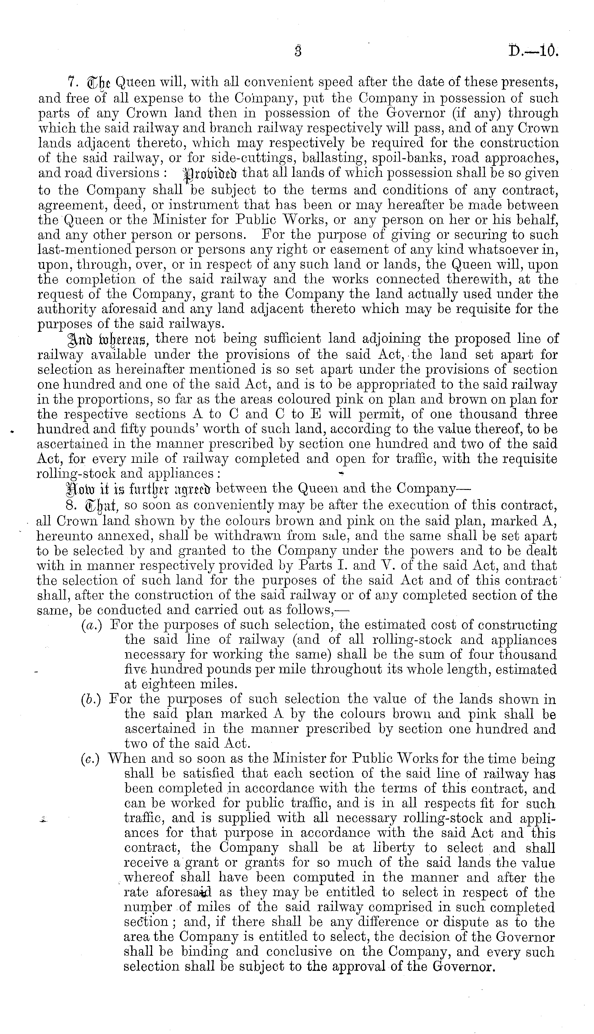 7- jffrfce Queen will, with all convenient speed after the date of these presents, and free of all expense to the Company, put the Company in possession of such parts of any Crown land then in possession of the Governor (if any) through which the said railway and branch railway respectively will pass, and of any Crown lands adjacent thereto, which may respectively be required for the construction of the said railway, or for side-cuttings, ballasting, spoil-banks, road approaches, and road diversions : IJioiribxir that all lands of which possession shall be so given to the Company shall be subject to the terms and conditions of any contract, agreement, deed, or instrument that has been or may hereafter be made between the Queen or the Minister for Public Works, or any person on her or his behalf, and any other person or persons. For the purpose of giving or securing to such last-mentioned person or persons any right or easement of any kind whatsoever in, upon, through, over, or in respect of any such land or lands, the Queen will, upon the completion of the said railway and the works connected therewith, at the request of the Company, grant to the Company the land actually used under the authority aforesaid and any land adjacent thereto which may be requisite for the purposes of the said railways. §^nfa ixrfj£teas, there not being sufficient land adjoining the proposed line of railway available under the provisions of the said Act, the land set apart for selection as hereinafter mentioned is so set apart under the provisions of section one hundred and one of the said Act, and is to be appropriated to the said railway in the proportions, so far as the areas coloured pink on plan and brown on plan for the respective sections A to C and C to E will permit, of one thousand three hundred and fifty pounds' worth of such land, according to the value thereof, to be ascertained in the manner prescribed by section one hundred and two of the said Act, for every mile of railway completed and open for traffic, with the requisite rolling-stock and appliances : Hoiu it is further aguctr between the Queen and the Company— 8. (kbut, so soon as conveniently may be after the execution of this contract, all Crown land shown by the colours brown and pink on the said plan, marked A, hereunto annexed, shall be withdrawn from sale, and the same shall be set apart to be selected by and granted to the Company under the powers and to be dealt with in manner respectively provided by Parts I. and V. of the said Act, and that the selection of such land for the purposes of the said Act and of this contract' shall, after the construction of the said railway or of any completed section of the same, be conducted and carried out as follows,' — (a.) For the purposes of such selection, the estimated cost of constructing the said line of railway (and of all rolling-stock and appliances necessary for working the same) shall be the sum of four thousand five hundred pounds per mile throughout its whole length, estimated at eighteen miles. (b.) For the purposes of such selection the value of the lands shown in the said plan marked A by the colours brown and pink shall be ascertained in the manner prescribed by section one hundred and two of the said Act. (c.) When and so soon as the Minister for Public Works for the time being shall be satisfied that each section of the said line of railway has been completed in accordance with the terms of this contract, and can be worked for public traffic, and is in all respects fit for such traffic, and is supplied with all necessary rolling-stock and appliances for that purpose in accordance with the said Act and this contract, the Company shall be at liberty to select and shall receive a grant or grants for so much of the said lands the value whereof shall have been computed in the manner and after the rate aforesaid as they may be entitled to select in respect of the number of miles of the said railway comprised in such completed section; and, if there shall be any difference or dispute as to the area the Company is entitled to select, the decision of the Governor shall be binding and conclusive on the Company, and every such selection shall be subject to the approval of the Governor.
