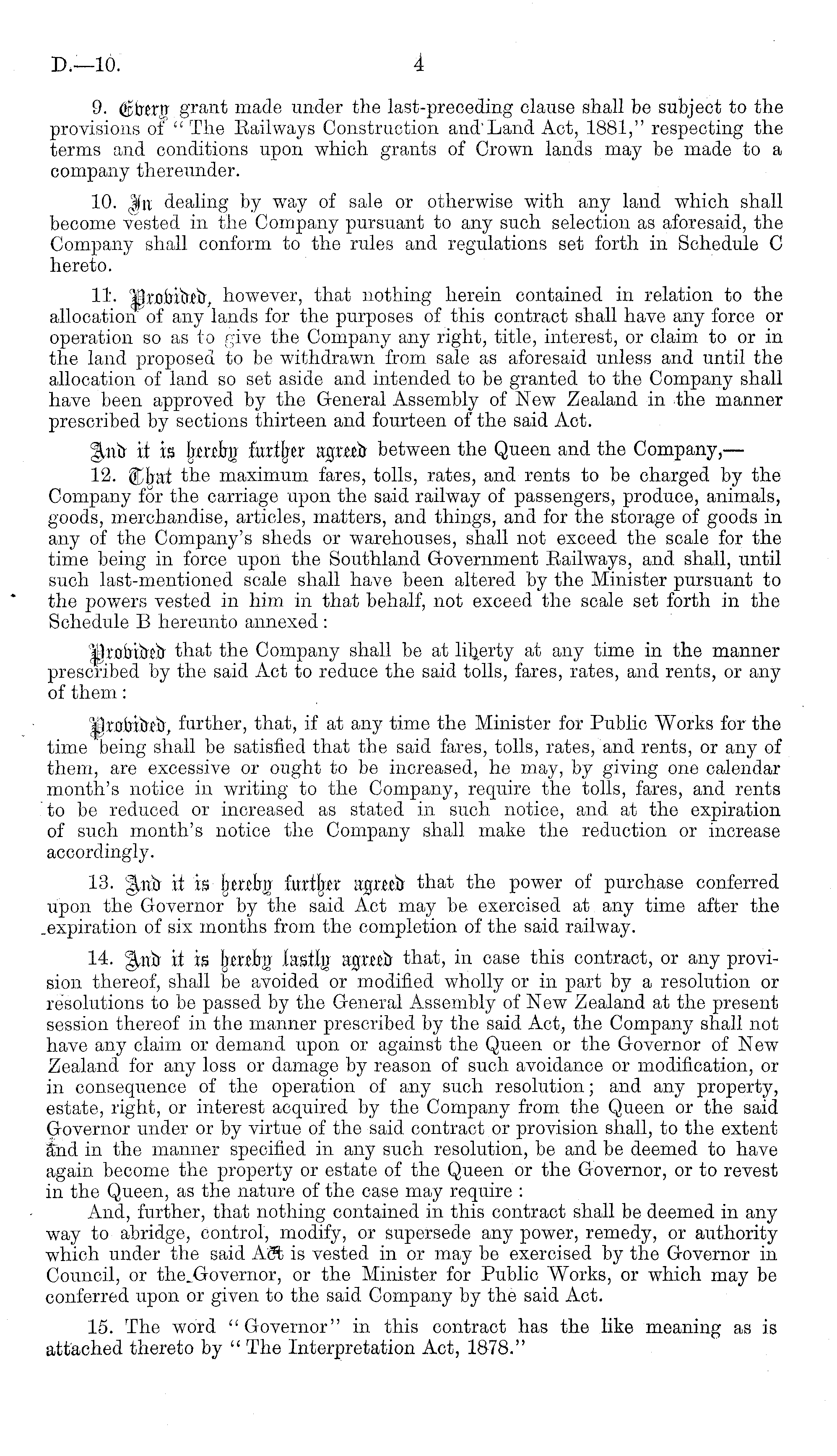 9. (£btrrr grant made under the last-preceding clause shall be subject to the provisions of " The Railways Construction and' Land Act, 1881," respecting the terms and conditions upon which grants of Crown lands may be made to a company thereunder. 10. %xi dealing by way of sale or otherwise with any land which shall become vested in the Company pursuant to any such selection as aforesaid, the Company shall conform to the rules and regulations set forth in Schedule C hereto. 11- fXtotiibttr, however, that nothing herein contained in relation to the allocation of any lands for the purposes of this contract shall have any force or operation so as to give the Company any right, title, interest, or claim to or in the land proposed to be withdrawn from sale as aforesaid unless and until the allocation of land so set aside and intended to be granted to the Company shall have been approved by the General Assembly of New Zealand in the manner prescribed by sections thirteen and fourteen of the said Act. %nh it is Jmt% fuxtjxer acjmtr between the Queen and the Company,— 12. &})ixt the maximum fares, tolls, rates, and rents to be charged by the Company for the carriage upon the said railway of passengers, produce, animals, goods, merchandise, articles, matters, and things, and for the storage of goods in any of the Company's sheds or warehouses, shall not exceed the scale for the time being in force upon the Southland Government Eailways, and shall, until such last-mentioned scale shall have been altered by the Minister pursuant to the powers vested in him in that behalf, not exceed the scale set forth in the Schedule B hereunto annexed : lirotribtj} that the Company shall be at liberty at any time in the manner prescribed by the said Act to reduce the said tolls, fares, rates, and rents, or any of them: Ikabiiwb, further, that, if at any time the Minister for Public Works for the time being shall be satisfied that the said fares, tolls, rates, and rents, or any of them, are excessive or ought to be increased, he may, by giving one calendar month's notice in writing to the Company, require the tolls, fares, and rents to be reduced or increased as stated in such notice, and at the expiration of such month's notice the Company shall make the reduction or increase accordingly. 13. Qvfo it m JKrefcrjr fm*%r agmfo that the power of purchase conferred upon the Governor by the said Act may be exercised at any time after the _expiration of six months from the completion of the said railway. 14. it is {jmtrg las% agxetU that, in case this contract, or any provision thereof, shall be avoided or modified wholly or in part by a resolution or resolutions to be passed by the General Assembly of New Zealand at the present session thereof in the manner prescribed by the said Act, the Company shall not have any claim or demand upon or against the Queen or the Governor of New Zealand for any loss or damage by reason of such avoidance or modification, or in consequence of the operation of any such resolution; and any property, estate, right, or interest acquired by the Company from the Queen or the said Governor under or by virtue of the said contract or provision shall, to the extent and in the manner specified in any such resolution, be and be deemed to have again become the property or estate of the Queen or the Governor, or to revest in the Queen, as the nature of the case may require : And, further, that nothing contained in this contract shall be deemed in any way to abridge, control, modify, or supersede any power, remedy, or authority which under the said Aft is vested in or may be exercised by the Governor in Council, or the^Governor, or the Minister for Public Works, or which may be conferred upon or given to the said Company by the said Act. 15. The word "Governor" in this contract has the like meaning as is attached thereto by " The Interpretation Act, 1878."