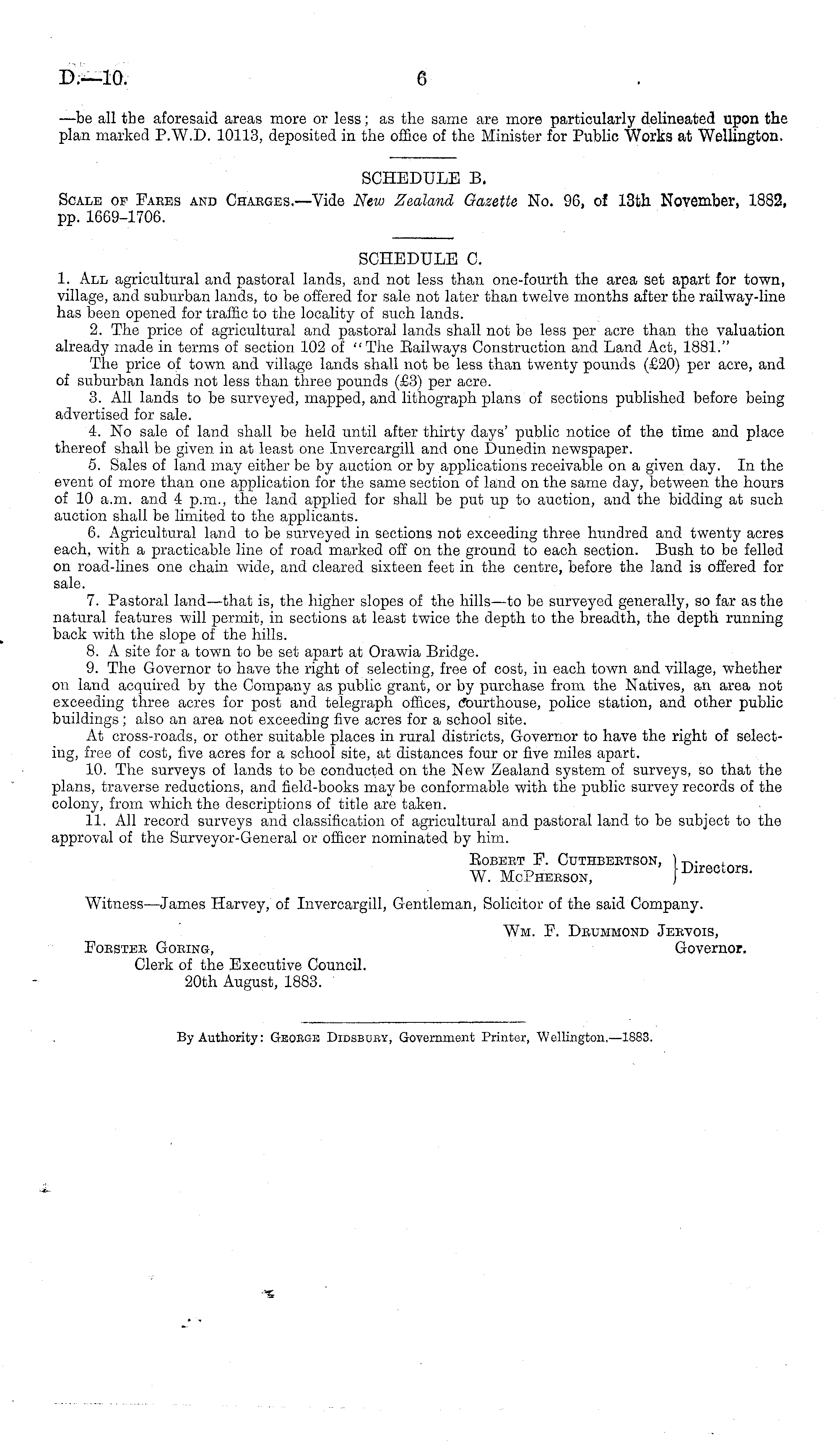 SCHEDULE C. 1. All agricultural and pastoral lands, and not less than one-fourth the area set apart for town, village, and suburban lands, to be offered for sale not later than twelve months after the railway-line has been opened for traffic to the locality of such lands. 2. The price of agricultural and pastoral lands shall not be less per acre than the valuation already made in terms of section 102 of "The Railways Construction and Land Act, 1881." The price of town and village lands shall not be less than twenty pounds (£2O) per acre, and of suburban lands not less than three pounds (£3) per acre. 3. All lands to be surveyed, mapped, and lithograph plans of sections published before being advertised for sale. 4. No sale of land shall be held until after thirty days' public notice of the time and place thereof shall be given in at least one Invercargill and one Dunedin newspaper. 5. Sales of land may either be by auction or by applications receivable on a given day. In the event of more than one application for the same section of land on the same day, between the hours of 10 a.m. and 4 p.m., the land applied for shall be put up to auction, and the bidding at such auction shall be limited to the applicants. 6. Agricultural land to be surveyed in sections not exceeding three hundred and twenty acres each, with a practicable line of road marked off on the ground to each section. Bush to be felled on road-lines one chain wide, and cleared sixteen feet in the centre, before the land is offered for sale. 7. Pastoral land—that is, the higher slopes of the hills—to be surveyed generally, so far as the natural features will permit, in sections at least twice the depth to the breadth, the depth running back with the slope of the hills. 8. A site for a town to be set apart at Orawia Bridge. 9. The Governor to have the right of selecting, free of cost, in each town and village, whether on land acquired by the Company as public grant, or by purchase from the Natives, an area not exceeding three acres for post and telegraph offices, Courthouse, police station, and other public buildings; also an area not exceeding five acres for a school site. At cross-roads, or other suitable places in rural districts, Governor to have the right of selecting, free of cost, five acres for a school site, at distances four or five miles apart. 10. The surveys of lands to be conducted on the New Zealand system of surveys, so that the plans, traverse reductions, and field-books may be conformable with the public survey records of the colony, from which the descriptions of title are taken. 11. All record surveys and classification of agricultural and pastoral land to be subject to the approval of the Surveyor-General or officer nominated by him. EoBEBT P. CUTHBEETSON, t TO _ fi -i- r( , W. McPheeson, juirecors. Witness—James Harvey, of Invercargill, Gentleman, Solicitor of the said Company. Wm. F. Dbummond Jeevois, Foesteb Goeing, Governor. Clerk of the Executive Council. 20th August, 1883.