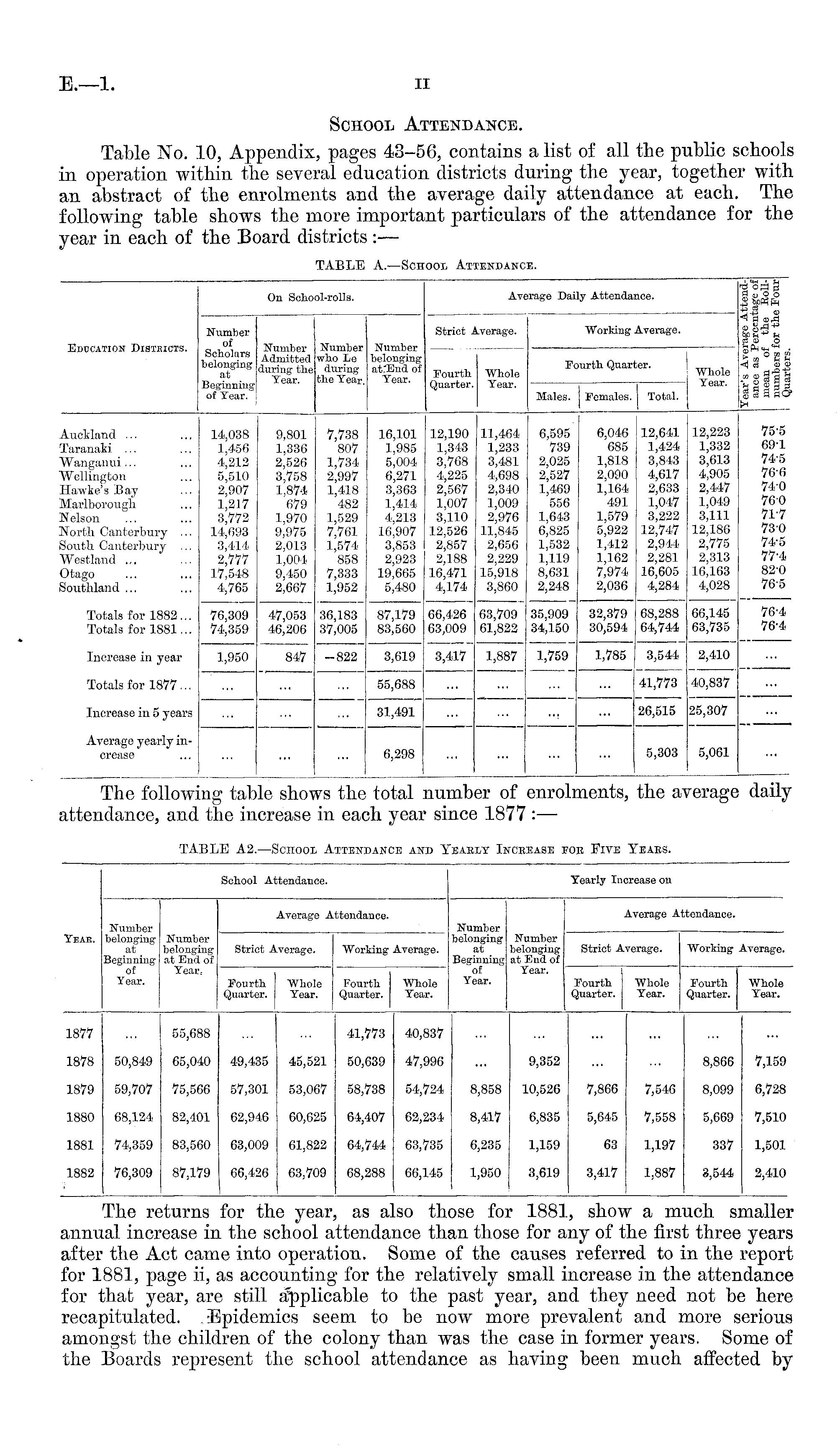 School Attendance. Yearly Increase on Average Attendance. Average Attendance. "ear. Number belonging at Beginning of Year. Number belonging at End of Year, Strict Average. Working Average. Number oelonging at Beginning of Year. Number belonging at End of Year. Strict Average. Working Average. Fourth Whole Quarter. Year. Fourth Whole Quarter. Year. Fourth Whole Quarter. Year. Fourth Whole Quarter. Year. 1877 55,688 41,773 40,837 1878 50,849 65,040 49,435 45,521 50,639 47,996 9,352 8,866 7,159 1879 59,707 75,566 57,301 53,067 58,738 54,724 8,858 10,526 7,866 7,546 8,099 6,728 1880 68,124 82,401 62,946 60,625 64,407 62,234 8,417 6,835 5,645 7,558 5,669 7,510 1881 74,359 83,560 63,009 61,822 64,744 63,735 6,235 1,159 63 1,197 337 1,501 1882 76,309 87,179 66,426 63,709 68,288 66,145 1,950 3,619 3,417 1,887 3,544 2,410