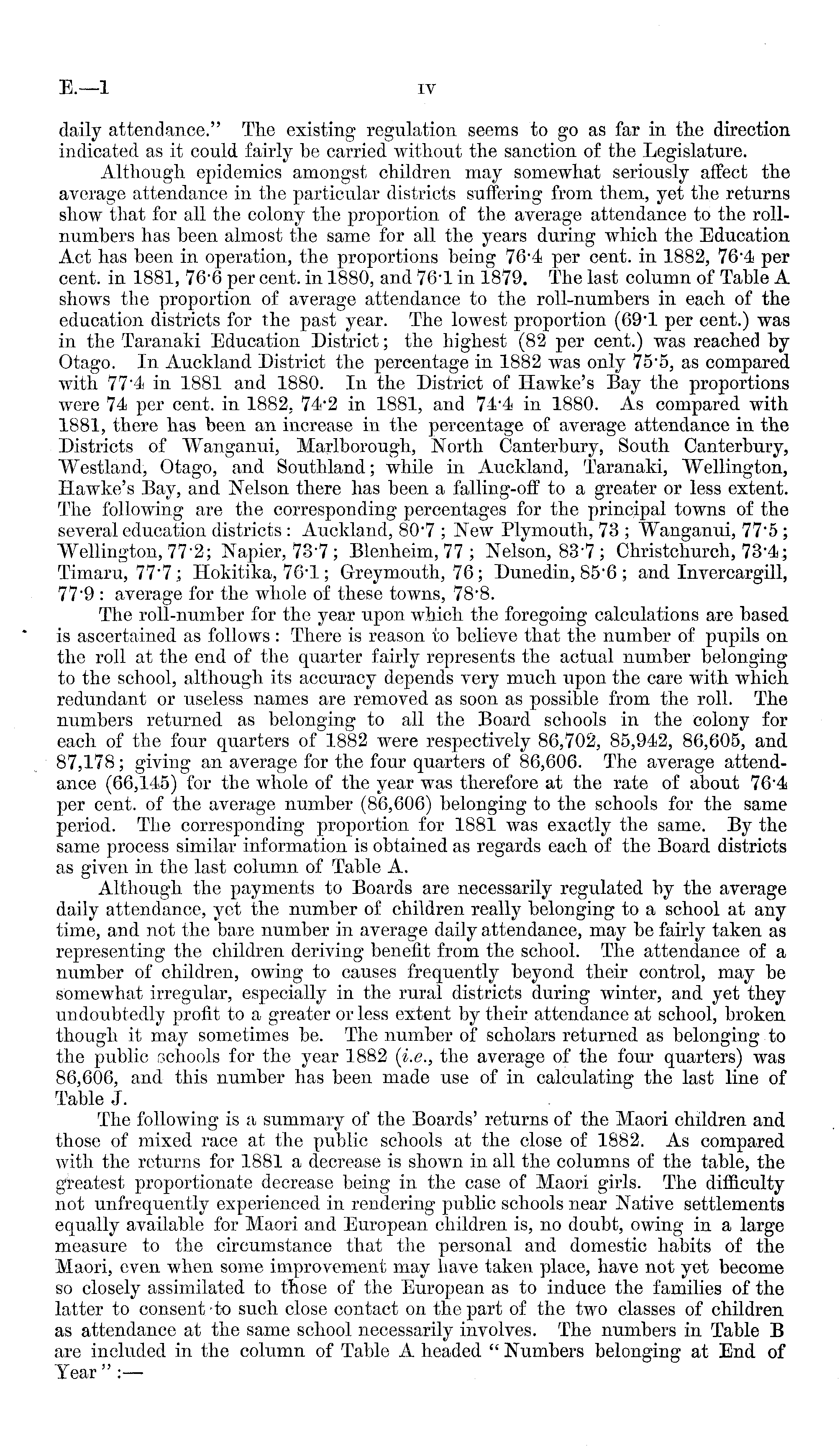 daily attendance." The existing regulation seems to go as far in the direction indicated as it could fairly be carried without the sanction of the Legislature. Although epidemics amongst children may somewhat seriously affect the average attendance in the particular districts suffering from them, yet the returns show that for all the colony the proportion of the average attendance to the rollnumbers has been almost the same for all the years during which the Education Act has been in operation, the proportions being 76"4 per cent, in 1882, 76*4 per cent, in 1881, 76-6 per cent, in 1880, and 76-1 in 1879. The last column of Table A shows the proportion of average attendance to the roll-numbers in each of the education districts for the past year. The lowest proportion (69"1 per cent.) was in the Taranaki Education District; the highest (82 per cent.) was reached by Otago. In Auckland District the percentage in 1882 was only 75*5, as compared with 774 in 1881 and 1880. In the District of Hawke's Bay the proportions were 74 per cent, in 1882. 74-2 in 1881, and 74-4 in 1880. As compared with 1881, there has been an increase in the percentage of average attendance in the Districts of Wanganui, Marlborough, North Canterbury, South Canterbury, Westland, Otago, and Southland; while in Auckland, Taranaki, Wellington, Hawke's Bay, and Nelson there has been a falling-off to a greater or less extent. The following are the corresponding percentages for the principal towns of the several education districts : Auckland, 80*7 ; New Plymouth, 73 ; Wanganui, 77*5; Wellington, 772; Napier, 73-7 ; Blenheim, 77 ; Nelson, 83-7; Christchurch, 734; Timaru, 777; Hokitika, 76-l; Greymouth, 76; Dunedin, 85"6; and Invercargill, 77"9 : average for the whole of these towns, 78*8. The roll-number for the year upon which the foregoing calculations are based is ascertained as follows : There is reason to believe that the number of pupils on the roll at the end of the quarter fairly represents the actual number belonging to the school, although its accuracy depends very much upon the care with which redundant or useless names are removed as soon as possible from the roll. The numbers returned as belonging to all the Board schools in the colony for each of the four quarters of 1882 were respectively 86,702, 85,942, 86,605, and 87,178; giving an average for the four quarters of 86,606. The average attendance (66,145) for the whole of the year was therefore at the rate of about 76"4 per cent, of the average number (86,606) belonging to the schools for the same period. The corresponding proportion for 1881 was exactly the same. By the same process similar information is obtained as regards each of the Board districts as given in the last column of Table A. Although the payments to Boards are necessarily regulated by the average daily attendance, yet the number of children really belonging to a school at any time, and not the bare number in average daily attendance, may be fairly taken as representing the children deriving benefit from the school. The attendance of a number of children, owing to causes frequently beyond their control, may be somewhat irregular, especially in the rural districts during winter, and yet they undoubtedly profit to a greater or less extent by their attendance at school, broken though it may sometimes be. The number of scholars returned as belonging to the public schools for the year 1882 (i.e., the average of the four quarters) was 86,606, and this number has been made use of in calculating the last line of Table J. The following is a summary of the Boards' returns of the Maori children and those of mixed race at the public schools at the close of 1882. As compared with the returns for 1881 a decrease is shown in all the columns of the table, the greatest proportionate decrease being in the case of Maori girls. The difficulty not unfrequently experienced in rendering public schools near Native settlements equally available for Maori and European children is, no doubt, owing in a large measure to the circumstance that the personal and domestic habits of the Maori, even when some improvement may have taken place, have not yet become so closely assimilated to those of the European as to induce the families of the latter to consent-to such close contact on the part of the two classes of children as attendance at the same school necessarily involves. The numbers in Table B are included in the column of Table A headed " Numbers belonging at End of Year " :—