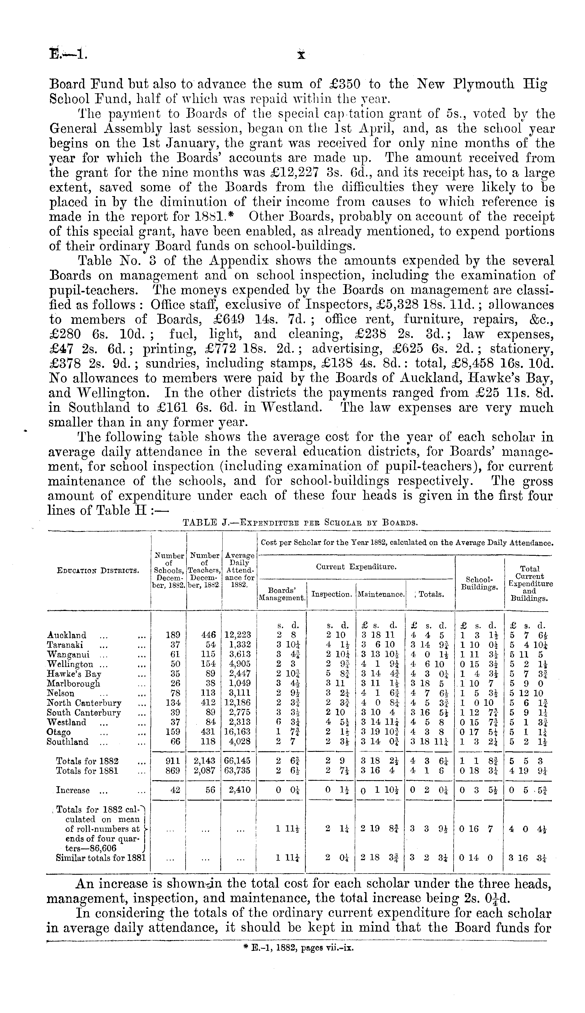 Board Fund but also to advance the sum of £350 to the New Plymouth His: School Fund, half of which was repaid within the year. The payment to Boards of the special captation grant of 55., voted by the General Assembly last session, began on the Ist April, and, as the school year begins on the Ist January, the grant was received for only nine months of the year for which the Boards' accounts are made up. The amount received from the grant for the nine months was £12,227 3s. 6d., and its receipt has, to a large extent, saved some of the Boards from the difficulties they were likely to be placed in by the diminution of their income from causes to which reference is made in the report for 1881.* Other Boards, probably on account of the receipt of this special grant, have been enabled, as already mentioned, to expend portions of their ordinary Board funds on school-buildings. Table No. 3 of the Appendix shows the amounts expended by the several Boards on management and. on school inspection, including the examination of pupil-teachers. The moneys expended by the Boards on management are classified as follows : Office staff, exclusive of Inspectors, £5,328 18s. lid.; allowances to members of Boards, £649 14s. 7d. ; office rent, furniture, repairs, &c, £280 6s. lOd. ; fuel, light, and cleaning, £238 2s. 3d.; law expenses, £47 2s. 6d. ; printing, £772 18s. 2d. ; advertising, £625 6s. 2d.; stationery, £378 2s. 9d.; sundries, including stamps, £138 4s. Bd.: total, £8,458 16s. lOd. No allowances to members were paid by the Boards of Auckland, Hawke's Bay, and Wellington. In the other districts the payments ranged from £25 11s. Bd. in Southland to £161 6s. 6d. in "Westland. The law expenses are very much smaller than in any former year. The following table shows the average cost for the year of each scholar in average daily attendance in the several education districts, for Boards' management, for school inspection (including examination of pupil-teachers), for current maintenance of the schools, and for school-buildings respectively. The gross amount of expenditure under each of these four heads is given in the first four lines of Table II:—