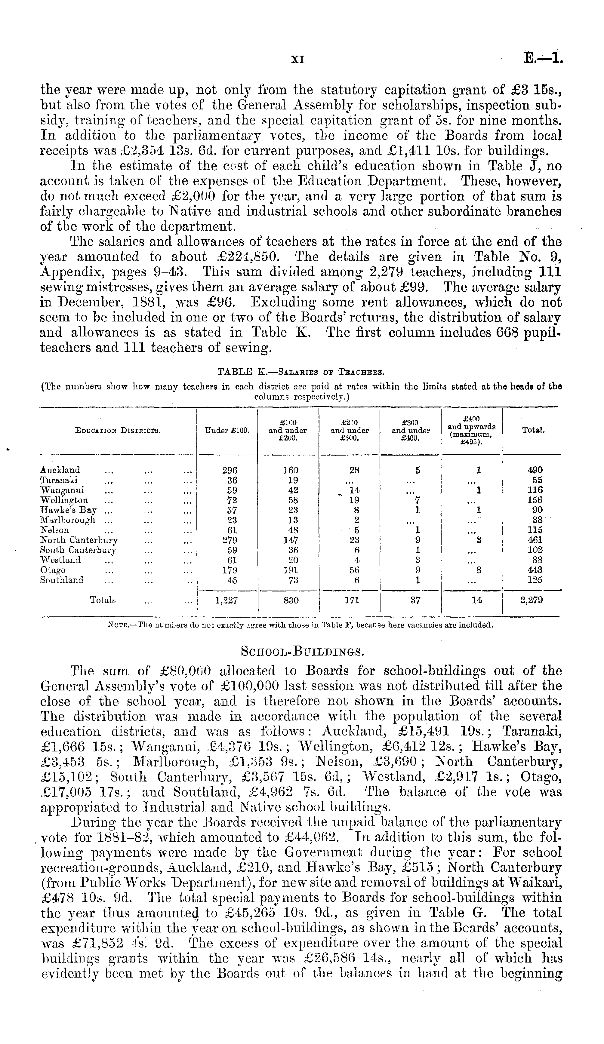 the year were made up, not only from the statutory capitation grant of £3 155., but also from the votes of the General Assembly for scholarships, inspection subsidy, training of teachers, and the special capitation grant of ss. for nine months. In addition to the parliamentary votes, the income of the Boards from local receipts was £2,354 13s. 6d. for current purposes, and £1,411 10s. for buildings. In the estimate of the cost of each child's education shown in Table J, no account is taken of the expenses of the Education Department. These, however, do not much exceed £2,000 for the year, and a very large portion of that sum is fairly chargeable to Native and industrial schools and other subordinate branches of the work of the department. The salaries and allowances of teachers at the rates in force at the end of the year amounted to about £224,850. The details are given in Table No. 9, Appendix, pages 9-43. This sum divided among 2,279 teachers, including 111 sewing mistresses, gives them an average salary of about £99. The average salary in December, 1881, .was £96. Excluding some rent allowances, which do not seem to be included in one or two of the Boards' returns, the distribution of salary and allowances is as stated in Table K. The first column includes 668 pupilteachers and 111 teachers of sewing.