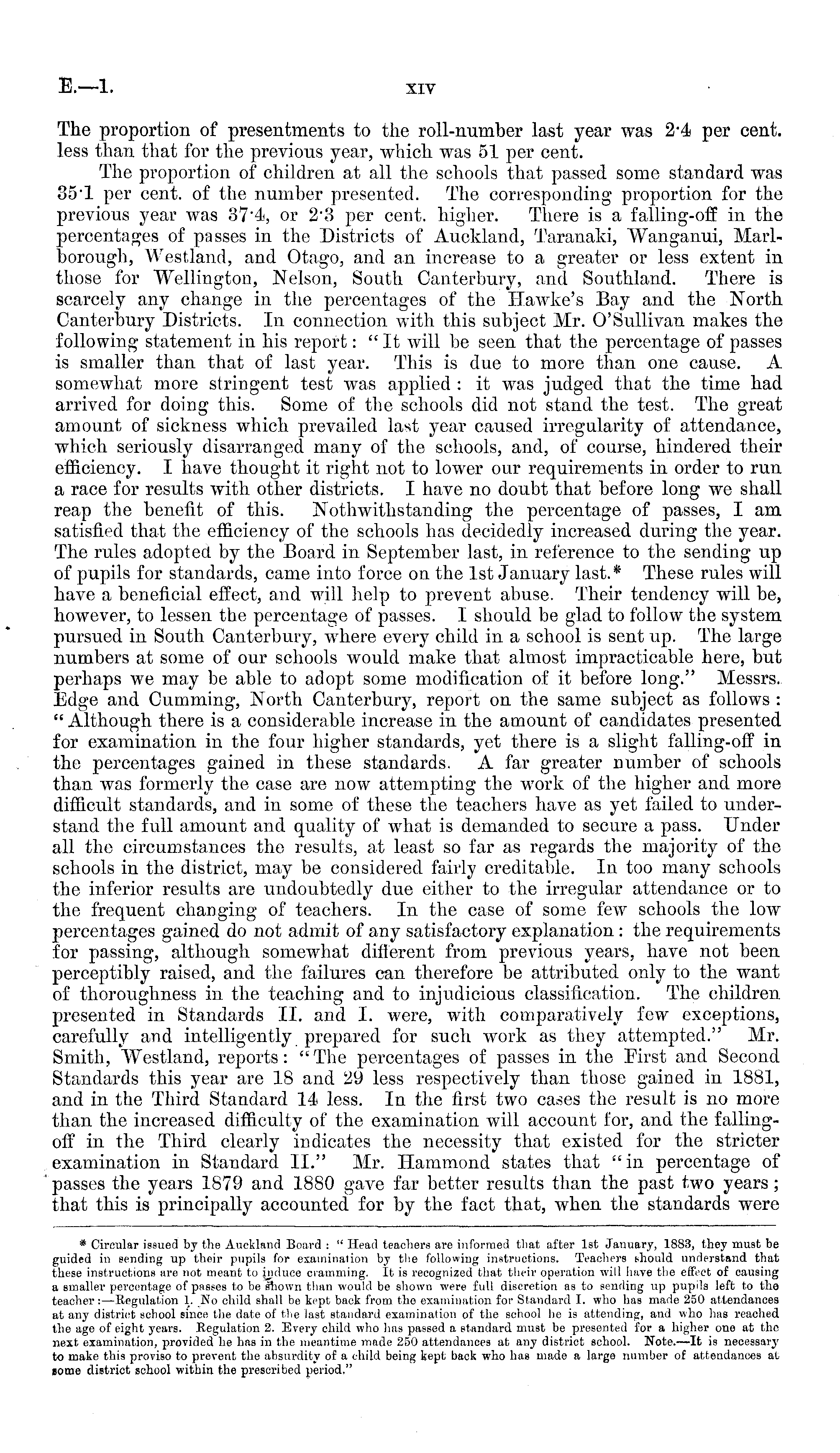 * Circular issued by the Auckland Board : " Head teachers are informed that after 1st January, 1883, they must be guided in sending up their pupils for examination by the following instructions. Teachers should understand that these instructions are not meant to niduce cramming. It is recognized that their operation "will have the effect of causing a smaller percentage of paBses to be shown than would be shown were full discretion as to sending up pupils left to the teacher:—Regulation 1. No child shall be kept back from the examination for Standard I. who has made 250 attendances at any district school since the date of the last standard examination of the school he is attending, and who has reached the age of eight years. Regulation 2. Every child who has passed a standard must be presented for a higher one at the next examination, provided he has in the meantime made 250 attendances at any district school. Note.—It is necessary to make this proviso to prevent the absurdity of a child being kept back who has made a large number of attendances at some district school within the prescribed period."