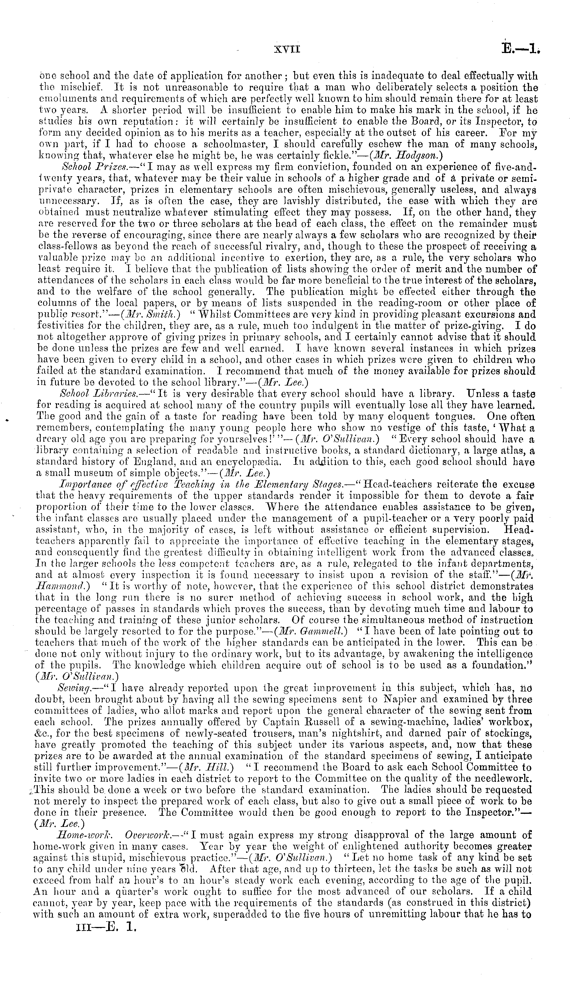 one school and the date of application for another ; but even this is inadequate to deal effectually with the mischief. It is not unreasonable to require that a man who deliberately selects a position the emoluments and requirements of which are perfectly well known to him should remain there for at least two years. A shorter period will be insufficient to enable him to make his mark in the school, if he studies his own reputation: it will certainly be insufficient to enable the Board, or its Inspector, to form any decided opinion as to his merits as a teacher, especially at the outset of his career. ]?or my own part, if I had to choose a schoolmaster, I should carefully eschew the man of many schools, knowing that, whatever else he might be, he was certainly fickle." — (Mr. Hodgson.) Softool Prizes. —"I may as well express my firm conviction, founded on an experience of fivo-and-iwenty years, that, whatever may be their value in schools of a higher grade and of a private or semiprivate character, prizes in elementary schools are often mischievous, generally useless, and always unnecessary. If, as is often the case, they are lavishly distributed, the ease with which they are obtained must neutralize whatever stimulating effect they may possess. If, on the other hand, they are reserved for the two or three scholars at the head of each class, the effect on the remainder must be the reverse of encouraging, since, there are nearly always a few scholars who are recognized by their class-fellows as beyond the reach of successful rivalry, and, though to these the prospect of receiving a valuable prize may be an additional incentive to exertion, they are, as a rule, the very scholars who least require it. I believe that the publication of lists showing the order of merit and the number of attendances of the scholars in each class would be far more beneficial to the true interest of the scholars, and to the welfare of the school generally. The publication might be effected either through the columns of the local papers, or by means of lists suspended in the reading-room or other place of public resort."— (Mr. Smith.) " Whilst Committees are very kind in providing pleasant excursions and festivities for the children, they are, as a rule, much too indulgent in the matter of prize-giving. Ido not altogether approve of giving prizes in primary schools, and I certainly cannot advise that it should be done unless the prizes are few and well earned. I have known several instances in which prizes have been given to every child in a school, and other cases in which prizes were given to children who failed at the standard examination. I recommend that much of the money available for prizes should in future be devoted to the school library."— (Mr. Lee.) School Libraries.— 11 It is very desirable that every school should have a library. Unless a taste for reading is acquired at school many of the country pupils will eventually lose all they have learned. The good and the gain of a taste for reading have been told by many eloquent tongues. One often, remembers, contemplating the many young people here who show no vestige of this taste, ' What a dreary old ago you are preparing for yourselves!' " — (Mr. o''Sullivan.) "Every school should have a library containing a selection of readable and instructive books, a standard dictionary, a large atlas, a standard history of England, and an encyclopaedia. In addition to this, each good school should have a small museum of simple objects." — (Mr. Lee.) Importance of effective Teaching in the Elementary Stages. —" Head-teachers reiterate the excuse that the heavy requirements of the upper standards render it impossible for them to devote a fair proportion of their time to the lower classes. Where the attendance enables assistance to be given, the infant classes are usually placed under the management of a pupil-teacher or a Very poorly paid assistant, who, in the majority of cases, is left without assistance or efficient supervision. Headteachers apparently fail to appreciate the importance of effective teaching in the elementary stages^ and consequently find the greatest difficulty in obtaining intelligent work from the advanced classes, In the larger schools the less competent teachers are, as a rule, relegated to the infant departments, and at almost every inspection it is found necessary to insist upon a revision of the staff."— (Mr. Hammond.) "It is worthy of note, however, that the experience of this school district demonstrates that in the long run there is no surer method of achieving success in school work, and the high, percentage of passes in standards which proves the success, than by devoting much time and labour to the teaching and training of these junior scholars. Of course the simultaneous method of instruction should bo largely resorted to for the purpose." — (Mr. Gammell.) "I have been of late pointing out to teachers that much of the work of the higher standards can be anticipated in the lower. This can be done not only without injury to the ordinary work, but to its advantage, by awakening the intelligence of the pupils. The knowledge which children acquire out of school is to be used as a foundation.'' (Mr. O'SulUvan.) Sewing. —"I have already reported upon the great improvement in this subject, which has, no" doubt, been brought about by having all the sewing specimens sent to Napier and examined by three committees of ladies, who allot marks and report upon the general character of the sewing sent from each school. The prizes annually offered by Captain Russell of a sewing-machine, ladies' workbox, &c, for the best specimens of newly-seated trousers, man's nightshirt, and darned pair of stockings, have greatly promoted the teaching of this subject under its various aspects, and, vow that these prizes are to be awarded at the annual examination of the standard specimens of sewing, I anticipate still further improvement."— 