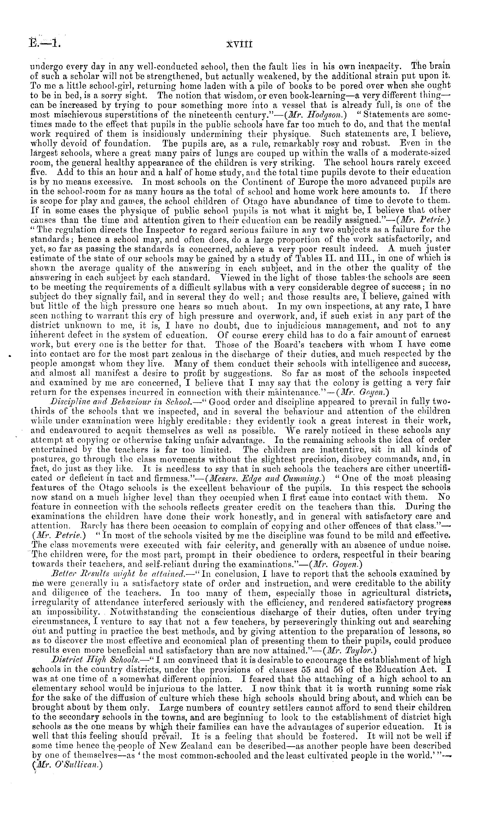 undergo every day in any well-conducted school, then the fault lies in his own incapacity. The brain of such a scholar will not be strengthened, but actually weakened, by the additional strain put upon it. To me a little school-girl, returning home laden with a pile of books to be pored over when she ought to be in bed, is a sorry sight. The notion that wisdom, or even book-learning—a very different thing— can be increased by trying to pour something more into a vessel that is already full, is one of the most mischievous superstitions of the nineteenth century." — (Mr. Hodgson.) " Statements are sometimes made to the effect that pupils in the public schools have far too much to do, and that the mental work required of them is insidiously undermining their physique. Such statements are, I believe, wholly devoid of foundation. The pupils are, as a rale, remarkably rosy and robust. Even in the largest schools, where a great many pairs of lungs are couped up within the walls of a moderate-sized room, the general healthy appearance of the children is very striking. The school hours rarely exceed five. Add to this an hour and a half of home study, and the total time pupils devote to their education is by no means excessive. In most schools on the Continent of Europe the more advanced pupils are in the school-room for as many hours as the total of school and home work here amounts to. If there is scope for play and games, the school children of Otago have abundance of time to devote to them. If in some cases the physique of public school pupils is not what it might be, I believe that other causes than the time and attention given to their education can be readily assigned."' — -{Mr. Petrie.) "The regulation directs the Inspector to regard serious failure in any two subjects as a failure for the standards; hence a school may, and often does, do a large proportion of the work satisfactorily, and yet, so far as passing the standards is concerned, achieve a very poor result indeed. A much juster estimate of the state of our schools may be gained by a study of Tables 11. and 111., in one of which is shown the average quality of the answering in each subject, and in the other the quality of the answering in each subject by each standard. Viewed in the light of those tables-the schools are seen to be meeting the requirements of a difficult syllabus with a very considerable degree of success; in no subject do they signally fail, and in several they do well; and those results are, I believe, gained with but little of the high pressure one hears so much about. In my own inspections, at any rate, I have seen nothing to warrant this cry of high pressure and overwork, and, if such exist in any part of the district unknown to mo, it is, I have no doubt, due to injudicious management, and not to any inherent defect in the system of education. Of course every child has to do a fair amount of earnest work, but every one is the better for that. Those of the Board's teachers with whom I have come into contact arc for the most part zealous in the discharge of their duties, and much respected by the people amongst whom they live. Many of them conduct their schools with intelligence and success, and almost all manifest a desire to profit by suggestions. So far as most of the schools inspected and examined by me are concerned, I believe that I may say that the colony is getting a very fair return for the expenses incurred in connection with their maintenance." — (Mr. Goyen.~) Discipline and Behaviour in School. —" Good order and discipline appeared to prevail in fully twothirds of the schools that we inspected, and in several the behaviour and attention of the children while under examination were highly creditable: they evidently took a great interest in their work, and endeavoured to acquit themselves as well as possible. ¥c rarely noticed in these schools any attempt at copying or otherwise taking unfair advantage. In the remaining schools the idea of order entertained by the teachers is far too limited. The children are inattentive, sit in all kinds of postures, go through the class movements without the slightest precision, disobey commands, and, in fact, do just as they like. It is needless to say that in such schools the teachers are cither uncertificated or deficient in tact and firmness."— (Messrs. Edge and Gumming?) " One of the most pleasing features of the Otago schools is the excellent behaviour of the pupils. In this respect the schools now stand on a much higher level than they occupied when I first came into contact with them. No feature in connection with the schools reflects greater credit on the teachers than this. During the examinations the children have done their work honestly, and in general with satisfactory care and attention. Barely has there been occasion to complain of copying and other offences of that class." — (Mr. Petrie.) "In most of the schools visited by me the discipline was found to be mild and effective. The class movements were executed with fair celerity, and generally with an absence of undue noise. 'The children were, for the most part, prompt in their obedience to orders, respectful in their bearing towards their teachers, and self-reliant during the examinations."— (Mr. Goyen.) Better Results might be attained. —"ln conclusion, I have to report that the schools examined by me were generally in a satisfactory state of order and instruction, and were creditable to the ability and diligence of the teachers. In too many of them, especially those in agricultural districts, irregularity of attendance interfered seriously with the efficiency, and rendered satisfactory progress an impossibility. Notwithstanding the conscientious discharge of their duties, often under trying circumstances, I venture to say that not a few teachers, by perseveringly thinking out and searching out and putting in practice the best methods, and by giving attention to the preparation