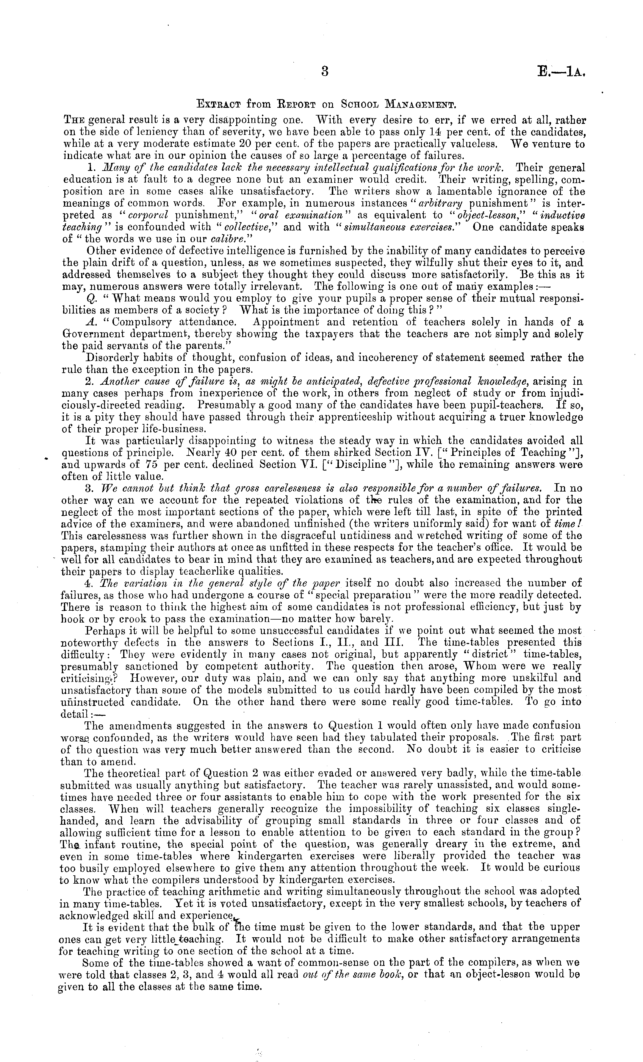 Extract from Eepobt on School Management. The general result is a very disappointing one. With every desire to err, if we erred at all, rather on the side of leniency than of severity, we have been able to pass only 14 per cent, of the candidates, while at a very moderate estimate 20 per cent, of the papers are practically valueless. We venture to indicate what are in our opinion the causes of so large a percentage of failures. 1. Many of the candidates lack the necessary intellectual qualifications for the work. Their general education is at fault to a degree none but an examiner would credit. Their writing, spelling, composition are in some cases alike unsatisfactory. The writers show a lamentable ignorance of the meanings of common words. For example, in numerous instances " arbitrary punishment" is interpreted as "corporal punishment," "oral examination" as equivalent to "object-lesson," "inductive teaching "is confounded with "collective," and with " simultaneous exercises." One candidate speaks of " the words we use in our calibre." Other evidence of defective intelligence is furnished by the inability of many candidates to perceive the plain drift of a question, unless, as we sometimes suspected, they wilfully shut their eyes to it, and addressed themselves to a subject they thought they could discuss more satisfactorily. Be this as it may, numerous answers were totally irrelevant. The following is one out of many examples:— Q. " What means would you employ to give your pupils a proper sense of their mutual responsibilities as members of a society ? What is the importance of doing this ? " A. " Compulsory attendance. Appointment and retention of teachers solely in hands of a Government department, thereby showing the taxpayers that the teachers are not simply and solely the paid servants of the parents." Disorderly habits of thought, confusion of ideas, and incoherency of statement seemed rather the rule than the exception in the papers. 2. Another cause of failure is, as might be anticipated, defective professional knowledge, arising in many cases perhaps from inexperience of the work, in others from neglect of study or from injudi-ciously-directed reading. Presumably a good many of the candidates have been pupil-teachers. If so, it is a pity they should have passed through their apprenticeship without acquiring a truer knowledge of their proper life-business. It was particularly disappointing to witness the steady way in which the candidates avoided all questions of principle. Nearly 40 per cent, of them shirked Section IV. ["Principles of Teaching"], and upwards of 75 per cent, declined Section VI. ["Discipline"], while the remaining answers were often of little value. 3. We cannot but think that gross carelessness is also responsible for a number of failures. In no other way can we account for the repeated violations of tl*e rules of the examination, and for the neglect of the most important sections of the paper, which were left till last, in spite of the printed advice of the examiners, and were abandoned unfinished (the writers uniformly said) for want of time! This carelessness was further shown in the disgraceful untidiness and wretched writing of some of the papers, stamping their authors at once as unfitted in these respects for the teacher's office. It would be well for all candidates to bear in mind that they are examined as teachers, and are expected throughout their papers to display teacherlike qualities. 4. The variation in the general style of the paper itself no doubt also increased the number of failures, as those who had undergone a course of " special preparation " were the more readily detected. There is reason to think the highest aim of some candidates is not professional efficiency, but just by hook or by crook to pass the examination —no matter how barely. Perhaps it will be helpful to some unsuccessful candidates if we point out what seemed the most noteworthy defects in the answers to Seclions 1., 11., and 111. The time-tables presented this difficulty: They were evidently in many cases not original, but apparently " district" time-tables, presumably sanctioned by competent authority. The question then arose, Whom were we really criticising*? However, our duty was plain, and we can only say that anything more unskilful and unsatisfactory than some of the models submitted to us could hardly have been compiled by the most uiiinstructed candidate. On the other hand there were some really good time-tables. To go into detail:— The amendments suggested in the answers to Question 1 would often only have made confusion worse confounded, as the writers would have seen had they tabulated their proposals. The first part of the question was very much better answered than the second. No doubt it is easier to criticise than to amend. The theoretical part of Question 2 was either evaded or answered very badly, while the time-table submitted was usually anything but satisfactory. The teacher was rarely unassisted, and would sometimes have needed three or four assistants to enable him to cope with the work presented for the six classes. When will teachers generally recognize the impossibility of teaching six classes singlehanded, and learn the advisability of grouping small standards in three or four classes and of allowing sufficient time for a lesson to enable attention to be given to each standard in the group? The infant routine, the special point of the question, was generally dreary in the extreme, and even in some time-tables where kindergarten exercises were liberally provided the teacher was too busily employed elsewhere to give them any attention throughout the week. It would be curious to know what the compilers understood by kindergarten exercises. The practice of teaching arithmetic and writing simultaneously throughout the school was adopted in many time-tables. Yet it is voted unsatisfactory, except in the very smallest schools, by teachers of ackn