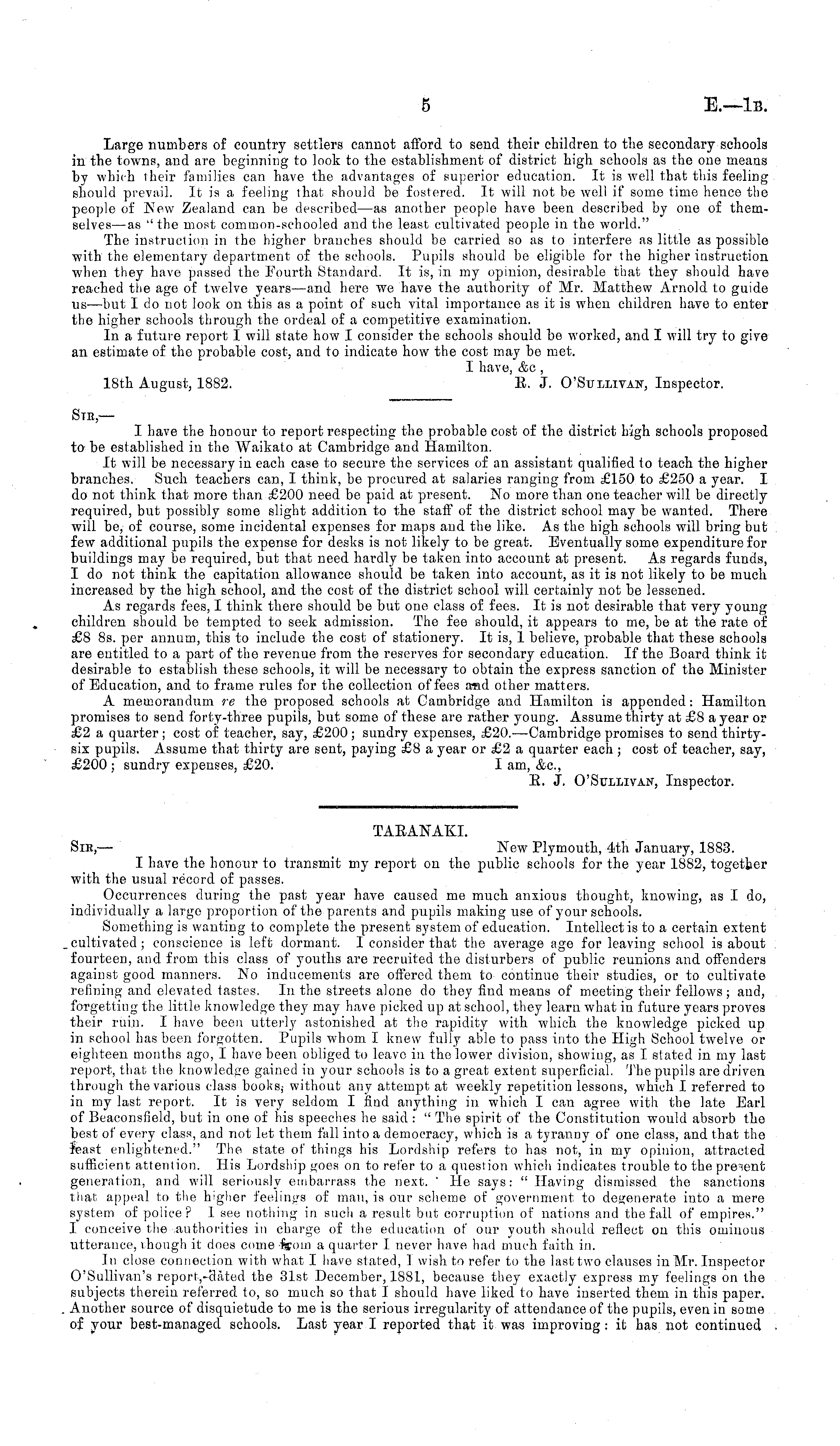Large numbers of country settlers cannot afford to send their children to the secondary schools in the towns, and are beginning to look to the establishment of district high schools as the one means by which iheir families can have the advantages of superior education. It is well that this feeling should prevail. It is a feeling that should be fostered. It will not be well if some time hence the people of New Zealand can be described—as another people have been described by one of themselves — as " the most common-schooled and the least cultivated people in the world." The instruction in the higher branches should be carried so as to interfere as little as possible with the elementary department of the schools. Pupils should bo eligible for the higher instruction when they have passed the Fourth Standard. It is, in my opinion, desirable that they should have reached the age of twelve years —and here we have the authority of Mr. Matthew Arnold to guide us —but I do not look on this as a point of such vital importance as it is when children have to enter the higher schools through the ordeal of a competitive examination. In a future report I will state how I consider the schools should be worked, and I will try to give an estimate of the probable cost, and to indicate how the cost may be met. I have, &c , 18th August, 1882. It. J. O'Sullivan, Inspector.