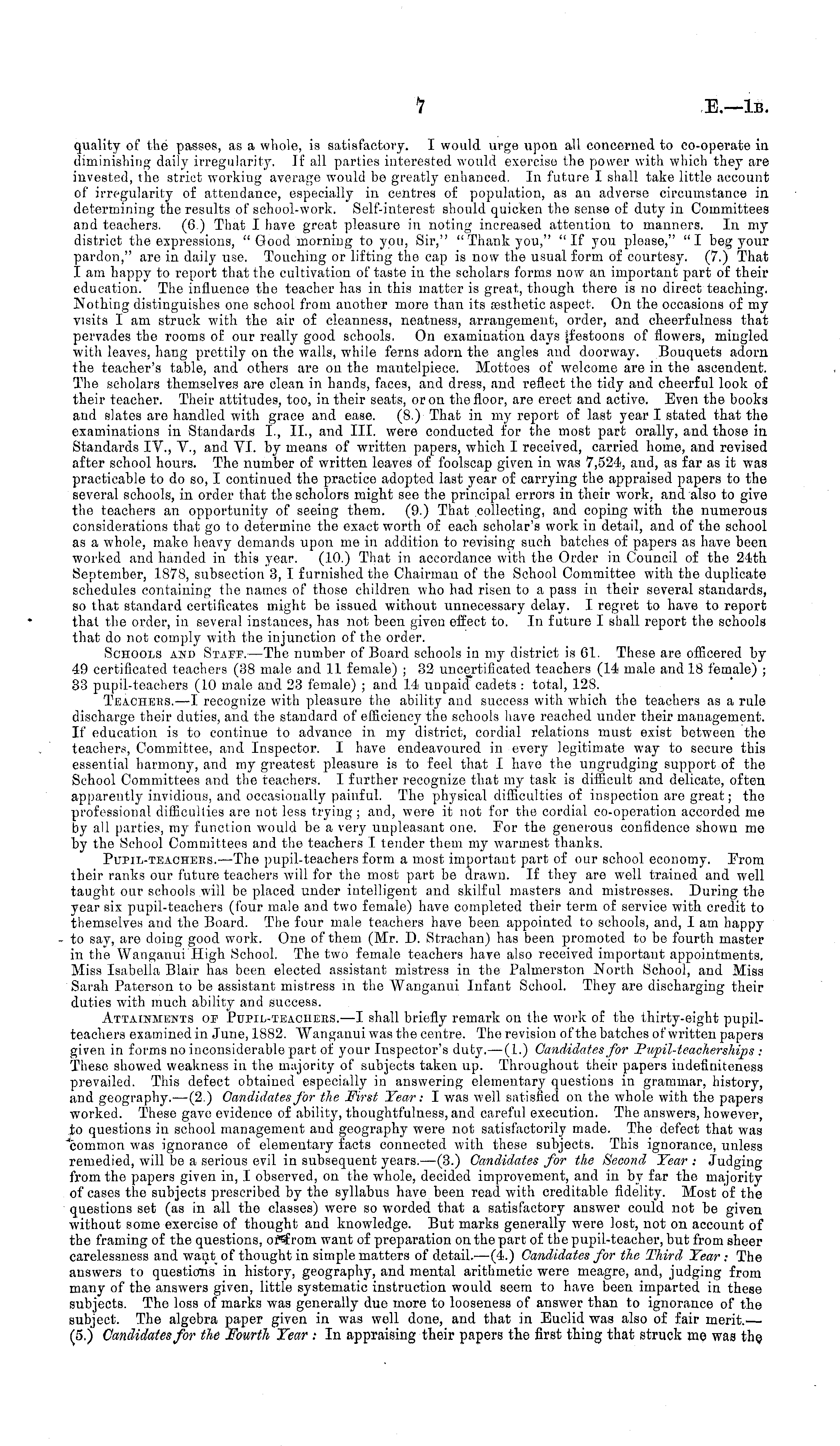 quality of the passes, as a whole, is satisfactory. I would urge upon all concerned to co-operate in diminishing daily irregularity. If all parties interested would exercise the power with which they are invested, the strict working average would be greatly enhanced. In future I shall take little account of irregularity of attendance, especially in centres of population, as an adverse circumstance in determining the results of school-work. Self-interest should quicken the sense of duty in Committees and teachers. (6.) That I have great pleasure in noting increased attention to manners. In my district the expressions, "Good morning to you, Sir," "Thank you," "If you please," "I beg your pardon," are in daily use. Touching or lifting the cap is now the usual form of courtesy. (7.) That I am happv to report that the cultivation of taste in the scholars forms now an important part of their education. The influence the teacher has in this matter is great, though there is no direct teaching. Nothing distinguishes one school from another more than its aesthetic aspect. On the occasions of my visits I am struck with the air of cleanness, neatness, arrangement, order, and cheerfulness that pervades the rooms of our really good schools. On examination days Ifestoons of flowers, mingled with leaves, hang prettily on the walls, while ferns adorn the angles and doorway. Bouquets adorn the teacher's table, and others are on the mantelpiece. Mottoes of welcome are in the ascendent. The scholars themselves are clean in hands, faces, and dress, and reflect the tidy and cheerful look of their teacher. Their attitudes, too, in their seats, or on the floor, are erect and active. Even the books and slates are handled with grace and ease. (8.) That in my report of last year I stated that the examinations in Standards 1., 11., and 111. were conducted for the most part orally, and those in Standards IV., V., and VI. by means of written papers, which I received, carried home, and revised after school hours. The number of written leaves of foolscap given in was 7,524, and, as far as it was practicable to do so, I continued the practice adopted last year of carrying the appraised papers to the several schools, in order that the scholors might see the principal errors in their work, and also to give the teachers an opportunity of seeing them. (9.) That collecting, and coping with the numerous considerations that go to determine the exact worth of each scholar's work in detail, and of the school as a whole, make heavy demands upon me in addition to revising such batches of papers as have been worked and handed in this year. (10.) That in accordance with the Order in Council of the 24th September, 1878, subsection 3, I furnished the Chairman of the School Committee with the duplicate schedules containing the names of those children who had risen to a pass in their several standards, so that standard certificates might be issued without unnecessary delay. I regret to have to report that the order, in several instances, has not been given effect to. In future I shall report the schools that do not comply with the injunction of the order. Schools and Staff. —The number of Board schools in my district is 61. These are officered by 49 certificated teachers (38 male and 11 female) ; 32 uncertifieatod teachers (14 male and 18 female) ; 33 pupil-teachers (10 male and 23 female) ; and 14 unpaid cadets : total, 128. Tkachehs.—l recognize with pleasure the ability and success with which the teachers as a rule discharge their duties, and the standard of efficiency the schools have reached under their management. If education is to continue to advance in my district, cordial relations must exist between the teachers, Committee, and Inspector. I have endeavoured in every legitimate way to secure this essential harmony, and my greatest pleasure is to feel that I have the ungrudging support of the School Committees and the teachers. I further recognize that my task is difficult and delicate, often apparently invidious, and occasionally painful. The physical difficulties of inspection are great; the professional difficulties are not less trying; and, were it not for the cordial co-operation accorded me by all parties, my function would be a very unpleasant one. For the generous confidence shown me by the School Committees and the teachers I tender them my warmest thanks. Pupil-teachees.—The pupil-teachers form a most important part of our school economy. From their ranks our future teachers will for the most part be drawn. If they are well trained and well taught our schools will be placed under intelligent and skilful masters and mistresses. During the year six pupil-teachers (four male and two female) have completed their term of service with credit to themselves and the Board. The four male teachers have been appointed to schools, and, lam happy to say, are doing good work. One of them (Mr. D. Strachan) has been promoted to be fourth master in the Wanganui High School. The two female teachers have also received important appointments. Miss Isabella Blair has been elected assistant mistress in the Palmerston North School, and Miss Sarah Paterson to be assistant mistress in the Wanganui Infant School. They are discharging their duties with much ability and success. Attainments of Pupiii-TEACUEBS.—I shall briefly remark on the work of the thirty-eight pupilteachers examined in June, 1882. Wanganui was the centre. The revision of the batches of written papers given in forms no inconsiderable part of your Inspector's duty. — (1.) Candidates for JPupil-teacherships : These showed weakness in the majority of subjects taken up. Throughout their papers indefiniteness prevailed. This defect obtained especially in answering elementary questions in grammar, history, and geography. —(2.) Candidates for the First Year: I was well satisfied on the whole with the papers worked. These gave evidence of ability, thoughtfulness, and caref