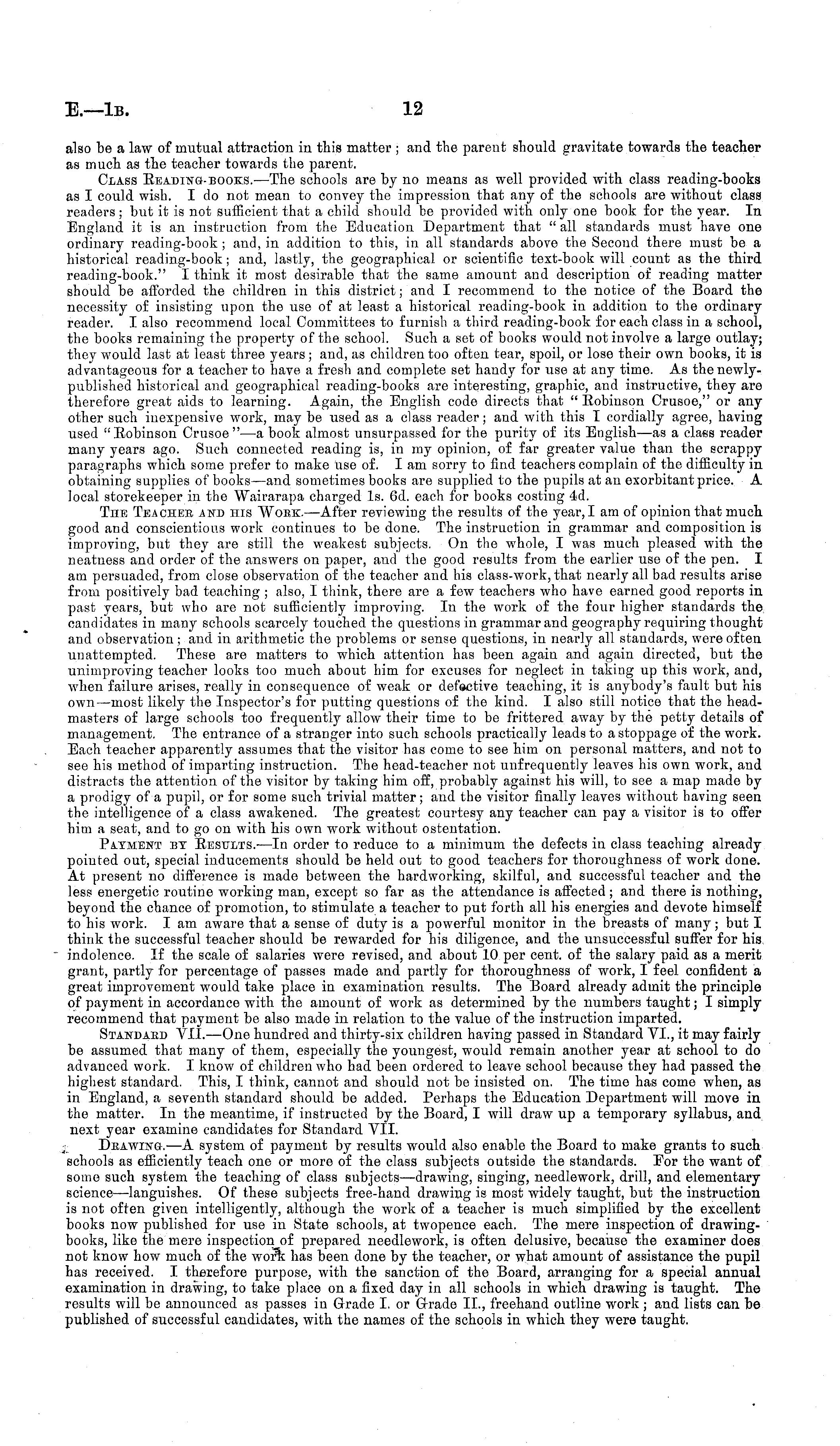 also be a law of mutual attraction in this matter ; and the parent should gravitate towards the teacher as much as the teacher towards the parent. Class Reading-books.—The schools are by no means as well provided with class reading-books as I could wish. I do not mean to convey the impression that any of the schools are without class readers ; but it is not sufficient that a child should be provided with only one book for the year. In England it is an instruction from the Education Department that " all standards must have one ordinary reading-book ; and, in addition to this, in all standards above the Second there must be a historical reading-book; and, lastly, the geographical or scientific text-book will count as the third reading-book." I think it most desirable that the same amount and description of reading matter should be afforded the children in this district; and I recommend to the notice of the Board the necessity of insisting upon the use of at least a historical reading-book in addition to the ordinary reader. I also recommend local Committees to furnish a third reading-book for each class in a school, the books remaining the property of the school. Such a set of books would not involve a large outlay; they would last at least three years ; and, as children too often tear, spoil, or lose their own books, it is advantageous for a teacher to have a fresh and complete set handy for use at any time. As the newlypublished historical and geographical reading-books are interesting, graphic, and instructive, they are therefore great aids to learning. Again, the English code directs that " Robinson Crusoe," or any other such inexpensive work, may be used as a class reader; and with this I cordially agree, having used "Robinson Crusoe"—a book almost unsurpassed for the purity of its English —as a class reader many years ago. Such connected reading is, in my opinion, of far greater value than the scrappy paragraphs which some prefer to make use of. lam sorry to find teachers complain of the difficulty in obtaining supplies of books —and sometimes books are supplied to the pupils at an exorbitant price. A local stoi'ekeeper in the Wairarapa charged Is. 6d. each for books costing 4d. The Teacher and his Wobk. —After reviewing the results of the year, I am of opinion that much good and conscientious work continues to be done. The instruction in grammar and composition is improving, but they are still the weakest subjects. On the whole, I was much pleased with the neatness and order of the answers on paper, and the good results from the earlier use of the pen. I am persuaded, from close observation of the teacher and his class-work, that nearly all bad results arise from positively bad teaching ; also, I think, there are a few teachers who have earned good reports in past years, but who are not sufficiently improving. In the work of the four higher standards the candidates in many schools scarcely touched the questions in grammar and geography requiring thought and observation; and in arithmetic the problems or sense questions, in nearly all standards, were often unattempted. These are matters to which attention has been again and again directed, but the unimproving teacher looks too much about him for excuses for neglect in taking up this work, and, when failure arises, really in consequence of weak or defective teaching, it is anybody's fault but his own —most likely the Inspector's for putting questions of the kind. I also still notice that the headmasters of large schools too frequently allow their time to be frittered away by the petty details of management. The entrance of a stranger into such schools practically leads to a stoppage of the work. Each teacher apparently assumes that the visitor has come to see him on personal matters, and not to see his method of imparting instruction. The head-teacher not unfrequently leaves his own work, and distracts the attention of the visitor by taking him off, probably against his will, to see a map made by a prodigy of a pupil, or for some such trivial matter; and the visitor finally leaves without having seen the intelligence of a class awakened. The greatest courtesy any teacher can pay a visitor is to offer him a seat, and to go on with his own work without ostentation. Payment by Results.- —In order to reduce to a minimum the defects in class teaching already pointed out, special inducements should be held out to good teachers for thoroughness of work done. At present no difference is made between the hardworking, skilful, and successful teacher and the less energetic routine working man, except so far as the attendance is affected; and there is nothing, beyond the chance of promotion, to stimulate a teacher to put forth all his energies and devote himself to his work. lam aware that a sense of duty is a powerful monitor in the breasts of many; but I think the successful teacher should be rewarded for his diligence, and the unsuccessful suffer for his indolence. If the scale of salaries were revised, and about 10 per cent, of the salary paid as a merit grant, partly for percentage of passes made and partly for thoroughness of work, I feel confident a great improvement would take place in examination results. The Board already admit the principle of payment in accordance with the amount of work as determined by the numbers taught; I simply recommend that payment be also made in relation to the value of the instruction imparted. Standard VII. —One hundred and thirty-six children having passed in Standard VI., it may fairly be assumed that many of them, especially the youngest, would remain another year at school to do advanced work. I know of children who had been ordered to leave school because they had passed the highest standard. This, I think, cannot and should not be insisted on. The time has come when, as in England, a seventh standard should be added. Perhaps the Education Department will move in the matter. In the mea