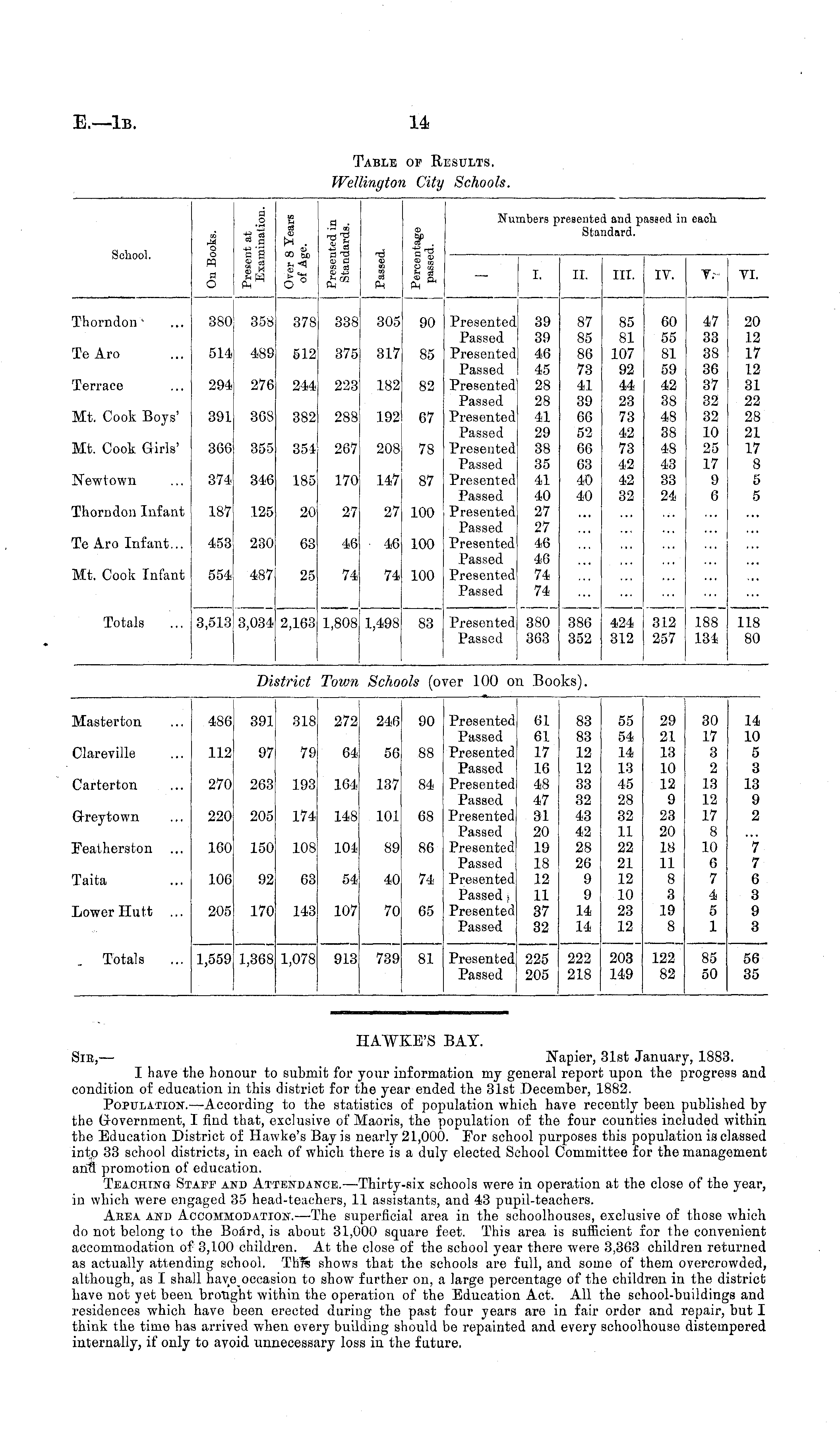 HAWKE'S BAT. Sib, — Napier, 31st January, 1883. I have the honour to submit for your information my general report upon the progress and condition of education in this district for the year ended the 31st December, 1882. Population.—-According to the statistics of population which have recently been published by the (Government, I find that, exclusive of Maoris, the population of the four counties included within the Education District of Hawke's Bay is nearly 21,000. For school purposes this population is classed into 33 school districts, in each of which there is a duly elected School Committee for the management anfl promotion of education. Teaching Staff and Attendance. —Thirty-six schools were in operation at the close of the year, in which were engaged 35 head-teachers, 11 assistants, and 43 pupil-teachers. Area and Accommodation. —The superficial area in the schoolhouses, exclusive of those which do not belong to the BoSrd, is about 31,000 square feet. This area is sufficient for the convenient accommodation of 3,100 children. At the close of the school year there were 3.363 children returned as actually attending school. This shows that the schools are full, and some of them overcrowded, although, as I shall have occasion to show further on, a large percentage of the children in the district have not yet been brought within the operation of the Education Act. All the school-buildings and residences which have been erected during the past four years are in fair order and repair, but I think the time has arrived when every building should be repainted and every schoolhouse distempered internally, if only to avoid unnecessary loss in the future.
