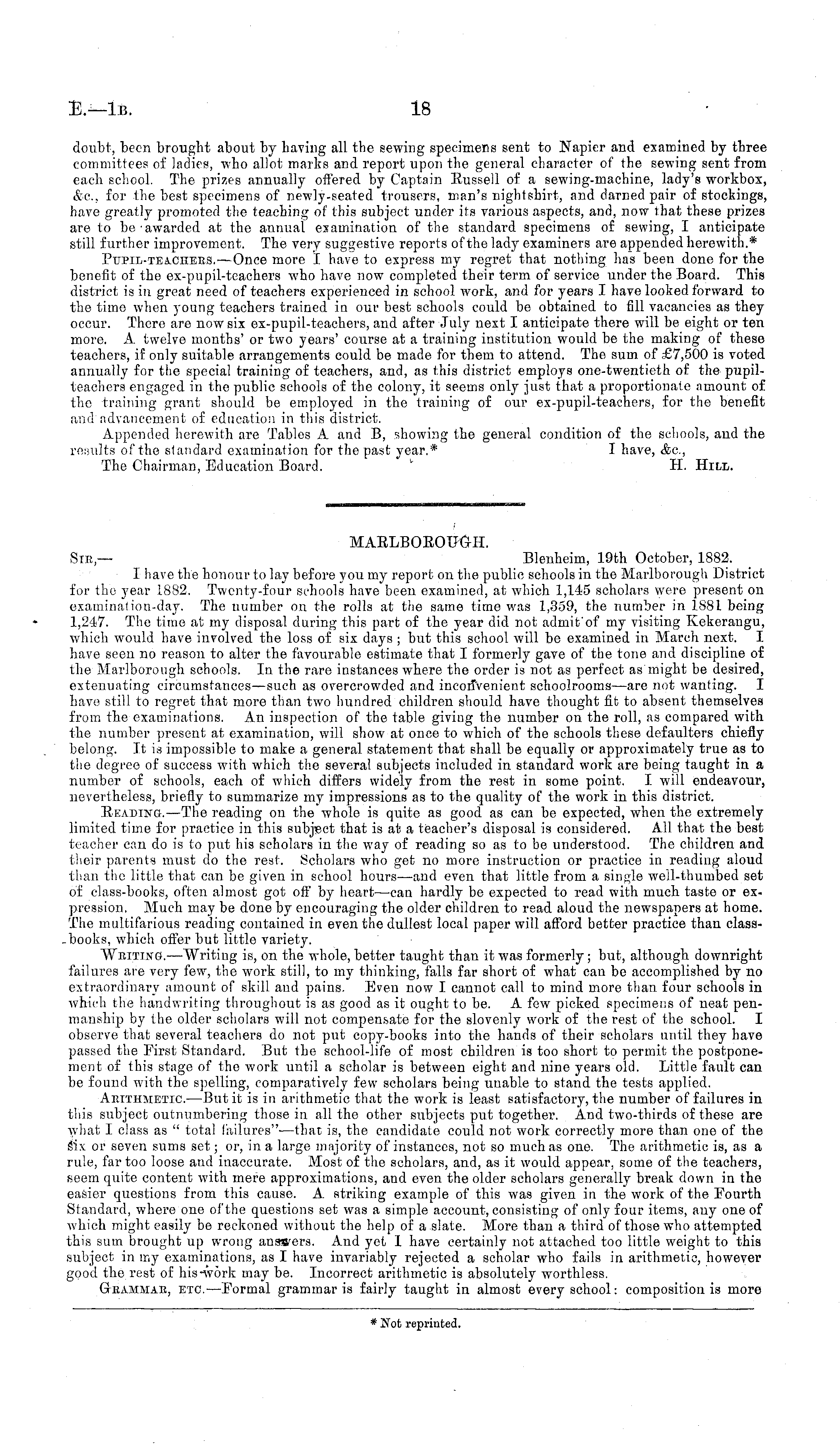 MAELBOKOUGH. Ste,— Blenheim, 19th. October, 1882. I have the honour to lay before you my report on the public schools in the Marlborough District for the year 1882. Twenty-four schools have been examined, at which 1,145 scholars were present on examination-day. The number on the rolls at the same time was 1,359, the number in 1881 being 1,247. Tho time at my disposal during this part of the year did not admit'of my visiting Kekerangu, which would have involved the loss of six days ; but this school will be examined in March next. I have seen no reason to alter the favourable estimate that I formerly gave of the tone and discipline of the Marlborough schools. In the rare instances where the order is not as perfect as might be desired, extenuating circumstances—such as overcrowded and. inconvenient schoolrooms—are not wanting. I have still to regret that more than two hundred children should have thought fit to absent themselves from the examinations. An inspection of the table giving the number on the roll, as compared with the number present at examination, will show at once to which of the schools these defaulters chiefly belong. It ia impossible to make a general statement that shall be equally or approximately true as to the degree of success with which the several subjects included in standard work are being taught in a number of schools, each of which differs widely from the rest in some point. I will endeavour, nevertheless, briefly to summarize my impressions as to the quality of the work in this district. Reading.—The reading on the whole is quite as good as can be expected, when the extremely limited time for practice in this subject that is at a teacher's disposal is considered. All that the best teacher can do is to put his scholars in the way of reading so as to be understood. The children and their parents must do the reat. Scholars who get no more instruction or practice in reading aloud than the little that can be given in school hours—and even that little from a single well-thumbed set of class-books, often almost got off by heart —can hardly be expected to read with much taste or expression. Much may be done by encouraging the older children to read aloud the newspapers at home. The multifarious reading contained in even the dullest local paper will afford better practice than class- - books, which offer but little variety. Wbitins.—Writing is, on the whole, better taught than it was formerly; but, although downright failures are very few, the work still, to my thinking, falls far short of what can be accomplished by no extraordinary amount of skill and pains. Even now I cannot call to mind more than four schools in which the handwriting throughout is as good as it ought to be. A few picked specimens of neat penmanship by the older scholars will not compensate for the slovenly work of the rest of the school. I observe that several teachers do not put copy-books into the hands of their scholars until they have passed the First Standard. But tho school-life of most children is too short to permit the postponement of this stage of the work until a scholar is between eight and nine years old. Little fault can be found with the spelling, comparatively few scholars being unable to stand the tests applied. Arithmetic.—But it is in arithmetic that the work is least satisfactory, the number of failures in this subject outnumbering those in all the other subjects put together. And two-thirds of these are what I class as " total failures" —thai is, the candidate could not work correctly more than one of the £ix or seven sums set; or, in a large majority of instances, not so much as one. The arithmetic is, as a rule, far too loose and inaccurate. Most of the scholars, and, as it would appear, some of the teachers, seem quite content with mere approximations, and even the older scholars generally break down in the easier questions from this cause. A striking example of this was given in the work of the Fourth Standard, where one of'the questions set was a simple account, consisting of only four items, any one of which might easily be reckoned without the help of a slate. More than a third of those who attempted this sum brought up wrong answers. And yet I have certainly not attached too little weight to this subject in my examinations, as I have invariably rejected a scholar who fails in arithmetic, however good the rest of his~work may be. Incorrect arithmetic is absolutely worthless. Gkammae, etc. —Formal grammar is fairly taught in almost every school: composition is more