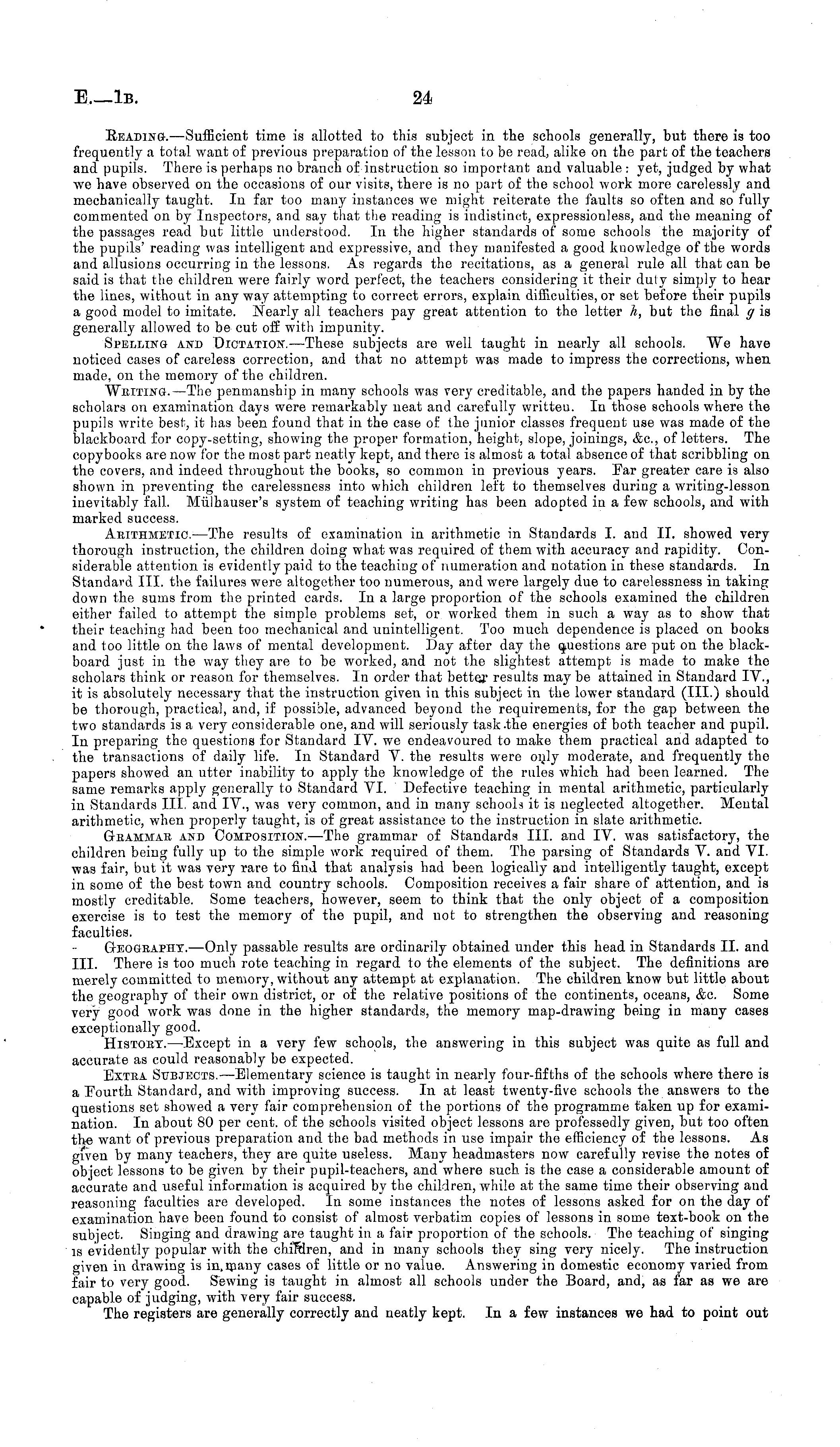 Reading.—Sufficient time is allotted to this subject in the schools generally, but there is too frequently a total want of previous preparation of the lesson to be read, alike on the part of the teachers and pupils. There is perhaps no branch of instruction so important and valuable : yet, judged by what we have observed on the occasions of our visits, there is no part of the school work more carelessly and mechanically taught. In far too many instances we might reiterate the faults so often and so fully commented on by Inspectors, and say that the reading is indistinct, expressionless, and the meaning of the passages read but little understood. In the higher standards of some schools the majority of the pupils' reading was intelligent and expressive, and they manifested a good knowledge of the words and allusions occurring in the lessons. As regards the recitations, as a general rule all that can be said is that the children were fairly word perfect, the teachers considering it their duty simply to hear the lines, without in any way attempting to correct errors, explain difficulties, or set before their pupils a good model to imitate. Nearly all teachers pay great attention to the letter h, but the final gis generally allowed to be cut off with impunity. Spelling and Dictation. —These subjects are well taught in nearly all schools. We have noticed cases of careless correction, and that no attempt was made to impress the corrections, when made, on the memory of the children. Writing.—The penmanship in many schools was very creditable, and the papers handed in by the scholars on examination days were remarkably neat and carefully written. In those schools where the pupils write best, it has been found that in the case of the junior classes frequent use was made of the blackboard for copy-setting, showing the proper formation, height, slope, joinings, &c, of letters. The copybooks are now for the most part neatly kept, and there is almost a total absence of that scribbling on the covers, and indeed throughout the books, so common in previous years. Par greater care is also shown in preventing the carelessness into which children left to themselves during a writing-lesson inevitably fall. Miilhauser's system of teaching writing has been adopted in a few schools, and with marked success. Arithmetic. —The results of examination in arithmetic in Standards I. and 11. showed very thorough instruction, the children doing what was required of them with accuracy and rapidity. Considerable attention is evidently paid to the teaching of numeration and notation in these standards. In Standard 111. the failures were altogether too numerous, and were largely due to carelessness in taking down the sums from the printed cards. In a large proportion of the schools examined the children either failed to attempt the simple problems set, or worked them in such a way as to show that their teaching had been too mechanical and unintelligent. Too much dependence is placed on books and too little on the laws of mental development. Day after day the questions are put on the blackboard just in the way they are to be worked, and not the slightest attempt is made to make the scholars think or reason for themselves. In order that better results may be attained in Standard IV., it is absolutely necessary that the instruction given in this subject in the lower standard (III.) should be thorough, practical, and, if possible, advanced beyond the requirements, for the gap between the two standards is a very considerable one, and will seriously task .the energies of both teacher and pupil. In preparing the questions for Standard IV. we endeavoured to make them practical and adapted to the transactions of daily life. In Standard V. the results were only moderate, and frequently the papers showed an utter inability to apply the knowledge of the rules which had been learned. The same remarks apply generally to Standard VI. Defective teaching in mental arithmetic, particularly in Standards 111. and IV., was very common, and in many schools it is neglected altogether. Mental arithmetic, when properly taught, is of great assistance to the instruction in slate arithmetic. Grammar and Composition.—The grammar of Standards 111. and IV. was satisfactory, the children being fully up to the simple work required of them. The parsing of Standards V. and VI. was fair, but it was very rare to find that analysis had been logically and intelligently taught, except in some of the best town and country schools. Composition receives a fair share of attention, and is mostly creditable. Some teachers, however, seem to think that the only object of a composition exercise is to test the memory of the pupil, and not to strengthen the observing and reasoning faculties. Geography.—Only passable results are ordinarily obtained under this head in Standards 11. and 111. There is too much rote teaching in regard to the elements of the subject. The definitions are merely committed to memory, without any attempt at explanation. The children know but little about the geography of their own district, or of the relative positions of the continents, oceans, &c. Some very good work was done in the higher standards, the memory map-drawing being in many cases exceptionally good. History.—Except in a very few schools, the answering in this subject was quite as full and accurate as could reasonably be expected. Extra Subjects.—Elementary science is taught in nearly four-fifths of the schools where there is a Fourth Standard, and with improving success. In at least twenty-five schools the answers to the questions set showed a very fair comprehension of the portions of the programme taken up for examination. In about 80 per cent, of the schools visited object lessons are professedly given, but too often the want of previous preparation and the bad methods in use impair the efficiency of the lessons. As given by many teachers, they are quite useless. Man