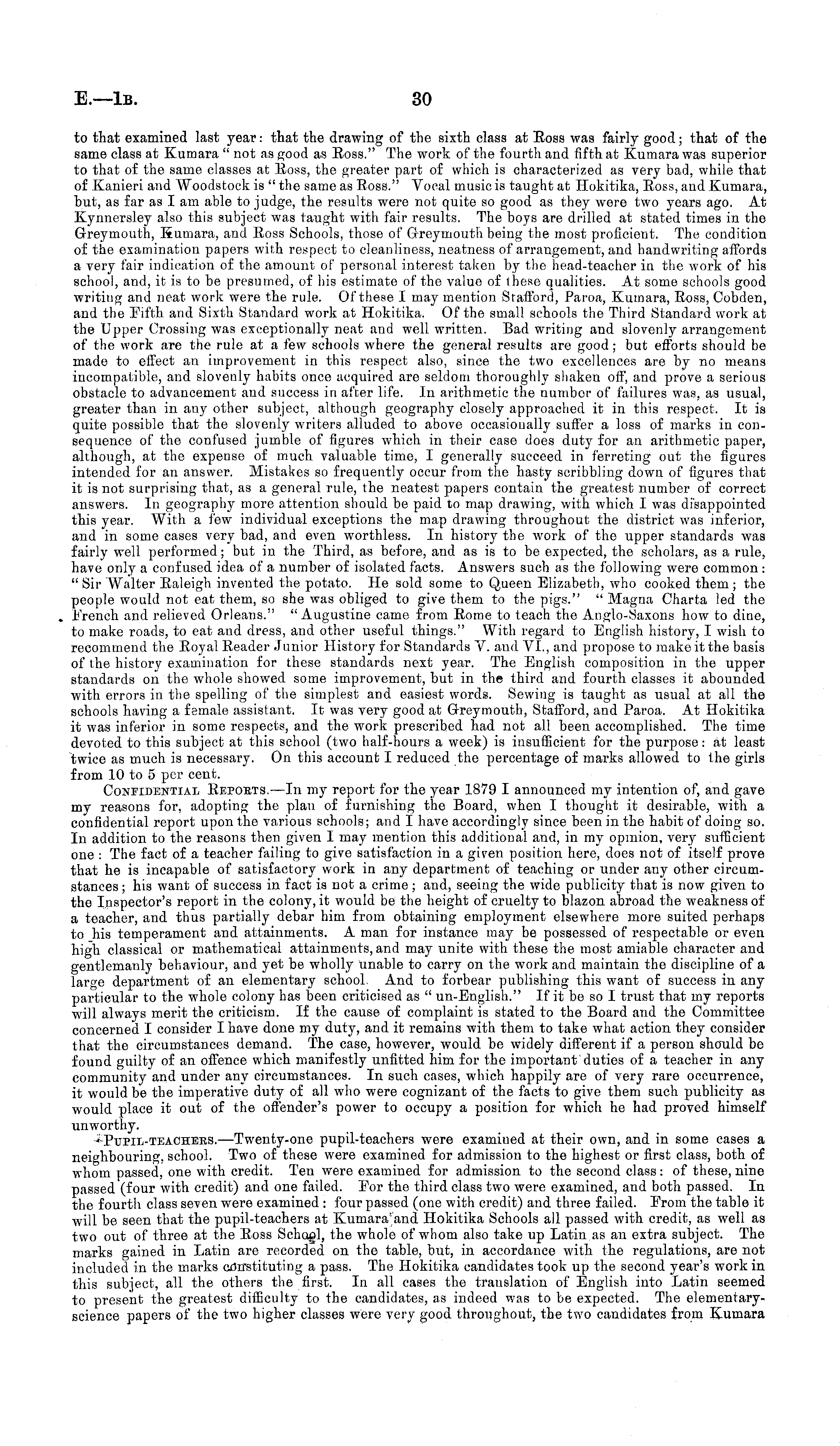to that examined last year: that the drawing of the sixth class at Ross was fairly good; that of the same class at Kumara " not as good as Ross." The work of the fourth and fifth at Kumara was superior to that of the same classes at Boss, the greater part of which is characterized as very bad, while that of Kanieri and Woodstock is " the same as Ross." Vocal music is taught at Hokitika, Ross, and Kumara, but, as far as lam able to judge, the results were not quite so good as they were two years ago. At Kynnersley also this subject was taught with fair results. The boys are drilled at stated times in the Grreymouth, Kumara, and Ross Schools, those of Grreymouth being the most proficient. The condition of the examination papers with respect to cleanliness, neatness of arrangement, and handwriting affords a very fair indication of the amount of personal interest taken by the head-teacher in the work of his school, and, it is to be presumed, of his estimate of the value of these Qualities. At some schools good writing and neat work were the rule. Of these I may mention Stafford, Paroa, Kumara, Ross, Cobden, and the Fifth and Sixth Standard work at Hokitika. Of the small schools the Third Standard work at the Upper Crossing was exceptionally neat and well written. Bad writing and slovenly arrangement of the work are the rule at a few schools where the general results are good; but efforts should be made to effect an improvement in this respect also, since the two excellences are by no means incompatible, and slovenly habits once acquired are seldom thoroughly shaken off, and prove a serious obstacle to advancement and success in after life. In arithmetic the number of failures was, as usual, greater than in any other subject, although geography closely approached it in this respect. It is quite possible that the slovenly writers alluded to above occasionally suffer a loss of marks in consequence of the confused jumble of figures which in their case does duty for an arithmetic paper, although, at the expense of much valuable time, I generally succeed in ferreting out the figures intended for an answer. Mistakes so frequently occur from the hasty scribbling down of figures that it is not surprising that, as a general rule, the neatest papers contain the greatest number of correct answers. In geography more attention should be paid to map drawing, with which I was disappointed this year. With a few individual exceptions the map drawing throughout the district was inferior, and in some cases very bad, and even worthless. In history the work of the upper standards was fairly well performed; but in the Third, as before, and as is to be expected, the scholars, as a rule, have only a confused idea of a number of isolated facts. Answers such as the following were common: "Sir Walter Raleigh invented the potato. He sold some to Queen Elizabeth, who cooked them; the people would not eat them, so she was obliged to give them to the pigs." " Magna Charta led the French and relieved Orleans." "Augustine came from Rome to teach the Anglo-Saxons how to dine, to make roads, to eat and dress, and other useful things." With regard to English history, I wish to recommend the Royal Reader Junior History for Standards Y. and VI., and propose to make it the basis of the history examination for these standards next year. The English composition in the upper standards on the whole showed some improvement, but in the third and fourth classes it abounded with errors in the spelling of the simplest and easiest words. Sewing is taught as usual at all the schools having a female assistant. It was very good at Grreymouth, Stafford, and Paroa. At Hokitika it was inferior in some respects, and the work prescribed had not all been accomplished. The time devoted to this subject at this school (two half-hours a week) is insufficient for the purpose: at least twice as much is necessary. On this account I reduced the percentage of marks allowed to the girls from 10 to 5 per cent. Confidential Repobts.—ln my report for the year 1879 I announced my intention of, and gave my reasons for, adopting the plan of furnishing the Board, when I thought it desirable, with a confidential report upon the various schools; and I have accordingly since been in the habit of doing so. In addition to the reasons then given I may mention this additional and, in my opinion, very sufficient one : The fact of a teacher failing to give satisfaction in a given position here, does not of itself prove that he is incapable of satisfactory work in any department of teaching or under any other circumstances ; his want of success in fact is not a crime; and, seeing the wide publicity that is now given to the Inspector's report in the colony, it would be the height of cruelty to blazon abroad the weakness of a teacher, and thus partially debar him from obtaining employment elsewhere more suited perhaps to his temperament and attainments. A man for instance may be possessed of respectable or even high classical or mathematical attainments, and may unite with these the most amiable character and gentlemanly behaviour, and yet be wholly unable to carry on the work and maintain the discipline of a large department of an elementary school. And to forbear publishing this want of success in any particular to the whole colony has been criticised as " un-English." If it be so I trust that my reports will always merit the criticism. If the cause of complaint is stated to the Board and the Committee concerned I consider I have done my duty, and it remains with them to take what action they consider that the circumstances demand. The case, however, would be widely different if a person should be found guilty of an offence which manifestly unfitted him for the important duties of a teacher in any community and under any circumstances. In such cases, which happily are of very rare occurrence, it would be the imperative duty of all who were cognizant of the facts to give the