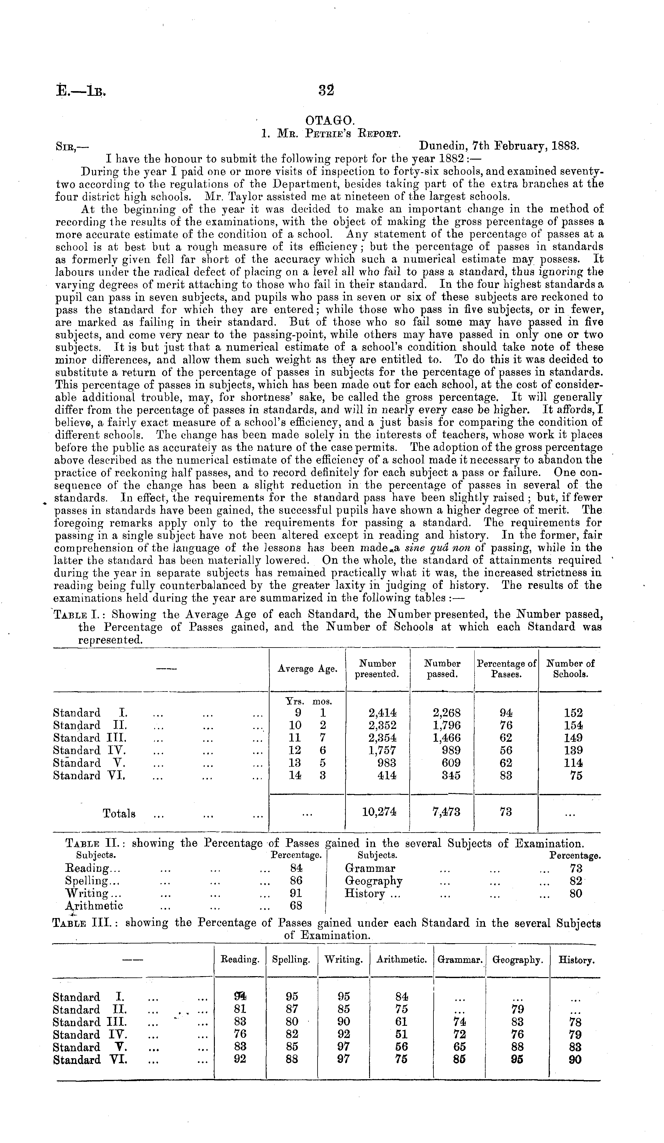 OTAGO. 1. Me. Peteie's Repobt. Sib,— Dunedin, 7th February, 1883. I have the honour to submit the following report for the year 1882: — During the year I paid one or more visits of inspection to forty-six schools, and examined seventytwo according to the regulations of the Department, besides taking part of the extra branches at the four district high schools. Mr. Taylor assisted me at nineteen of the largest schools. At the beginning of the year it was decided to make an important change in the method of recording the results of the examinations, with the object of making the gross percentage of passes a more accurate estimate of the condition of a school. Any statement of the percentage of passes at a school is at best but a rough measure of its efficiency; but the percentage of passes in standards as formerly given fell far short of the accuracy which such a numerical estimate may possess. It labours under the radical defect of placing on a level all who fail to pass a standard, thus ignoring the varying degrees of merit attaching to those who fail in their standard. In the four highest standards a pupil can pass in seven subjects, and pupils who pass in seven or six of these subjects are reckoned to pass the standard for which they are entered; while those who pass in five subjects, or in fewer, are marked as failing in their standard. But of those who so fail some may have passed in five subjects, and come very near to the passing-point, while others may have passed in only one or two subjects. It is but just that a numerical estimate of a school's condition should take note of these minor differences, and allow them such weight as they are entitled to. To do this it was decided to substitute a return of the percentage of passes in subjects for the percentage of passes in standards. This percentage of passes in subjects, which has been made out for each school, at the cost of considerable additional trouble, may, for shortness' sake, be called the gross percentage. It will generally differ from the percentage of passes in standards, and will in nearly every case be higher. It affords, I believe, a fairly exact measure of a school's efficiency, and a just basis for comparing the condition of different schools. The change has been made solely in the interests of teachers, whose work it places before the public as accurately as the nature of the case permits. The adoption of the gross percentage above described as the numerical estimate of the efficiency of a school made it necessary to abandon the practice of reckoning half passes, and to record definitely for each subject a pass or failure. One consequence of the change has been a slight reduction in the percentage of passes in several of the standards. In effect, the requirements for the standard pass have been slightly raised ; but, if fewer passes in standards have been gained, the successful pupils have shown a higher degree of merit. The foregoing remarks apply only to the requirements for passing a standard. The requirements for passing in a single subject have not been altered except in reading and history. In the former, fair comprehension of the language of the lessons has been made,a sine qua non of passing, while in the latter the standard has been materially lowered. On the whole, the standard of attainments required during the year in separate subjects has remained practically what it was, the increased strictness in reading being fully counterbalanced by the greater laxity in judging of history. The results of the examinations held during the year are summarized in the following tables : — Table I.: Showing the Average Age of each Standard, the Number presented, the Number passed, the Percentage of Passes gained, and the Number of Schools at which each Standard was represented.