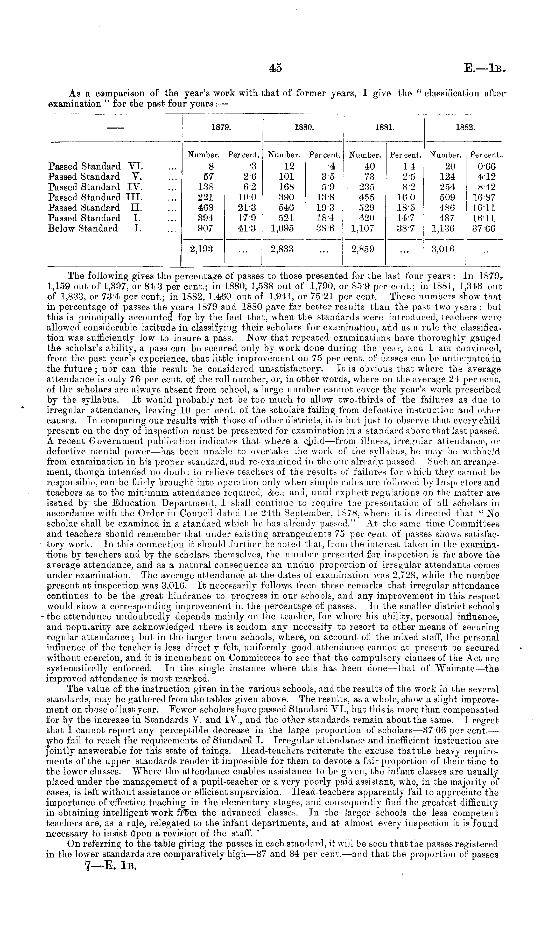 The following gives the percentage of passes to those presented for the last four years : In 1879; 1,159 out of 1,397, or 84r3 per cent.; in 1880, 1,538 out of 1,790, or 85'9 per cent-; in 1881, 1,346 out of 1,833, or 734 per cent.; in 1882, 1,460 out of 1,941, or 75'21 per cent. These numbers show that in percentage of passes the years 1879 and 1880 gave far better results than the past two years ; but this is principally accounted for by the fact that, when the standards were introduced, teachers were allowed considerable latitude in classifying their scholars for examination, and as a rule the classification was sufficiently low to insure a pass. Now that repeated examinations have thoroughly gauged the scholar's ability, a pass can be secured only by work done during the year, and I am convinced, from the past year's experience, that little improvement on 75 per cent, of passes can be anticipated in the future ; nor can this result be considered unsatisfactory. It is obvious that where the average attendance is only 76 per cent, of the roll number, or, in other words, where on the average 24 percent, of the scholars are always absent from school, a large number cannot cover the year's work prescribed by the syllabus. It would probably not be too much to allow two-thirds of the failures as duo to irregular attendance, leaving 10 per cent, of the scholars failing from defective instruction and other causes. In comparing our results with those of other districts, it is but just to observe that every child present on the day of inspection must be presented for examination in a standard above that last passed. A recent Government publication indicatts that where a cjjild—from illness, irregular attendance, or defective mental power—has been unable to overtake the work of the syllabus, he may be withheld from examination in his proper standard, and re-examined in the one already passed. Such an arrangement, though intended no doubt to relieve teachers of the results of failures for which they cannot be responsible, can be fairly brought into operation only when simple rules are followed by Inspectors and teachers as to the minimum attendance required, &c; and, until explicit regulations on the matter are issued by the Education Department, I shall continue to require the presentation of all scholars in accordance with the Order in Council dated the 24th September, 1878, where it is directed that " No scholar shall be examined in a standard which he has already passed." At the same time Committees and teachers should remember that under existing arrangements 75 per cent, of passes shows satisfactory work. In this connection it should further be noted that, from the interest taken in the examinations by teachers and by the scholars themselves, the number presented for inspection is far above the average attendance, and as a natural consequence an undue proportion of irregular attendants comes under examination. The average attendance at the dates of examination was 2,728, while the number present at inspection was 3,010. It necessarily follows from these remarks that irregular attendance continues to be the great hindrance to progress in our schools, and any improvement in this respect would show a corresponding improvement in the percentage of passes. In the smaller district schools the attendance undoubtedly depends mainly on the teacher, for where his ability, personal influence, and popularity are acknowledged there is seldom any necessity to resort to other means of securing regular attendance; but in the larger town schools, where, on account of the mixed staff, the personal influence of the teacher is less directly felt, uniformly good attendance cannot at present be secured without coercion, and it is incumbent on Committees to see that the compulsory clauses of the Act are systematically enforced. In. the single instance where this has been done—that of Waimate —the improved attendance is most marked. The value of the instruction given in the various schools, and the results of the work in the several standards, may be gathered from the tables given above. The results, as a whole, show a slight improvement on those of last year. Fewer scholars have passed Standard VI., but this is more than compensated for by the increase in Standards V. and IV., and the other standards remain about the same. I regret that I cannot report any perceptible decrease in the large proportion of scholars —37 66 per cent. —■ who fail to reach the requirements of Standard I. Irregular attendance and inefficient instruction are jointly answerable for this state of things. Head-teachers reiterate the excuse that the heavy requirements of the upper standards render it impossible for them to devote a fair proportion of their time to the lower classes. Where the attendance enables assistance to be given, the infant classes are usually placed under the management of a pupil-teacher or a very poorly paid assistant, who, in the majority of cases, is left without assistance or efficient supervision. Head-teachers apparently fail to appreciate the importance of effective teaching in the elementary stages, and consequently find the greatest difficulty in obtaining intelligent work fr&m the advanced classes. In the larger schools the less competent teachers are, as a rujej relegated to the infant departments, and at almost every inspection it is found necessary to insist Upon a revision of the staff. ' On referring to the table giving the passes in each standard, it will be seen that the passes registered in the lower standards are comparatively high—87 and 84 per cent. —and that the proportion of passes