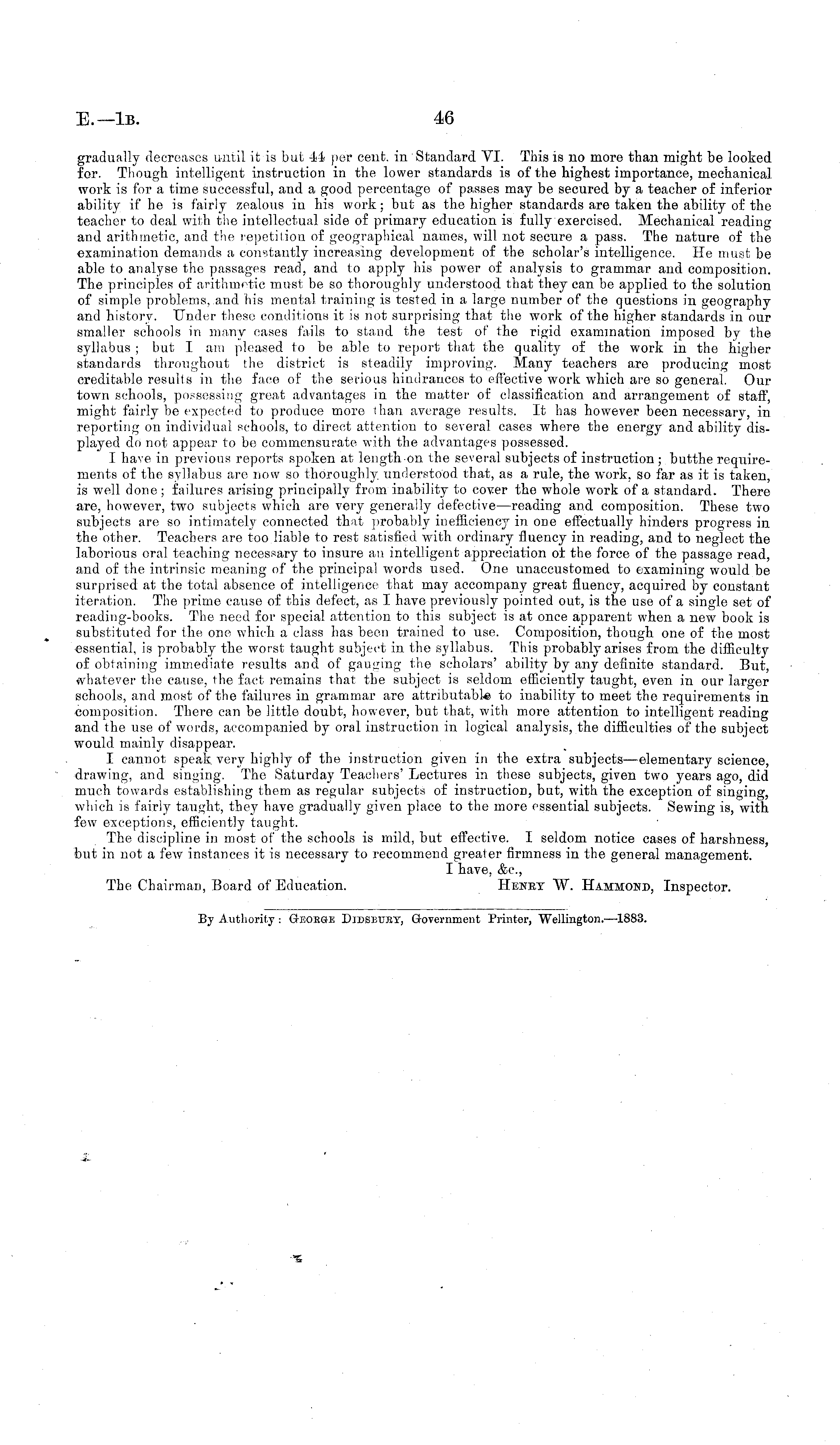 gradually decreases until it is but 4A per cent, in Standard VI. This is no more than might be looted for. Though intelligent instruction in the lower standards is of the highest importance, mechanical work is for a time successful, and a good percentage of passes may be secured by a teacher of inferior ability if he is fairly zealous in his work ; but as the higher standards are taken the ability of the teacher to deal with the intellectual side of primary education is fully exercised. Mechanical reading and arithmetic, and the repetition of geographical names, will not secure a pass. The nature of the examination demands a constantly increasing development of the scholar's intelligence. He must be able to analyse the passages read, and to apply his power of analysis to grammar and composition. The principles of arithmetic must be so thoroughly understood that they can be applied to the solution of simple problems, and his mental training is tested in a large number of the questions in geography and history. Under these conditions it is not surprising that the work of the higher standards in our smaller schools in many cases fails to stand the test of the rigid examination imposed by the syllabus ; but I am pleased to be able to report that the quality of the work in the higher standards throughout the district is steadily improving. Many teachers are producing most creditable results in the face of the serious hindrances to effective work which are so general. Our town schools, possessing great advantages in the matter of classification and arrangement of staff, might fairly be expected to produce more than average results. It has however been necessary, in reporting on individual schools, to direct attention to several cases where the energy and abilitv displayed do not appear to be commensurate with the advantages possessed. I have in previous reports spoken at length on the several subjects of instruction ; butthe requirements of the syllabus are now so thoroughly, understood that, as a rule, the work, so far as it is taken, is well done; failures arising principally from inability to cover the whole work of a standard. There are, however, two subjects which are very generally defective —reading and composition. These two subjects are so intimately connected that probably inefficiency in one effectually hinders progress in the other. Teachers are too liable to rest satisfied with ordinary fluency in reading, and to neglect the laborious oral teaching necessary to insure an intelligent appreciation ot the force of the passage read, and of the intrinsic meaning of the principal words used. One unaccustomed to examining would be surprised at the total absence of intelligence that may accompany great fluency, acquired by constant iteration. The prime cause of this defect, as I have previously pointed out, is the use of a single set of reading-books. The need for special attention to this subject is at once apparent when a new book is substituted for the one which a class has been trained to use. Composition, though one of the most essential, is probably the worst taught subject in the syllabus. This probably arises from the difficulty of obtaining immediate results and of gauging the scholars' ability by any definite standard. But, whatever the cause, the fact remains that the subject is seldom efficiently taught, even in our larger schools, and most of the failures in grammar are attributable to inability to meet the requirements in composition. There can be little doubt, however, but that, with more attention to intelligent reading and the use of words, accompanied by oral instruction in logical analysis, the difficulties of the subject would mainly disappear. I cannot speak very highly of the instruction given in the extra subjects—elementary science, drawing, and singing. The Saturday Teachers' Lectures in these subjects, given two years ago, did much towards establishing them as regular subjects of instruction, but, with the exception of singing, which is fairly taught, they have gradually given place to the more essential subjects. Sewing is, with, few exceptions, efficiently taught. The discipline in most of the schools is mild, but effective. I seldom notice cases of harshness, but in not a few instances it is necessary to recommend greater firmness in the general management. I have, &c, The Chairman, Board of Education. Henex W. Hammond, Inspector.