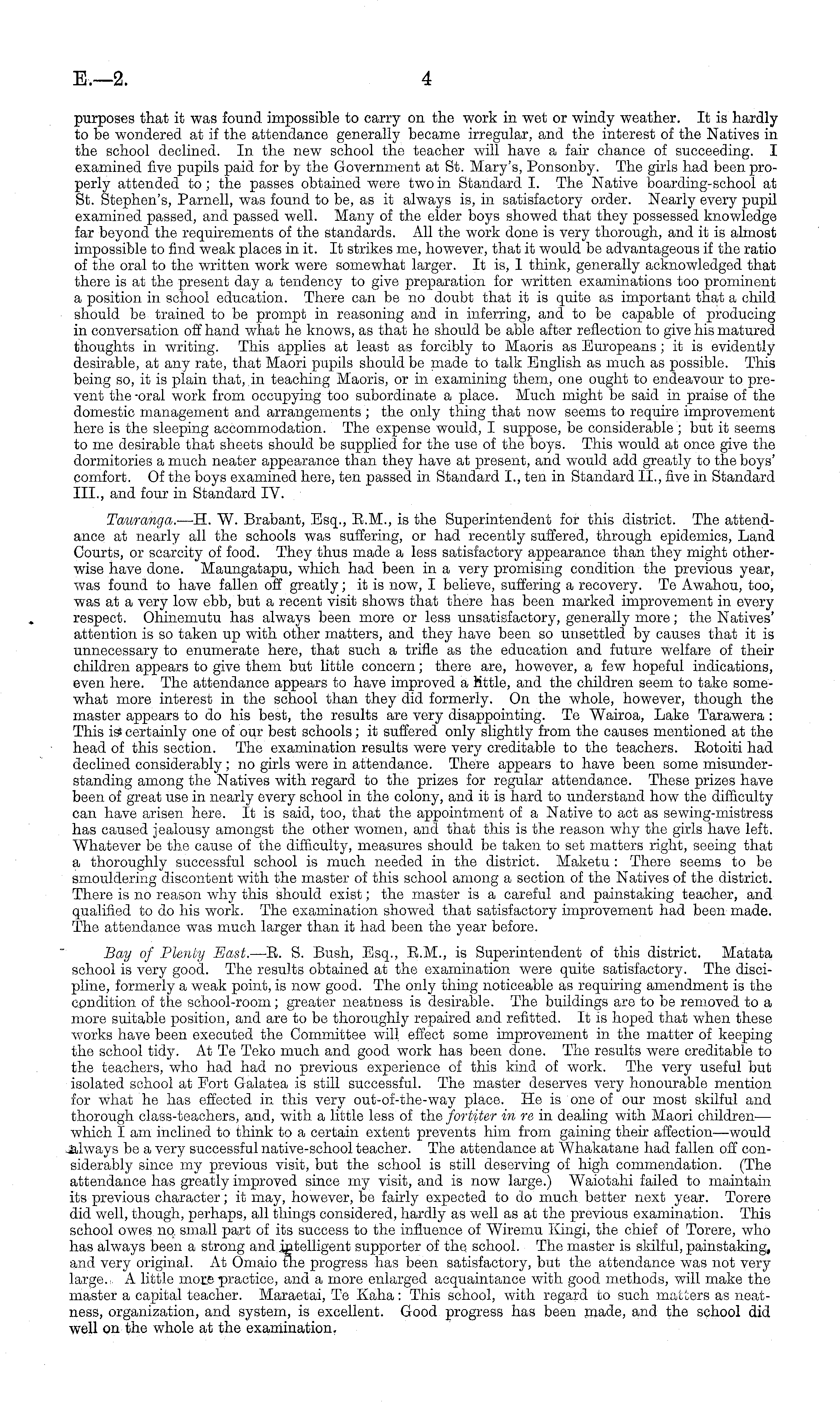 purposes that it was found impossible to carry on the work in wet or windy weather. It is hardly to be wondered at if the attendance generally became irregular, and the interest of the Natives in the school declined. In the new school the teacher will have a fair chance of succeeding. I examined five pupils paid for by the Government at St. Mary's, Ponsonby. The girls had been properly attended to ; the passes obtained were two in Standard I. The Native boarding-school at St. Stephen's, Parnell, was found to be, as it always is, in satisfactory order. Nearly every pupil examined passed, and passed well. Many of the elder boys showed that they possessed knowledge far beyond the requirements of the standards. All the work done is very thorough, and it is almost impossible to find weak places in it. It strikes me, however, that it would be advantageous if the ratio of the oral to the written work were somewhat larger. It is, I think, generally acknowledged that there is at the present day a tendency to give preparation for written examinations too prominent a position in school education. There can be no doubt that it is quite as important that a child should be trained to be prompt in reasoning and in inferring, and to be capable of producing in conversation off hand what he knows, as that he should be able after reflection to give his matured thoughts in writing. This applies at least as forcibly to Maoris as Europeans ;it is evidently desirable, at any rate, that Maori pupils should be made to talk English as much as possible. This being so, it is plain that, in teaching Maoris, or in examining them, one ought to endeavour to prevent the -oral work from occupying too subordinate a place. Much might be said in praise of the domestic management and arrangements ; the only thing that now seems to require improvement here is the sleeping accommodation. The expense would, I suppose, be considerable ; but it seems to me desirable that sheets should be supplied for the use of the boys. This would at once give the dormitories a much neater appearance than they have at present, and would add greatly to the boys' comfort. Of the boys examined here, ten passed in Standard 1., ten in Standard 11., five in Standard 111., and four in Standard IV. Tauranga. —H. W. Brabant, Esq., E.M., is the Superintendent for this district. The attendance at nearly all the schools was suffering, or had recently suffered, through epidemics, Land Courts, or scarcity of food. They thus made a less satisfactory appearance than they might otherwise have done. Maungatapu, which had been in a very promising condition the previous year, was found to have fallen off greatly; it is now, I believe, suffering a recovery. Te Awahou, too, was at a very low ebb, but a recent visit shows that there has been marked improvement in every respect. Ohinemutu has always been more or less unsatisfactory, generally more; the Natives' attention is so taken up with other matters, and they have been so unsettled by causes that it is unnecessary to enumerate here, that such a trifle as the education and future welfare of their children appears to give them but little concern; there are, however, a few hopeful indications, even here. The attendance appears to have improved a Mttle, and the children seem to take somewhat more interest in the school than they did formerly. On the whole, however, though the master appears to do his best, the results are very disappointing. Te Wairoa, Lake Tarawera : This is- certainly one of our best schools; it suffered only slightly from the causes mentioned at the head of this section. The examination results were very creditable to the teachers. Eotoiti had declined considerably ;no girls were in attendance. There appears to have been some misunderstanding among the Natives with regard to the prizes for regular attendance. These prizes have been of great use in nearly every school in the colony, and it is hard to understand how the difficulty can have arisen here. It is said, too, that the appointment of a Native to act as sewing-mistress has caused jealousy amongst the other women, and that this is the reason why the girls have left. Whatever be the cause of the difficulty, measures should be taken to set matters right, seeing that a thoroughly successful school is much needed in the district. Maketu : There seems to be smouldering discontent With the master of this school among a section of the Natives of the district. There is no reason why this should exist; the master is a careful and painstaking teacher, and qualified to do his work. The examination showed that satisfactory improvement had been made. The attendance was much larger than it had been the year before. Bay of Plenty East. —E. S. Bush, Esq., E.M., is Superintendent of this district. Matata school is very good. The results obtained at the examination were quite satisfactory. The discipline, formerly a weak point, is now good. The only thing noticeable as requiring amendment is the condition of the school-room; greater neatness is desirable. The buildings are to be removed to a more suitable position, and are to be thoroughly repaired and refitted. It is hoped that when these works have been executed the Committee will effect some improvement in the matter of keeping the school tidy. At Te Teko much and good work has been done. The results were creditable to the teachers, who had had no previous experience of this kind of work. The very useful but isolated school at Fort Galatea is still successful. The master deserves very honourable mention for what he has effected in this very out-of-the-way place. He is one of our most skilful and thorough class-teachers, and, with a little less of the for'titer in re in dealing with Maori children— which I am inclined to think to a certain extent prevents him from gaining their affection—would always be a very successful native-school teacher. The attendance at Whakatane had fallen off considerably si