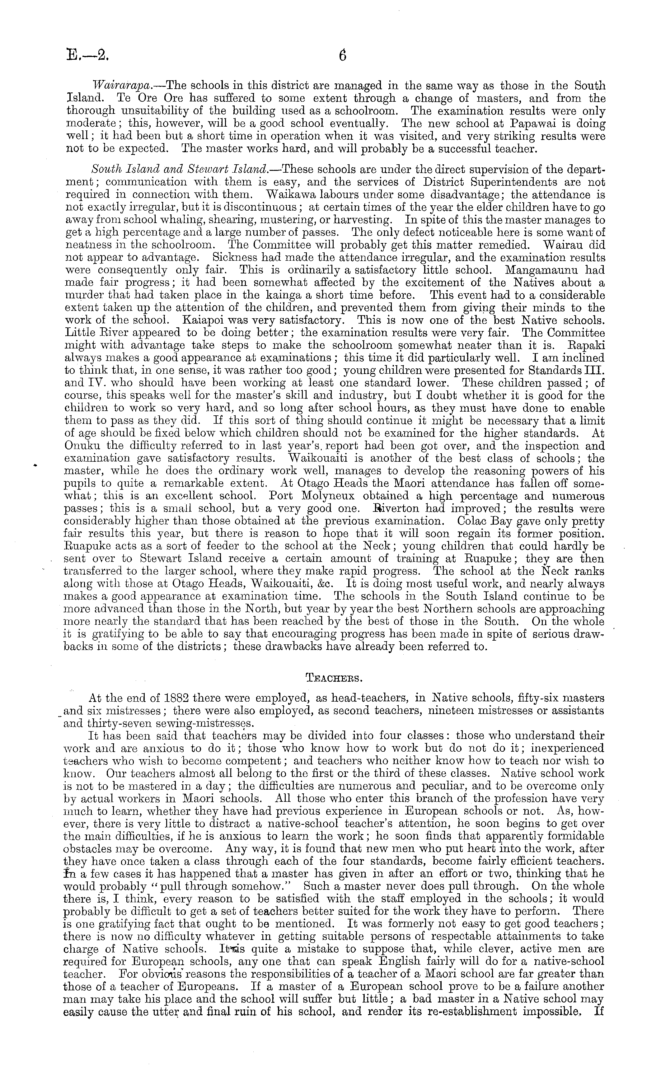 Wairarapa.— The schools in this district are managed in the same way as those in the South Island. Te Ore Ore has suffered to some extent through a change of masters, and from the thorough unsuitability of the building used as a schoolroom. The examination results were only moderate; this, however, will be a good school eventually. The new school at Papawai is doing well; it had been but a short time in operation when it was visited, and very striking results were not to be expected. The master works hard, and will probably be a successful teacher. South Island and Stewart Island. —These schools are under the direct supervision of the department ; communication with them is easy, and the services of District Superintendents are not required in connection with them. Waikawa labours under some disadvantage; the attendance is not exactly irregular, but it is discontinuous ; at certain times of the year the elder children have to go away from school whaling, shearing, mustering, or harvesting. In spite of this the master manages to get a high percentage and a large number of passes. The only defect noticeable here is some want of neatness in the schoolroom. The Committee will probably get this matter remedied. Wairau did not appear to advantage. Sickness had made the attendance irregular, and the examination results were consequently only fair. This is ordinarily a satisfactory little school. Mangamaunu had made fair progress; it had been somewhat affected by the excitement of the Natives about a murder that had taken place in the kainga a short time before. This event had to a considerable extent taken up the attention of the children, and prevented them from giving their minds to the work of the school. Kaiapoi was very satisfactory. This is now one of the best Native schools. Little Eiver appeared to be doing better; the examination results were very fair. The Committee might with advantage take steps to make the schoolroom somewhat neater than it is. Bapaki always makes a good appearance at examinations ; this time it did particularly well. lam inclined to think that, in one sense, it was rather too good; young children were presented for Standards 111. and IV. who should have been working at least one standard lower. These children passed; of course, this speaks well for the master's skill and industry, but I doubt whether it is good for the children to work so very hard, and so long after school hours, as they must have done to enable them to pass as they did. If this sort of thing should continue it might be necessary that a limit of age should be fixed below which children should not be examined for the higher standards. At Onuku the difficulty referred to in last year's report had been got over, and the inspection and examination gave satisfactory results. Waikouaiti is another of the best class of schools; the master, while he does the ordinary work well, manages to develop the reasoning powers of his pupils to quite a remarkable extent. At Otago Heads the Maori attendance has fallen off somewhat ; this is an excellent school. Port Molyneux obtained a high percentage and numerous passes; this is a small school, but a very good one. Eiverton had improved; the results were considerably higher than those obtained at the previous examination. Colac Bay gave only pretty fair results this year, but there is reason to hope that it will soon regain its former position. Euapuke acts as a sort of feeder to the school at the Neck; young children that could hardly be sent over to Stewart Island receive a certain amount of training at Euapuke; they are then transferred to the larger school, where they make rapid progress. The school at the Neck ranks along with those at Otago Heads, Waikouaiti, &c. It is doing most useful work, and nearly always makes a good appearance at examination time. The schools in the South Island continue to be more advanced than those in the North, but year by year the best Northern schools are approaching more nearly the standard that has been reached by the best of those in the South. On the whole it is gratifying to be able to say that encouraging progress has been made in spite of serious drawbacks in some of the districts; these drawbacks have already been referred to. Teachers. At the end of 1882 there were employed, as head-teachers, in Native schools, fifty-six masters and six mistresses; there were also employed, as second teachers, nineteen mistresses or assistants and thirty-seven sewing-mistresses. It has been said that teachers may be divided into four classes: those who understand their work and are anxious to do it; those who know how to work but do not do it; inexperienced teachers who wish to become competent; and teachers who neither know how to teach nor wish to know. Our teachers almost all belong to the first or the third of these classes. Native school work is not to be mastered in a day; the difficulties are numerous and peculiar, and to be overcome only by actual workers in Maori schools. All those who enter this branch of the profession have very much to learn, whether they have had previous experience in European schools or not. As, however, there is very little to distract a native-school teacher's attention, he soon begins to get over the main difficulties, if he is anxious to learn the work; he soon finds that apparently formidable obstacles may be overcome. Any way, it is found that new men who put heart into the work, after they have once taken a class through each of the four standards, become fairly efficient teachers, in a few cases it has happened that a master has given in after an effort or two, thinking that he would probably "pull through somehow." Such a master never does pull through. On the whole there is, I think, every reason to be satisfied with the staff employed in the schools; it would probably be difficult to get a set of teachers better suited for the work they have to perform. There is one gratifying fact that ough