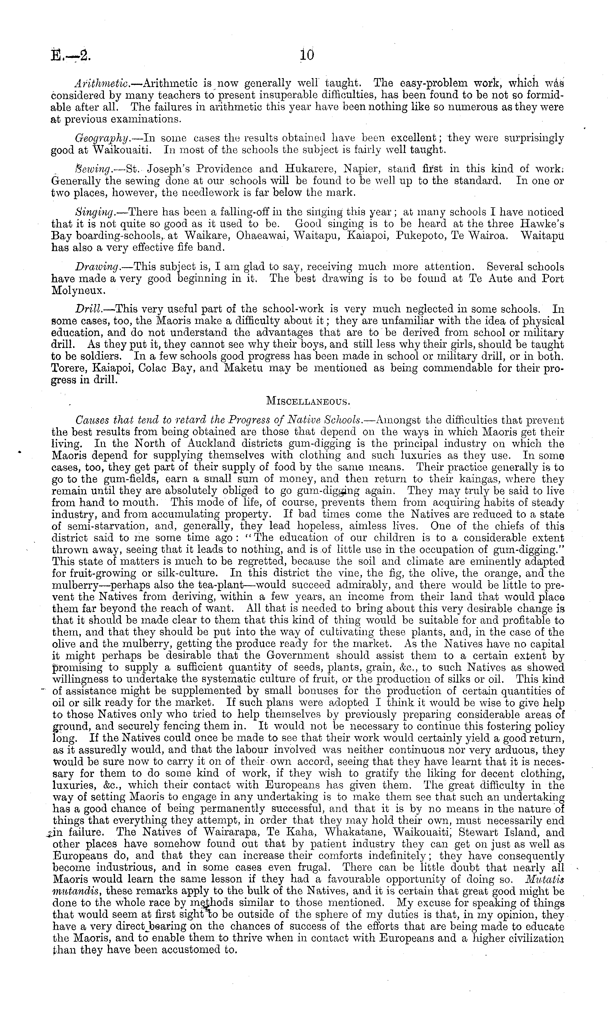 Arithmetic. —Arithmetic is now generally well taught. The easy-problem -work, which was considered by many teachers to present insuperable difficulties, has been found to be not so formidable after all. The failures in arithmetic this year have been nothing like so numerous as they were at previous examinations. Geography. —ln some cases the results obtained have been excellent; they were surprisingly good at Waikouaiti. In most of the schools the subject is fairly well taught. Hawing. —St. Joseph's Providence and Hukarere, Napier, stand first in this kind of work; Generally the sewing done at our schools will be found to be well up to the standard. In one or two places, however, the needlework is far below the mark. Singing. —There has been a falling-off in the siriging this year; at many schools I have noticed that it is not quite so good as it used to be. Good singing is to be heard at the three Hawke's Bay boarding-schools, at Waikare, Ohaeawai, Waitapu, Kaiapoi, Pukcpoto, Te Wairoa. Waitapu has also a very effective fife band. Draiuing. —This subject is, lam glad to say, receiving much more attention. Several schools have made a very good beginning in it. The best drawing is to be found at Te Aute and Port Molyneux. Drill. —This very useful part of the school-work is very much neglected in some schools. In some cases, too, the Maoris make a difficulty about it; they are unfamiliar with the idea of physical education, and do not understand the advantages that are to be derived from school or military drill. As they put it, they cannot see why their boys, and still less why their girls, should be taught to be soldiers. In a few schools good progress has been made in school or military drill, or in both. Torere, Kaiapoi, Colac Bay, and Maketu may be mentioned as being commendable for their progress in drill. Miscellaneous. Causes that tend to retard the Progress of Native Schools.— Amongst the difficulties that prevent the best results from being obtained are those that depend on the ways in which Maoris get their living. In the North of Auckland districts gum-digging is the principal industry on which the Maoris depend for supplying themselves with clothing and such luxuries as they use. In some cases, too, they get part of their supply of food by the same means. Their practice generally is to go to the gum-fields, earn a small sum of money, and then return to their kaingas, where they remain until they are absolutely obliged to go gum-digging again. They may truly be said to live from hand to mouth. This mode of life, of course, prevents them from acquiring habits of steady industry, and from accumulating property. If bad times come the Natives are reduced to a state of semi-starvation, and, generally, they lead hopeless, aimless lives. One of the chiefs of this district said to me some time ago: "The education of our children is to a considerable extent thrown away, seeing that it leads to nothing, and is of little use in the occupation of gum-digging." This state of matters is much to be regretted, because the soil and climate are eminently adapted for fruit-growing or silk-culture. In this district the vine, the fig, the olive, the orange, and the mulberry—perhaps also the tea-plant—would succeed admirably, and there would be little to prevent the Natives from deriving, within a few years, an income from their land that would place them far beyond the reach of want. All that is needed to bring about this very desirable change is that it should be made clear to them that this kind of thing would be suitable for and profitable to them, and that they should be put into the way of cultivating these plants, and, in the case of the olive and the mulberry, getting the produce ready for the market. As the Natives have no capital it might perhaps be desirable that the Government should assist them to a certain extent by promising to supply a sufficient quantity of seeds, plants, grain, &c, to such Natives as showed willingness to undertake the systematic culture of fruit, or the production of silks or oil. This kind of assistance might be supplemented by small bonuses for the production of certain quantities of oil or silk ready for the market. If such plans were adopted I think it would be wise to give help to those Natives only who tried to help themselves by previously preparing considerable areas of ground, and securely fencing them in. It would not be necessary to continue this fostering policy long. If the Natives could once be made to see that their work would certainly yield a good return, as it assuredly would, and that the labour involved was neither continuous nor very arduous, they Would be sure now to carry it on of their own accord, seeing that they have learnt that it is necessary for them to do some kind of work, if they wish to gratify the liking for decent clothing, luxuries, &c, which their contact with Europeans has given them. The great difficulty in the way of setting Maoris to engage in any undertaking is to make them see that such an undertaking has a good chance of being permanently successful, and that it is by no means in the nature of things that everything they attempt, in order that they may hold their own, must necessarily end jjn failure. The Natives of Wairarapa, Te Kaha, Whakatane, Waikouaiti, Stewart Island, and other places have somehow found out that by patient industry they can get on just as well as Europeans do, and that they can increase their comforts indefinitely; they have consequently become industrious, and in some cases even frugal. There can be little doubt that nearly all Maoris would learn the same lesson if they had a favourable opportunity of doing so. Mutatis mutandis, these remarks apply to the bulk of the Natives, and it is certain that great good might be done to the whole race by mejhods similar to those mentioned. My excuse for speaking of things that would seem at first sight '\o be outside of the sphere of my dut