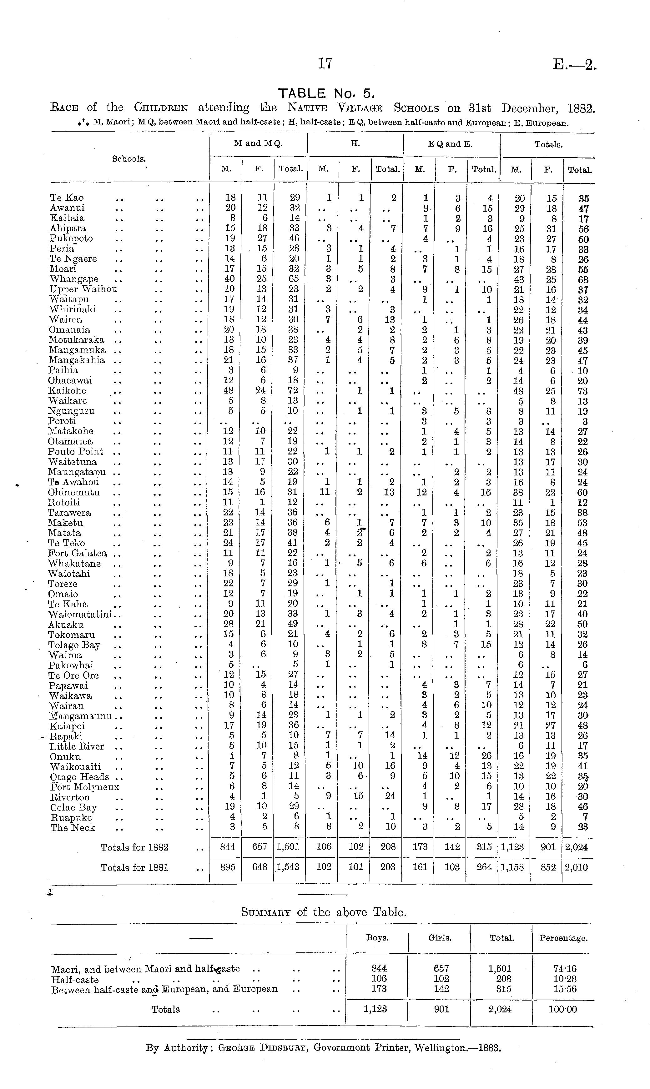 TABLE No. 5. Race of the Children attending the Native Village Schools on 31st December, 1882. M, Maori; M Q, between Maori and half-caste; H, half-caste; E Q, between half-caste and European; E, European.