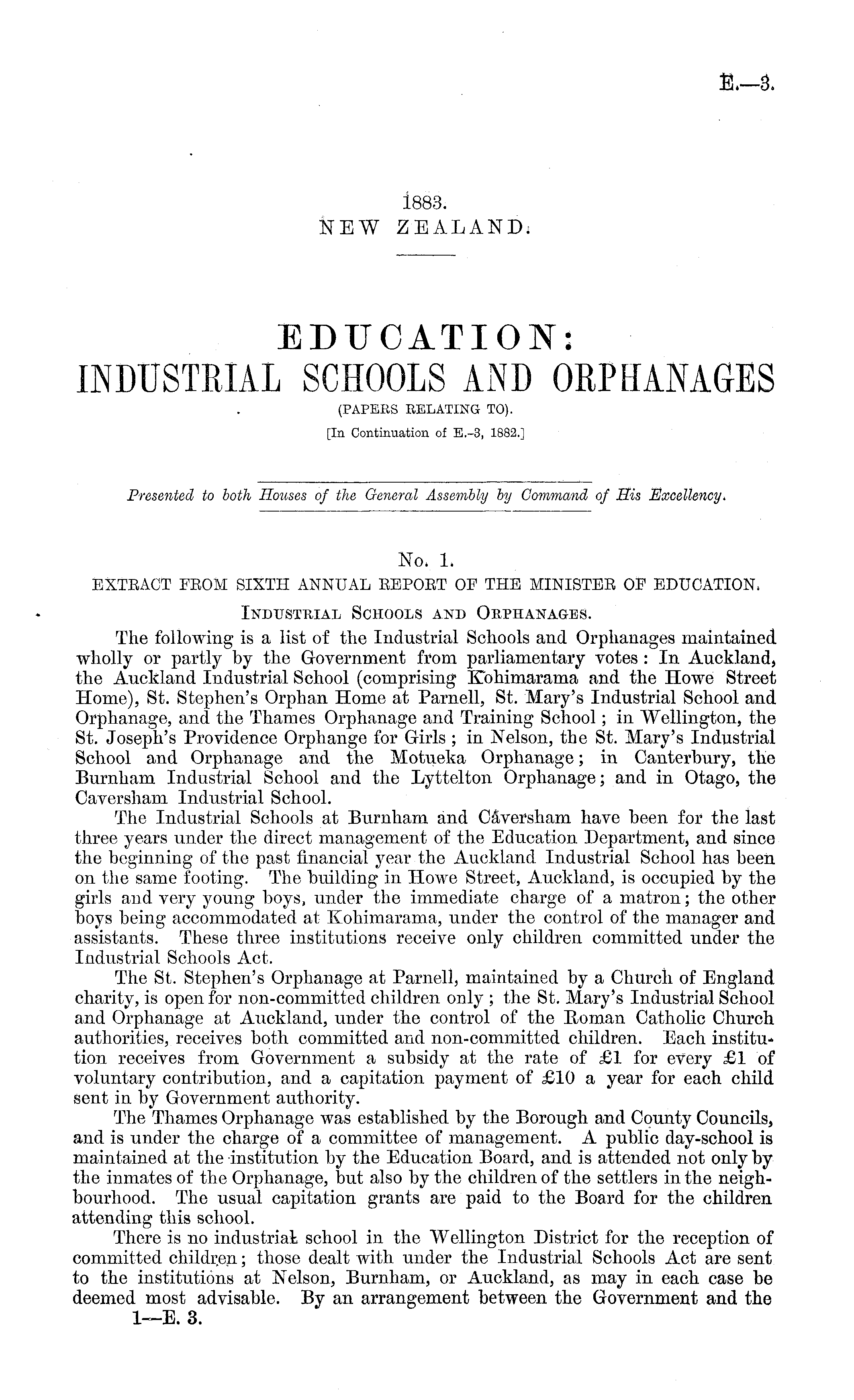 EDUCATION: INDUSTRIAL SCHOOLS AND ORPHANAGES (PAPERS RELATING TO). [In Continuation of E.-3, 1882.]