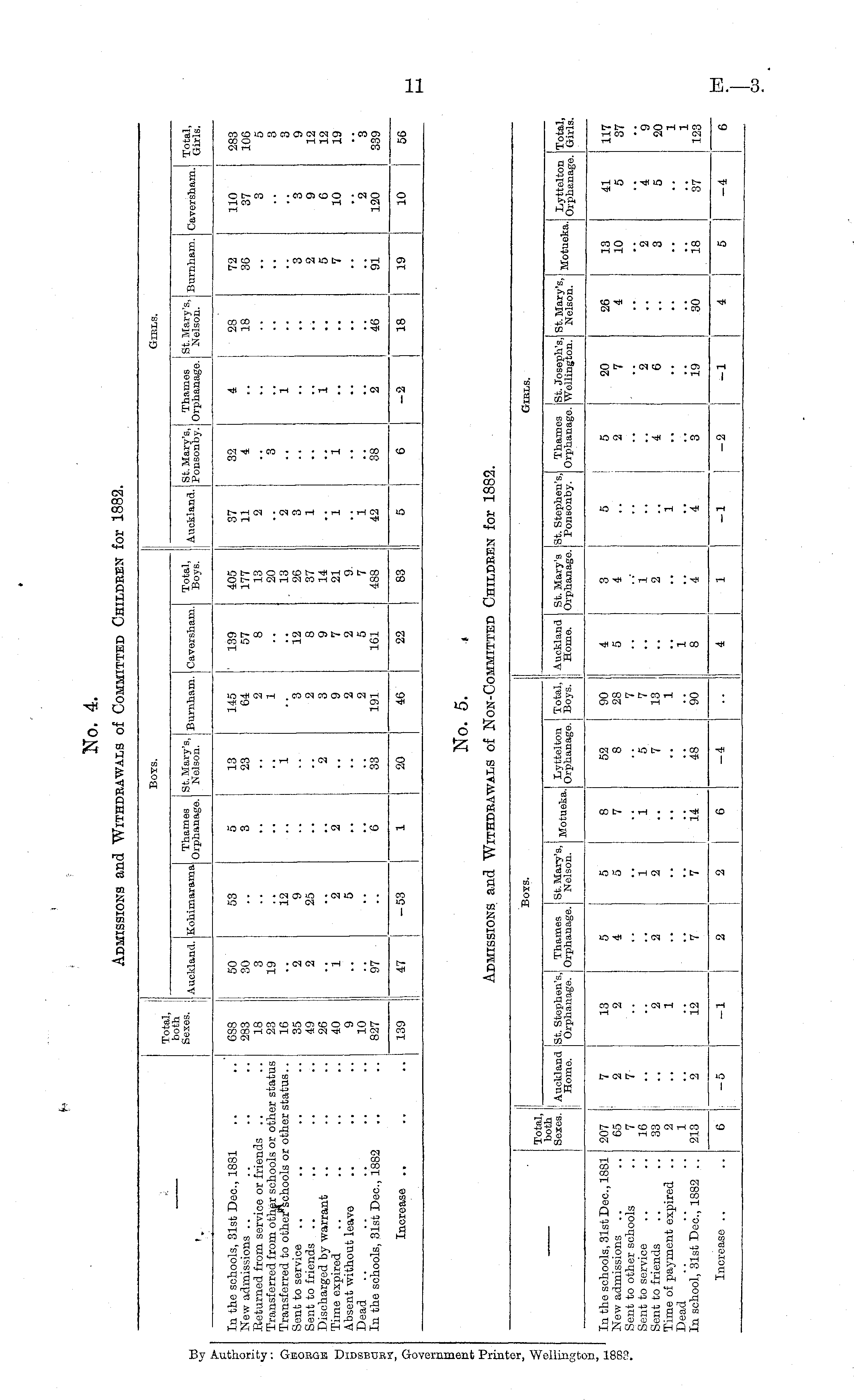 IOYS. rIELS. Total, both Sexes. Thames St. Mary's, Orphanage. Nelson. SNef orn' S' s™*«Auckland. Kohimararna! Burnham. Caversham. Total, Boys. Auckland. St. Mary's, Ponsonby. Thames Orphanage. Caversham. I Total, Girls. I, In the schools, 31st Dec, 1881 New admissions Returned from service or friends Transferred from other schools or other status Transferred to othe/schools or other status.. Sent to service Sent to friends Discharged by warrant Time expired Absent without leave Dead .. In the schools, 31st Dec, 1882 683 283 18 23 16 35 49 26 40 9 10 827 50 30 3 19 53 5 3 13 23 145 64 1 139 57 8 405 177 13 20 13 26 37 14 21 9 7 488 37 11 2 32 4 4 28 18 72 36 110 37 3 283 106 5 3 3 9 12 12 19 '3 12 9 25 i 3 2 3 9 2 2 191 2 3 1 1 2 2 12 8 9 7 2 5 161 3 2 5 7 3 9 6 10 2 '2 i i 1 i *2 5 97 G 33 1 42 38 2 46 91 '2 120 3 339 Increase ., 139 47 -53 20 46 22 83 -2 18 19 10 56