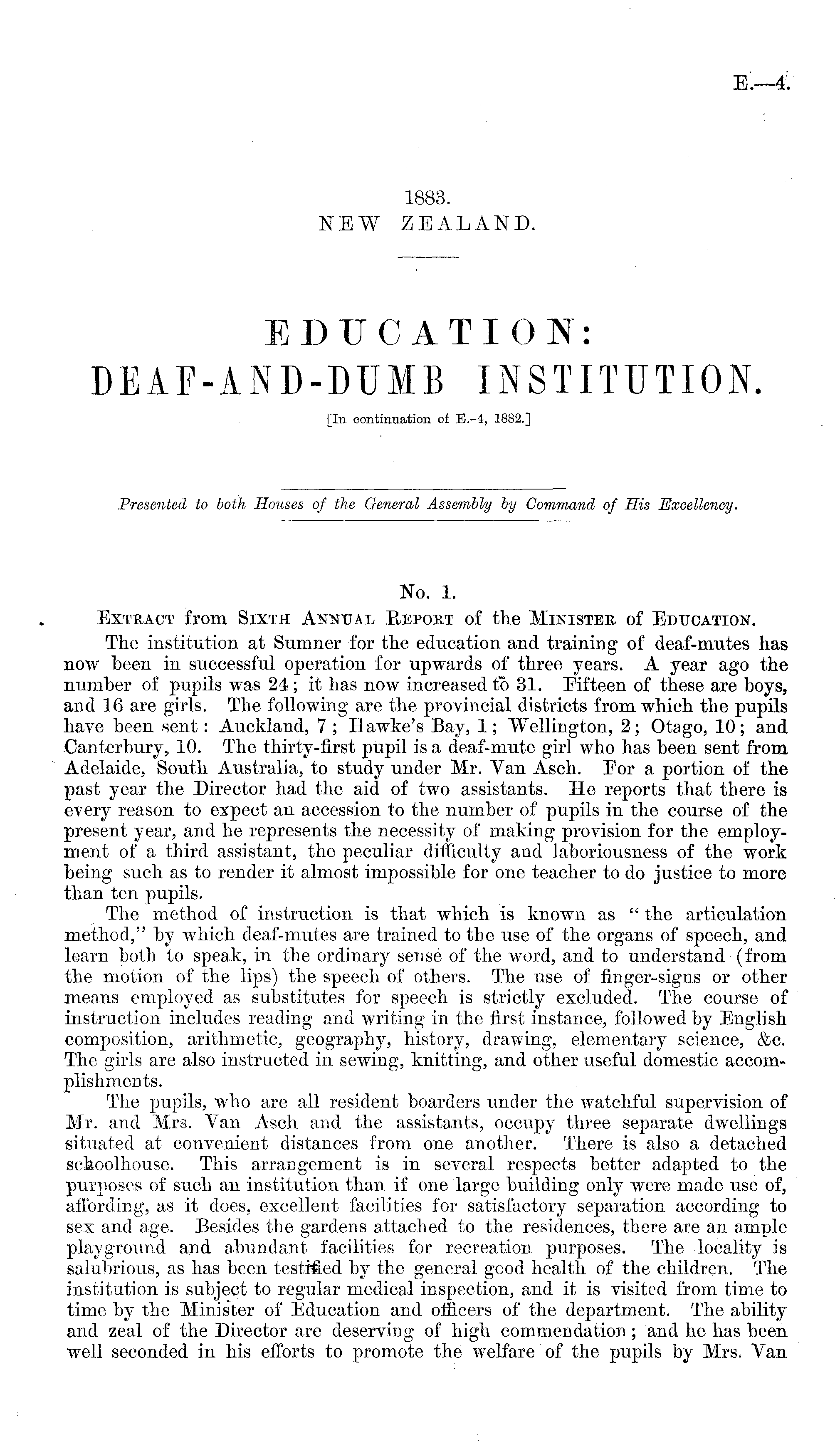 No. 1. Extract from Sixth Annual Report of the Minister of Education. The institution at Sumner for the education and training of deaf-mutes has now been in successful operation for upwards of three years. A year ago the number of pupils was 24; it has now increased to 31. Fifteen of these are boys, and 16 are girls. The following are the provincial districts from which the pupils have been sent: Auckland, 7 ; Hawke's Bay, 1; Wellington, 2; Otago, 10; and Canterbury, 10. The thirty-first pupil is a deaf-mute girl who has been sent from Adelaide, South Australia, to study under Mr. Van Asch. For a portion of the past year the Director had the aid of two assistants. He reports that there is every reason to expect an accession to the number of pupils in the course of the present year, and he represents the necessity of making provision for the employment of a third assistant, the peculiar difficulty and laboriousness of the work being such as to render it almost impossible for one teacher to do justice to more than ten pupils. The method of instruction is that which is known as "' the articulation method," by which deaf-mutes are trained to the use of the organs of speech, and learn both to speak, in the ordinary sense of the word, and to understand (from the motion of the lips) the speech of others. The use of finger-signs or other means employed as substitutes for speech is strictly excluded. The course of instruction includes reading and writing in the first instance, followed by English composition, arithmetic, geography, history, drawing, elementary science, &c. The girls are also instructed in sewing, knitting, and other useful domestic accomplishments. The pupils, who are all resident boarders under the watchful supervision of Mr. and Mrs. Van Asch and the assistants, occupy three separate dwellings situated at convenient distances from one another. There is also a detached sckoolhouse. This arrangement is in several respects better adapted to the purposes of such an institution than if one large building only were made use of, affording, as it does, excellent facilities for satisfactory separation according to sex and age. Besides the gardens attached to the residences, there are an ample playground and abundant facilities for recreation purposes. The locality is salubrious, as has been testified by the general good health of the children. The institution is subject to regular medical inspection, and it is visited from time to time by the Minister of Education and officers of the department. The ability and zeal of the Director are deserving of high commendation; and he has been well seconded in his efforts to promote the welfare of the pupils by Mrs. Van