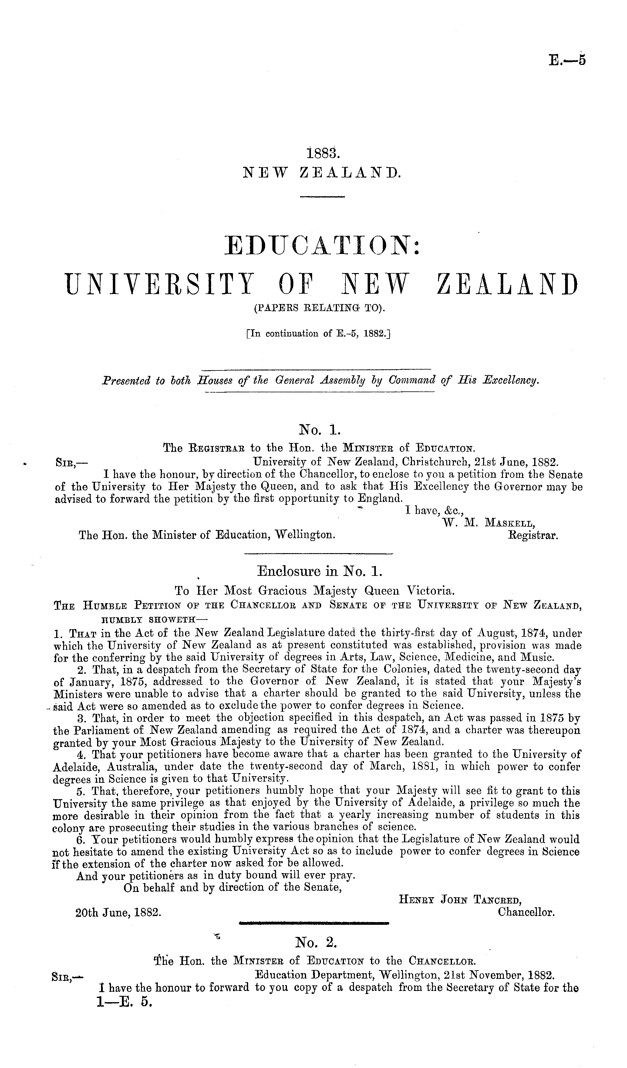 No. 1. The B/EGlsteae to the Hon. the Ministee of Education. Sic, — University of New Zealand, Christchurch, 21st June, 1882. I have the honour, by direction of the Chancellor, to enclose to you a petition from the Senate of the University to Her Majesty the Queen, and to ask that His Excellency the Governor may be advised to forward the petition by the first opportunity to England. I have, &c, W. M. Maskell, The Hon. the Minister of Education, Wellington. Eegistrar.