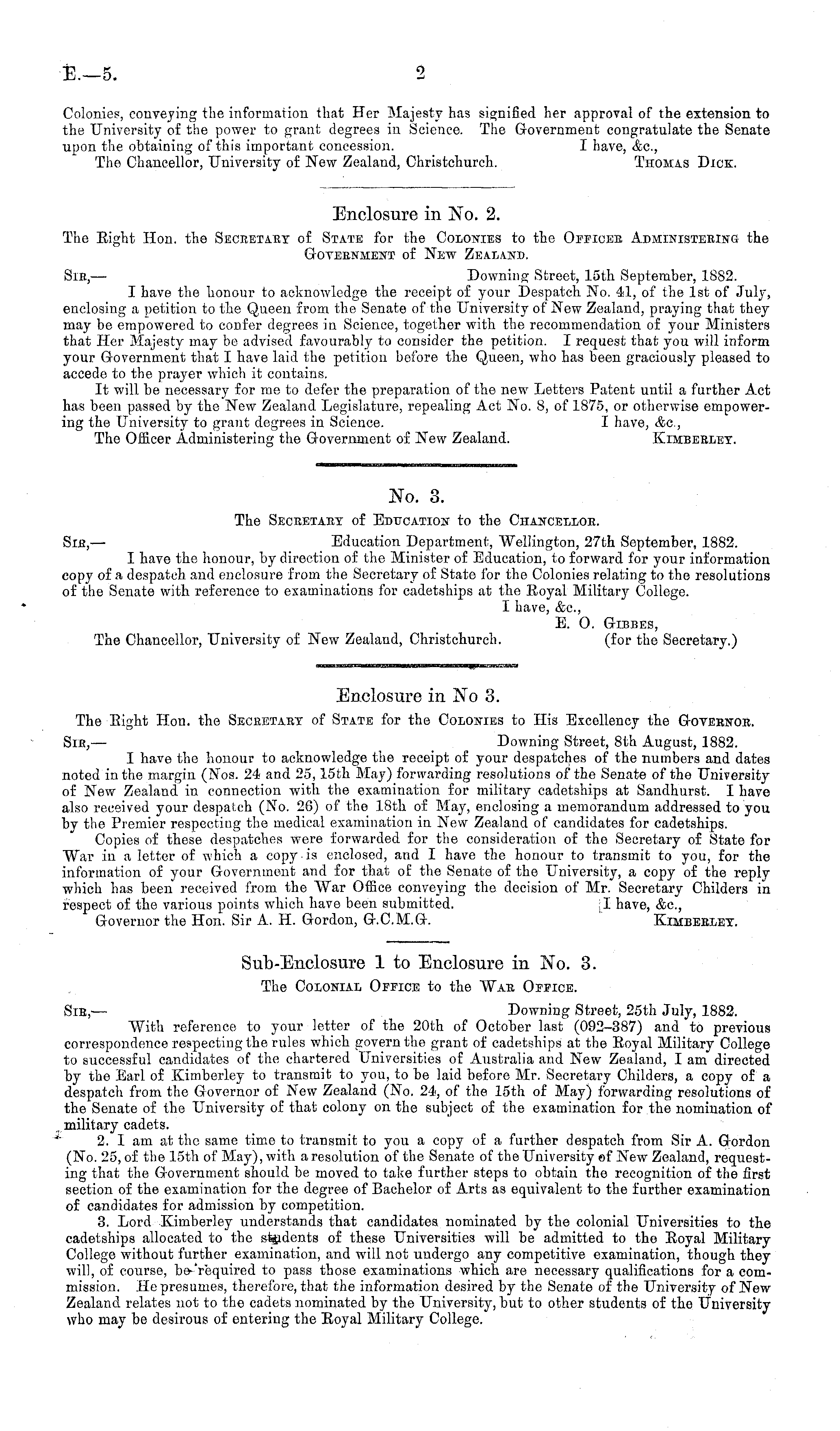 Enclosure in No 3. The Eight Hon. the Secretary of State for the Colonies to His Excellency the Governor. Sib, — Downing Street, Bth August, 1882. I have the honour to acknowledge the receipt of your despatches of the numbers and dates noted in the margin (Nos. 24 and 25,15 th May) forwarding resolutions of the Senate of the University of New Zealand in connection with the examination for military cadetships at Sandhurst. I have also received your despatch (No. 26) of tho 18th of May, enclosing a memorandum addressed to you by the Premier respecting the medical examination in New Zealand of candidates for cadetships. Copies of these despatches were forwarded for the consideration of the Secretary of State for War in a letter of which a copy is enclosed, and I have the honour to transmit to you, for the information of your Government and for that of the Senate of the University, a copy of the reply which has been received from the War Office conveying the decision of Mr. Secretary Childers in respect of the various points which have been submitted. ,'I have, <fee, Governor the Hon. Sir A. H. Gordon, G.C.M.G. Kimberley.